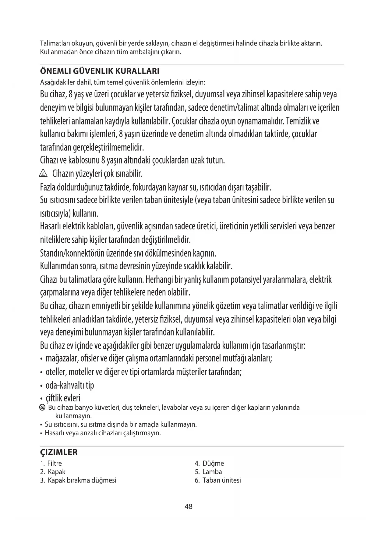 Aşağıdakiler dahil, tüm temel güvenlik önlemlerini izleyin: Bu cihaz, 8 yaş ve üzeri çocuklar ve yetersiz ziksel, duyumsal veya zihinsel kapasitelere sahip veya deneyim ve bilgisi bulunmayan kişiler tarafından, sadece denetim/talimat altında olmaları ve içerilen tehlikeleri anlamaları kaydıyla kullanılabilir. Çocuklar cihazla oyun oynamamalıdır. Temizlik ve kullanıcı bakımı işlemleri, 8 yaşın üzerinde ve denetim altında olmadıkları taktirde, çocuklar tarafından gerçekleştirilmemelidir. Cihazı ve kablosunu 8 yaşın altındaki çocuklardan uzak tutun. h Cihazın yüzeyleri çok ısınabilir. Fazla doldurduğunuz takdirde, fokurdayan kaynar su, ısıtıcıdan dışarı taşabilir. Su ısıtıcısını sadece birlikte verilen taban ünitesiyle (veya taban ünitesini sadece birlikte verilen su ısıtıcısıyla) kullanın. Hasarlı elektrik kabloları, güvenlik açısından sadece üretici, üreticinin yetkili servisleri veya benzer niteliklere sahip kişiler tarafından değiştirilmelidir. Standın/konnektörün üzerinde sıvı dökülmesinden kaçının. Kullanımdan sonra, ısıtma devresinin yüzeyinde sıcaklık kalabilir. Cihazı bu talimatlara göre kullanın. Herhangi bir yanlış kullanım potansiyel yaralanmalara, elektrik çarpmalarına veya diğer tehlikelere neden olabilir. Bu cihaz, cihazın emniyetli bir şekilde kullanımına yönelik gözetim veya talimatlar verildiği ve ilgili tehlikeleri anladıkları takdirde, yetersiz ziksel, duyumsal veya zihinsel kapasiteleri olan veya bilgi veya deneyimi bulunmayan kişiler tarafından kullanılabilir. Bu cihaz ev içinde ve aşağıdakiler gibi benzer uygulamalarda kullanım için tasarlanmıştır: