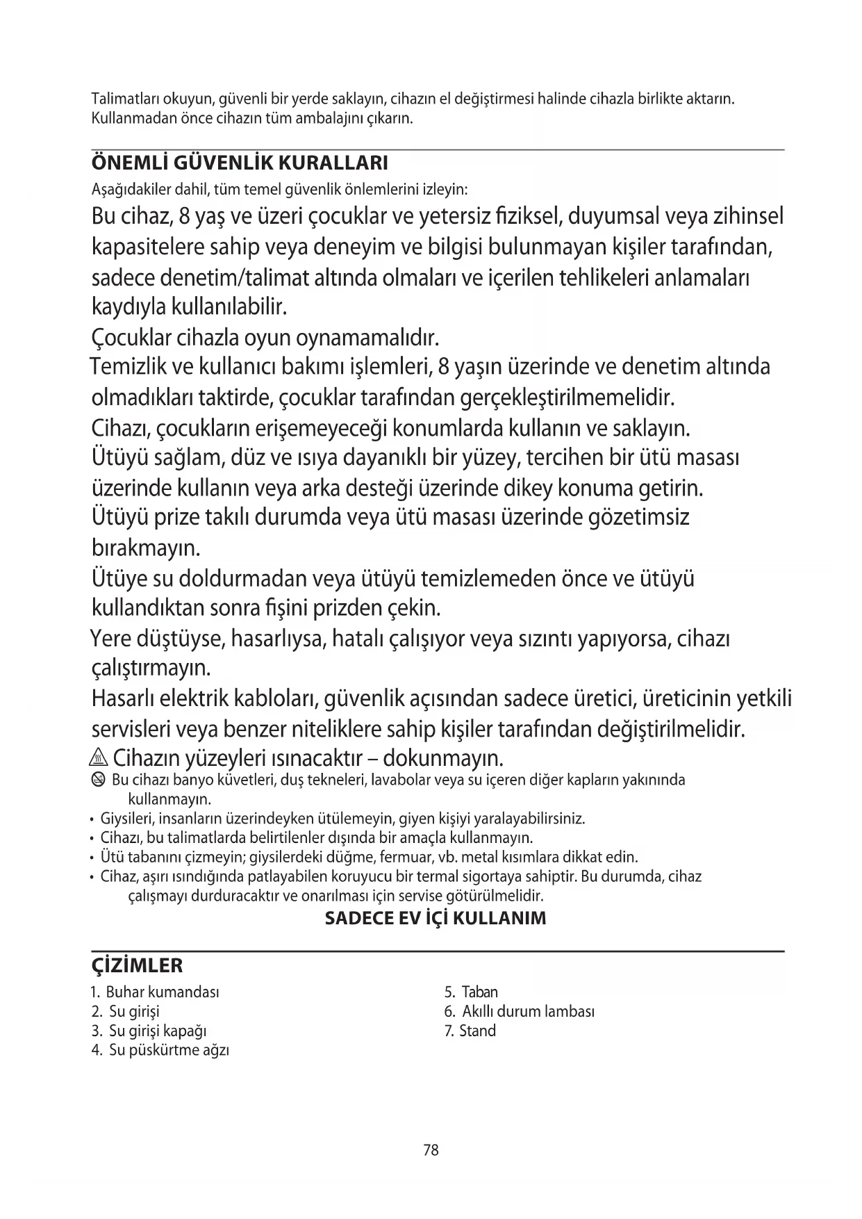 Aşağıdakiler dahil, tüm temel güvenlik önlemlerini izleyin: Bu cihaz, 8 yaş ve üzeri çocuklar ve yetersiz ziksel, duyumsal veya zihinsel kapasitelere sahip veya deneyim ve bilgisi bulunmayan kişiler tarafından, sadece denetim/talimat altında olmaları ve içerilen tehlikeleri anlamaları kaydıyla kullanılabilir. Çocuklar cihazla oyun oynamamalıdır. Temizlik ve kullanıcı bakımı işlemleri, 8 yaşın üzerinde ve denetim altında olmadıkları taktirde, çocuklar tarafından gerçekleştirilmemelidir. Cihazı, çocukların erişemeyeceği konumlarda kullanın ve saklayın. Ütüyü sağlam, düz ve ısıya dayanıklı bir yüzey, tercihen bir ütü masası üzerinde kullanın veya arka desteği üzerinde dikey konuma getirin. Ütüyü prize takılı durumda veya ütü masası üzerinde gözetimsiz bırakmayın. Ütüye su doldurmadan veya ütüyü temizlemeden önce ve ütüyü kullandıktan sonra şini prizden çekin. Yere düştüyse, hasarlıysa, hatalı çalışıyor veya sızıntı yapıyorsa, cihazı çalıştırmayın. Hasarlı elektrik kabloları, güvenlik açısından sadece üretici, üreticinin yetkili servisleri veya benzer niteliklere sahip kişiler tarafından değiştirilmelidir. h Cihazın yüzeyleri ısınacaktır – dokunmayın. b Bu cihazı banyo küvetleri, duş tekneleri, lavabolar veya su içeren diğer kapların yakınında kullanmayın.