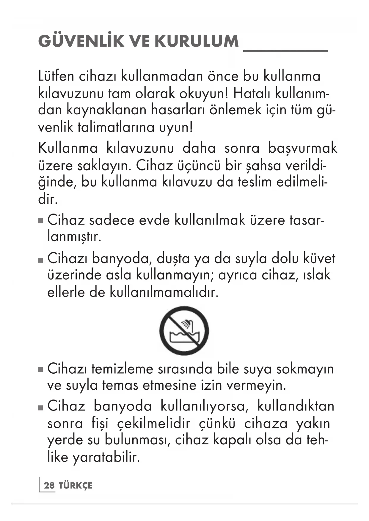 Cihazı banyoda, duşta ya da suyla dolu küvet üzerinde asla kullanmayın; ayrıca cihaz, ıslak ellerle de kullanılmamalıdır.
