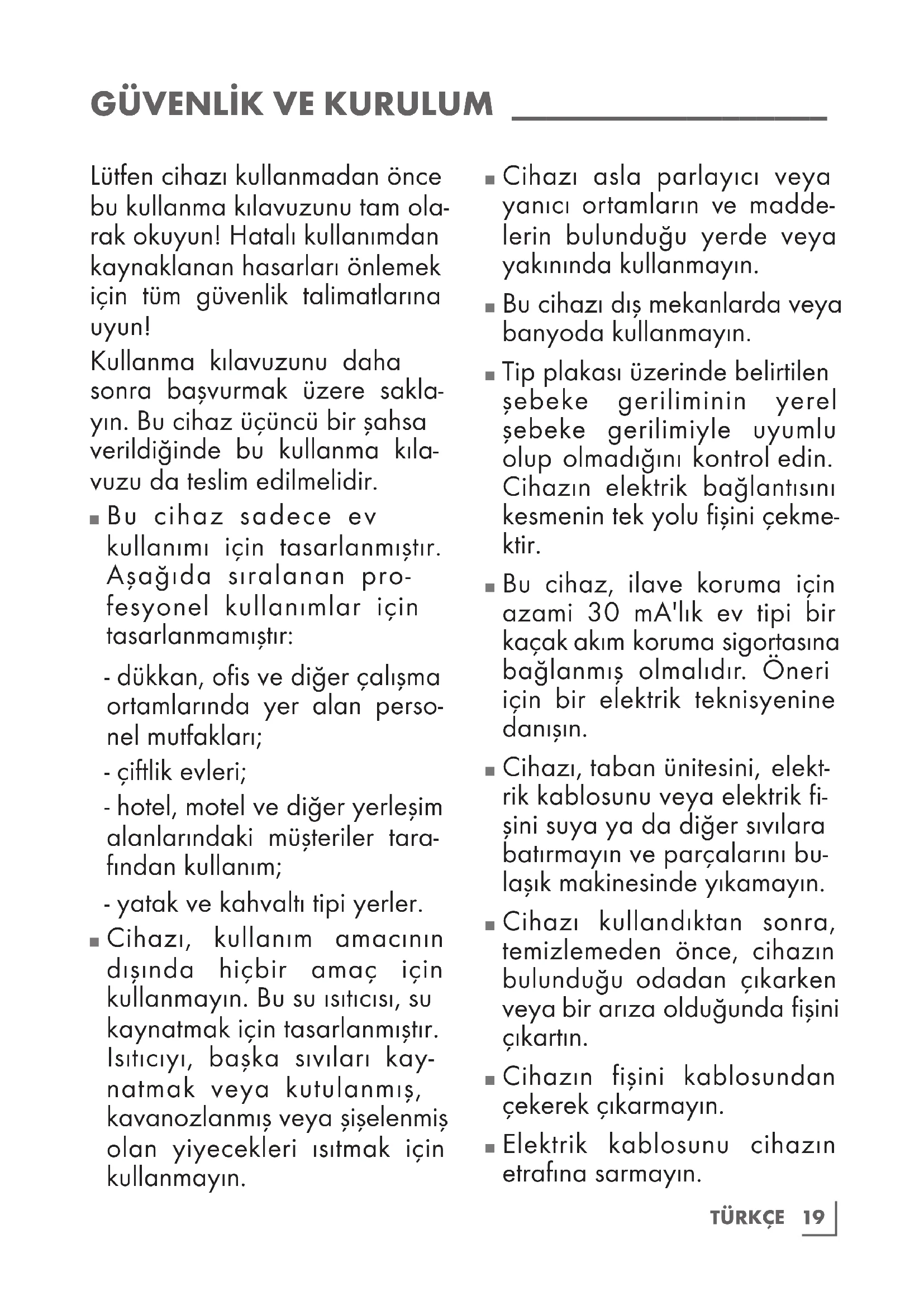 Cihazı, kullanım amacının dışında hiçbir amaç için kullanmayın. Bu su ısıtıcısı, su kaynatmak için tasarlanmıştır. Isıtıcıyı, başka sıvıları kay- natmak veya kutulanmış, kavanozlanmış veya şişelenmiş olan yiyecekleri ısıtmak için kullanmayın.