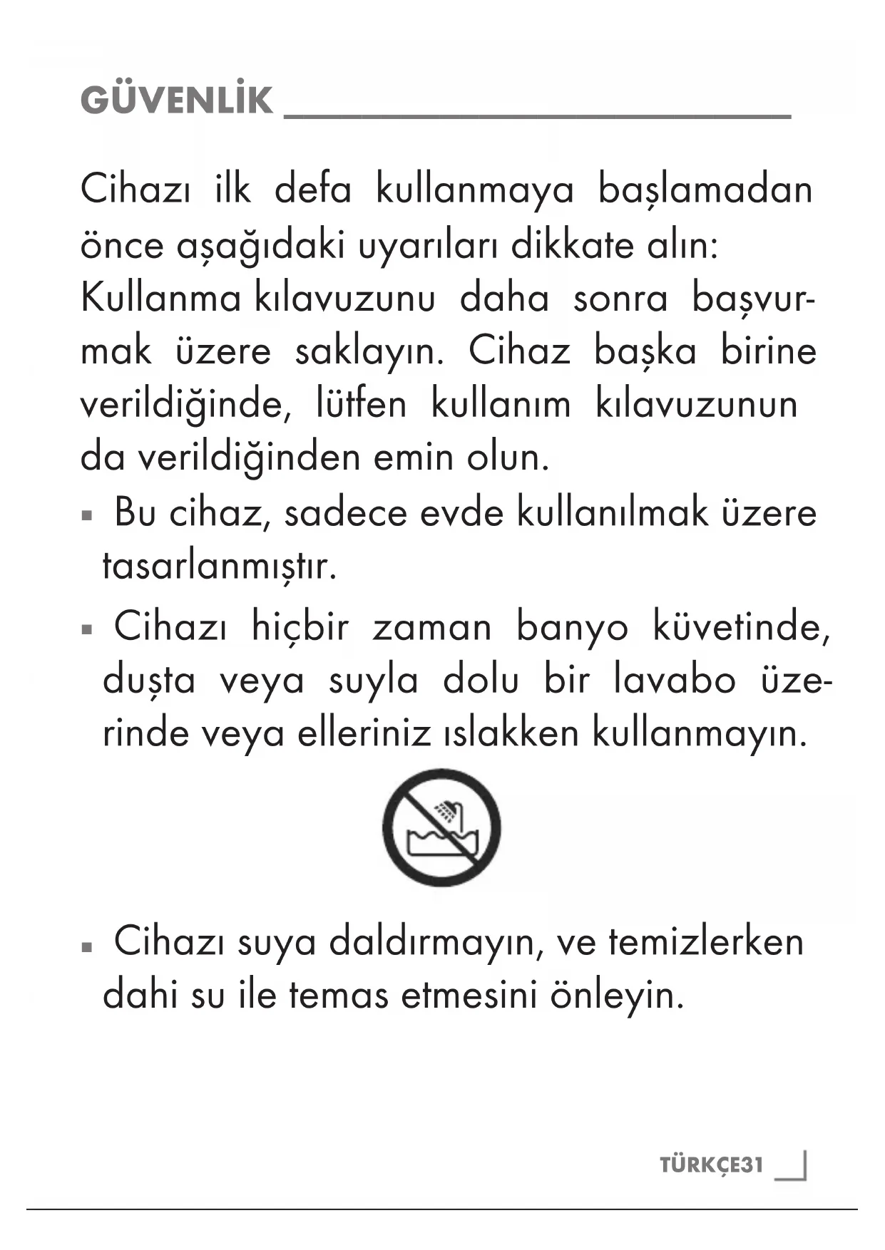 Uyarı: Bu cihaz küvet, duş teknesi ve su içeren diğer kaplara yakın yerlerde kul- lanmayın.