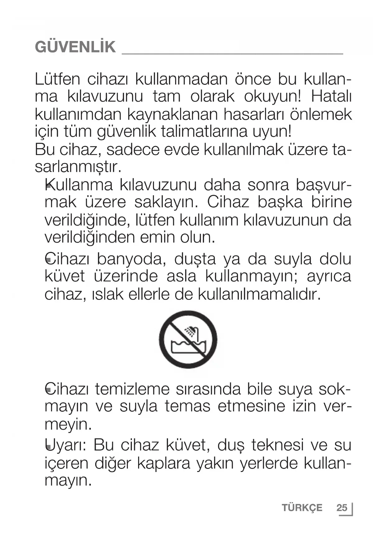 Cihazı banyoda, duşta ya da suyla dolu küvet üzerinde asla kullanmayın; ayrıca cihaz, ıslak ellerle de kullanılmamalıdır.