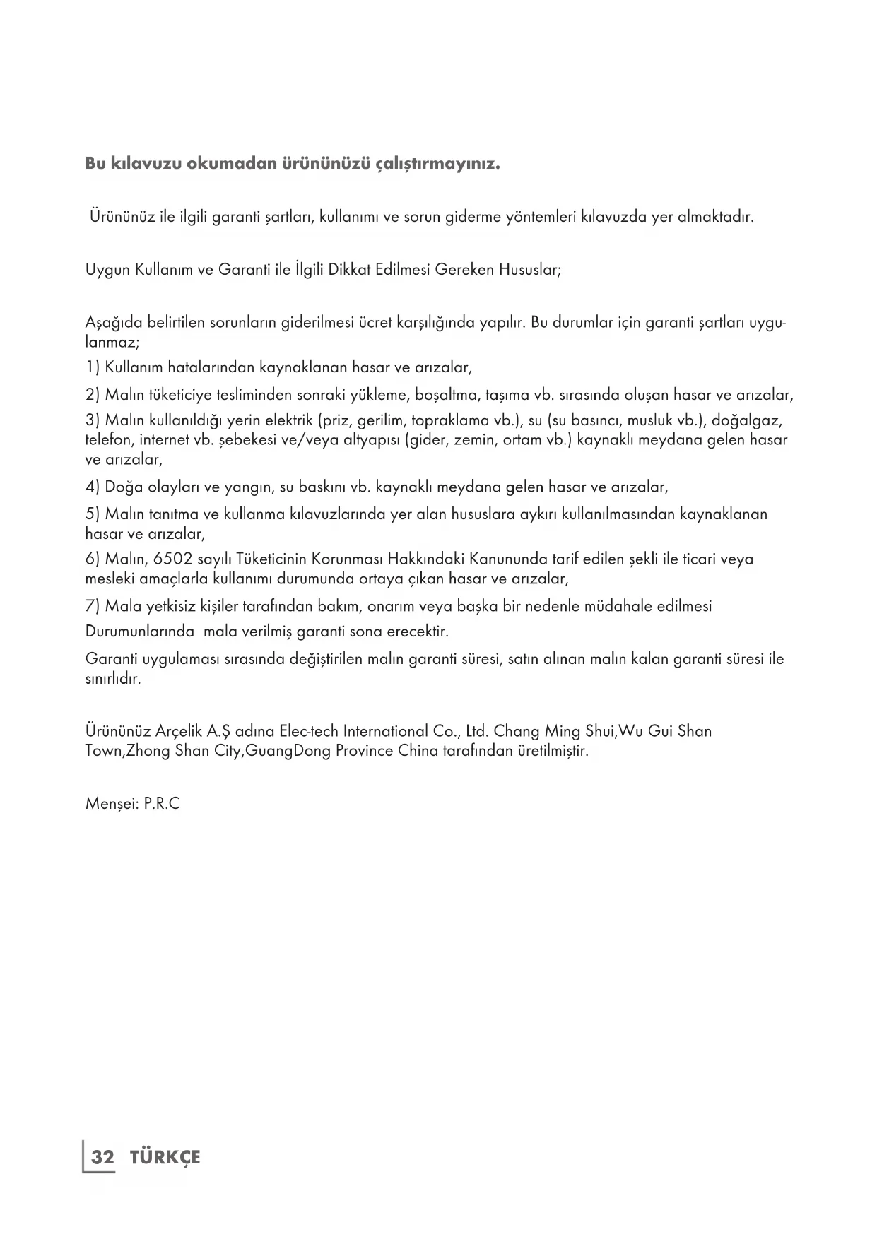 Durumunlarında mala verilmiş garanti sona erecektir. Garanti uygulaması sırasında değiştirilen malın garanti süresi, satın alınan malın kalan garanti süresi ile sınırlıdır. Ürününüz Arçelik A.Ş adına Elec-tech International Co., Ltd. Chang Ming Shui,Wu Gui Shan Town,Zhong Shan City,GuangDong Province China tarafından üretilmiştir. Menşei: P.R.C33