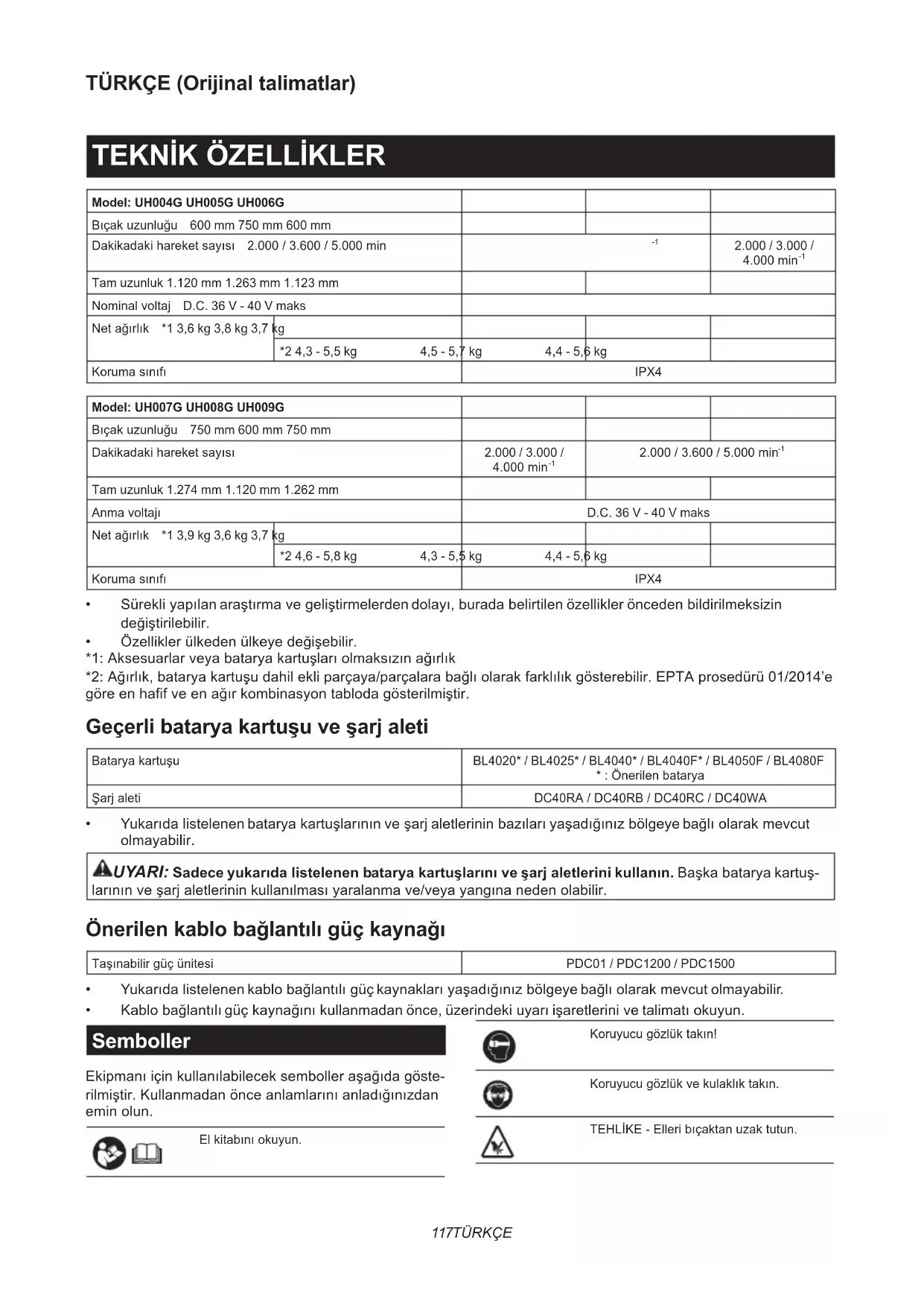 (dB(A)) Belirsizlik K (dB(A)) UH004G 88 3 98 96 2,2 UH005G 89 3 99 97 1,8 UH006G 84 3 94 92 2,2 UH007G 84 3 94 92 1,7 UH008G 85 3 95 93 2,1 UH009G 86 3 96 94 1,6 NOT:Beyanedilengürültüemisyonudeğer(ler)ibirstandarttestyöntemineuygunşekildeölçülmüştürvebiraleti birbaşkasıylakarşılaştırmakiçinkullanılabilir. NOT:Beyanedilengürültüemisyonudeğer(ler)ibirönmaruzkalmadeğerlendirmesiolarakdakullanılabilir. UYARI: Kulak koruyucuları takın. UYARI: Elektrikli aletin gerçek kullanımı sırasındaki gürültü emisyonu, aletin kullanım biçimlerine, özellikle işlenen iş parçasının türüne bağlı olarak beyan edilen değer(ler)den farklı olabilir. UYARI: Gerçek kullanım koşullarındaki tahmini maruziyeti baz alan, operatörü koruyacak güvenlik önlemlerini mutlaka belirleyin (çalışma döngüsü içerisinde aletin kapalı olduğu ve aktif durumda olmasının yanı sıra boşta çalıştığı zamanlar gibi, bütün zaman dilimleri göz önünde bulundurarak). Titreşim Titreşimtoplamdeğeri(üçeksenlivektörtoplamı)(EN62841-4-2standardınagörehesaplanan): Model Ön kol Arka kol ah (m/s