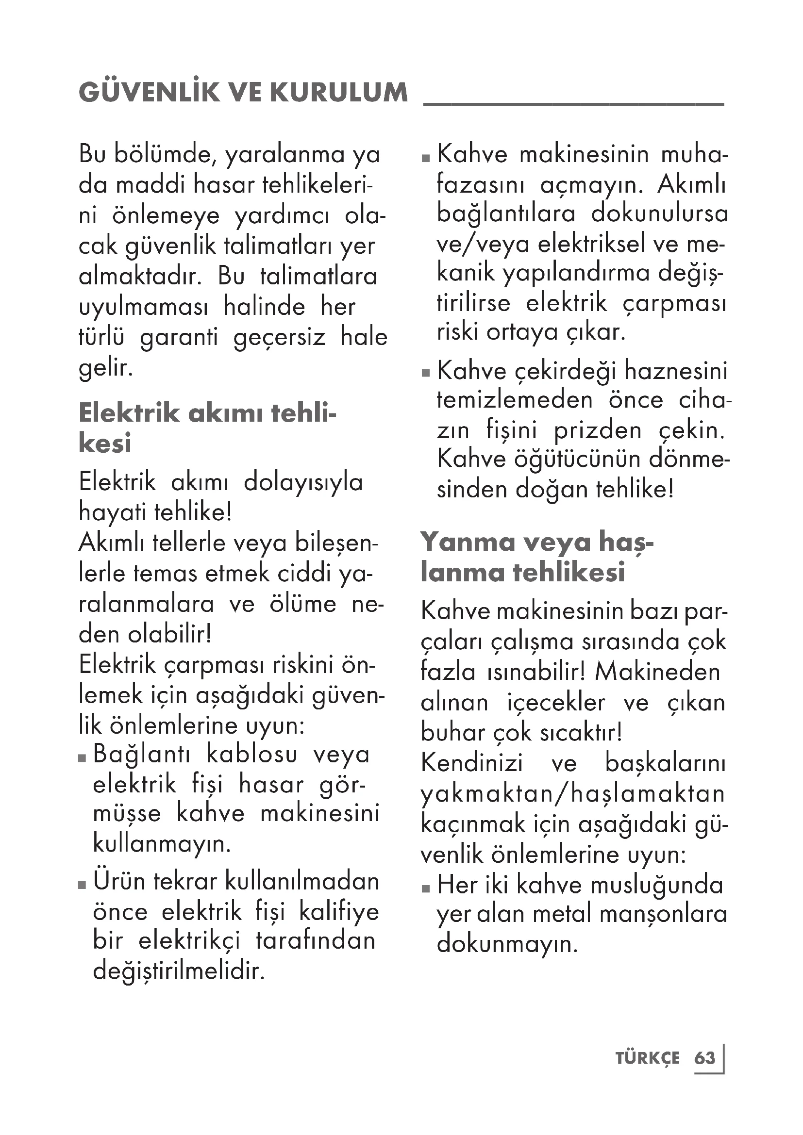 Kahve çekirdeği haznesini temizlemeden önce ciha- zın fişini prizden çekin. Kahve öğütücünün dönme- sinden doğan tehlike! Yanma veya haş- lanma tehlikesi Kahve makinesinin bazı par- çaları çalışma sırasında çok fazla ısınabilir! Makineden alınan içecekler ve çıkan buhar çok sıcaktır! Kendinizi ve başkalarını yakmaktan/haşlamaktan kaçınmak için aşağıdaki gü- venlik önlemlerine uyun: