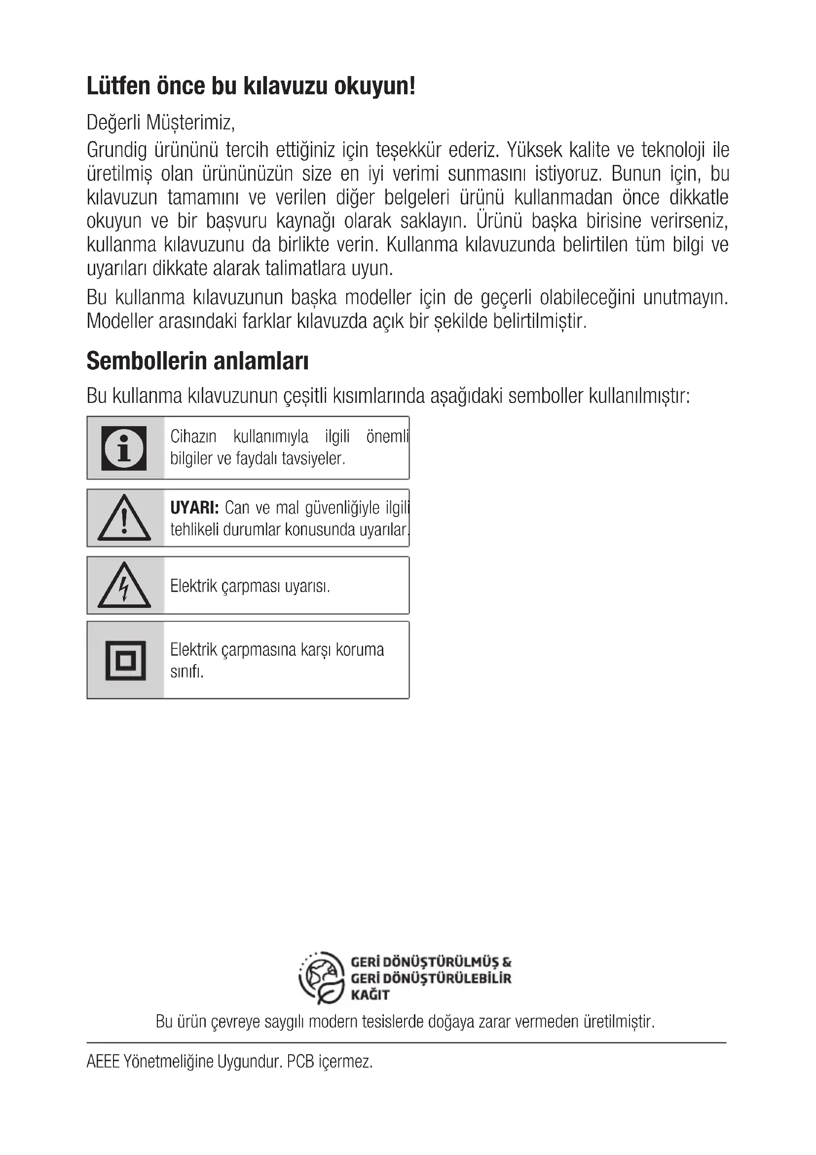 AEEE Yönetmeliğine Uyum ve Atık Ürünün Elden Çıkarılması Bu ürün T.C. Çevre ve Şehircilik Bakanlığı tarafından yayımlanan “Atık elektrikli ve Elektronik eşyaların Kontrolü Yönetmeliği’nde belirtilen zararlı ve yasaklı maddeleri içermez. AEEE Yönetmeliğine uygundur. Bu ürün, geri dönüşümlü ve tekrar kullanılabilir nitelikteki yüksek kaliteli parça ve malzemelerden üretilmiştir. Bu nedenle, ürünü, hizmet ömrünün sonunda evsel veya diğer atıklarla birlikte atmayın. Elektrikli ve elektronik cihazların geri dönüşümü için bir toplama noktasına götürün. Bu toplama noktalarını bölgenizdeki yerel yönetime sorun. Kullanılmış ürünleri geri kazanıma vererek Çevrenin ve doğal kaynakların korunmasına yardımcı olun. Ambalaj bilgisi Ürünün ambalajı, Ulusal Mevzuatımız gereği geri dönüștürülebilir malzemelerden üretilmiștir. Ambalaj atığını evsel veya diğer atıklarla birlikte atmayın, yerel otoritenin belirttiği ambalaj toplama noktalarına atın. Teknik veriler Bu cihaz yürürlükteki AB direktiflerine uygun parazit önleme sistemine sahip bir cihazdır. Bu ürün 2014/53/EU, 2009/125/EC ve 2011/65/ EU sayılı Avrupa Direktiflerine uygundur. Cihazın içini asla açmayın. Yanlış müdahalelerden kaynaklanan hasarlarda üretici hiçbir yükümlülük kabul etmeyecektir. Cihazın PDF formatındaki CE uygunluk beyanını Grundig'in www.grundig.com/downloads/doc adresindeki ana sayfasında bulabilirsiniz. Tip levhası cihazın altındadır.
