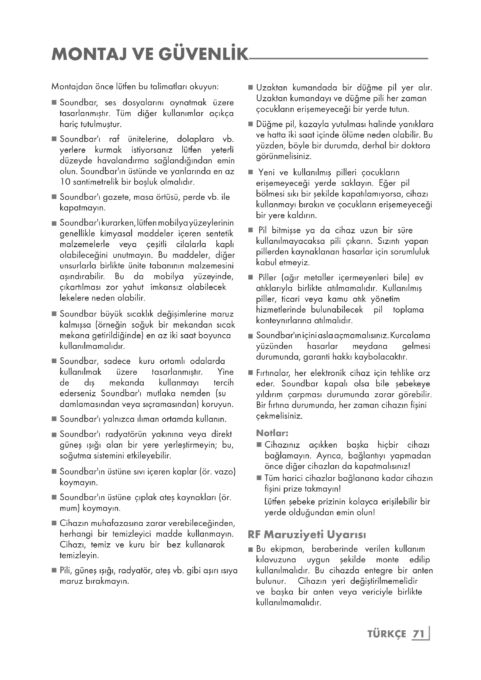 Soundbar, ses dosyalarını oynatmak üzere tasarlanmıştır. Tüm diğer kullanımlar açıkça hariç tutulmuştur.