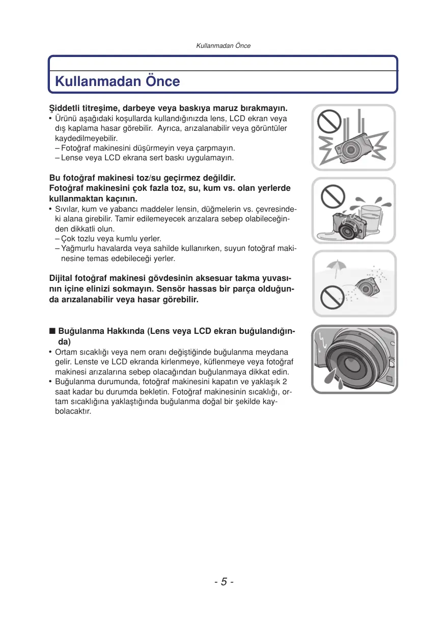 Kullanmadan Önce Kullanmadan Önce fiiddetli titreflime, darbeye veya bask›ya maruz b›rakmay›n. ∫ Ürünü afla¤›daki koflullarda kulland›¤›n›zda lens, LCD ekran veya d›fl kaplama hasar görebilir. Ayr›ca, ar›zalanabilir veya görüntüler kaydedilmeyebilir. – Foto¤raf makinesini düflürmeyin veya çarpmay›n. – Lense veya LCD ekrana sert bask› uygulamay›n. Bu foto¤raf makinesi toz/su geçirmez de¤ildir. Foto¤raf makinesini çok fazla toz, su, kum vs. olan yerlerde kullanmaktan kaç›n›n. ∫ S›v›lar, kum ve yabanc› maddeler lensin, dü¤melerin vs. çevresindeki alana girebilir. Tamir edilemeyecek ar›zalara sebep olabilece¤inden dikkatli olun. – Çok tozlu veya kumlu yerler. – Ya¤murlu havalarda veya sahilde kullan›rken, suyun foto¤raf makinesine temas edebilece¤i yerler. Dijital foto¤raf makinesi gövdesinin aksesuar takma yuvas›n›n içine elinizi sokmay›n. Sensör hassas bir parça oldu¤unda ar›zalanabilir veya hasar görebilir. n Bu¤ulanma Hakk›nda (Lens veya LCD ekran bu¤uland›¤›nda) ∫ Ortam s›cakl›¤› veya nem oran› de¤iflti¤inde bu¤ulanma meydana gelir. Lenste ve LCD ekranda kirlenmeye, küflenmeye veya foto¤raf makinesi ar›zalar›na sebep olaca¤›ndan bu¤ulanmaya dikkat edin. ∫ Bu¤ulanma durumunda, foto¤raf makinesini kapat›n ve yaklafl›k 2 saat kadar bu durumda bekletin. Foto¤raf makinesinin s›cakl›¤›, ortam s›cakl›¤›na yaklaflt›¤›nda bu¤ulanma do¤al bir flekilde kaybolacakt›r.