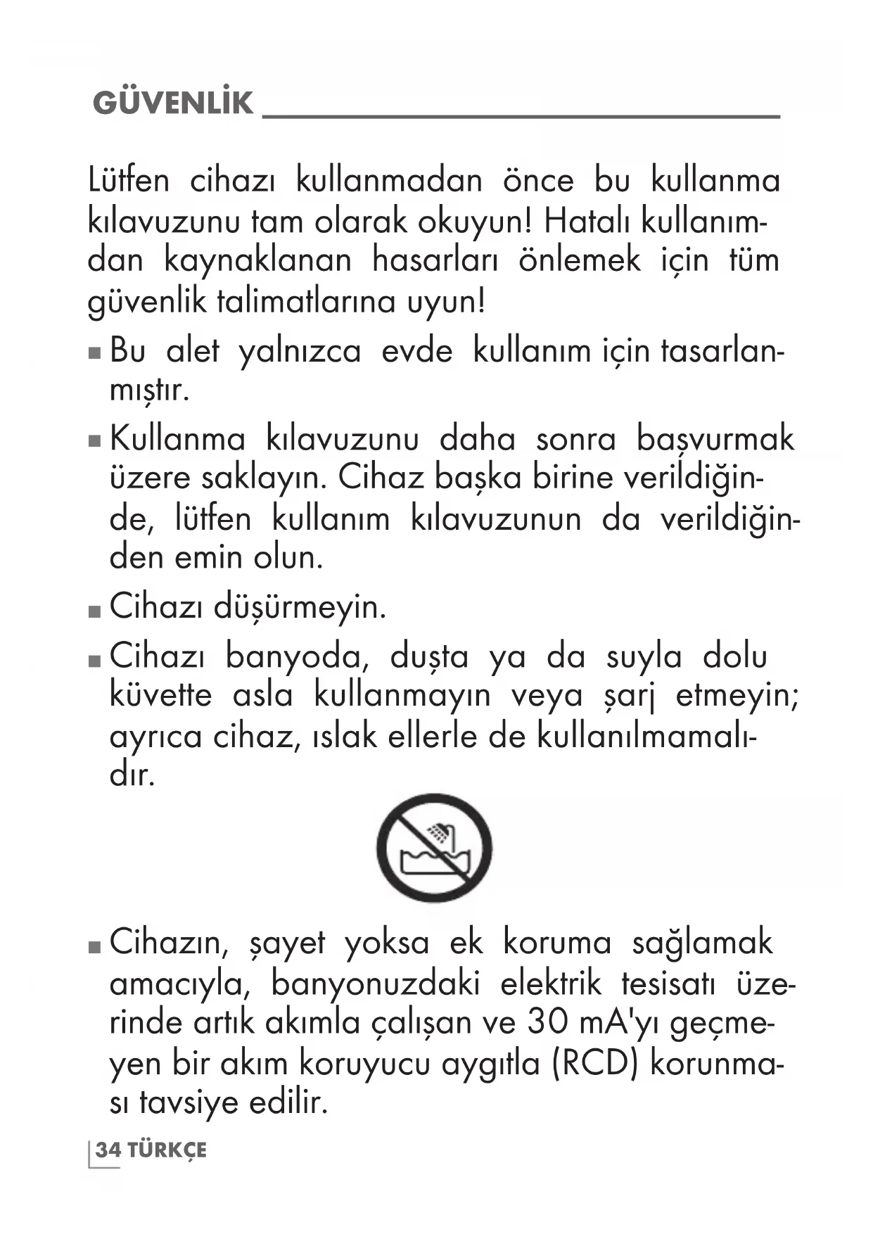 Cihazın, şayet yoksa ek koruma sağlamak amacıyla, banyonuzdaki elektrik tesisatı üze- rinde artık akımla çalışan ve 30 mA'yı geçme- yen bir akım koruyucu aygıtla (RCD) korunma- sı tavsiye edilir.35TÜRKÇE