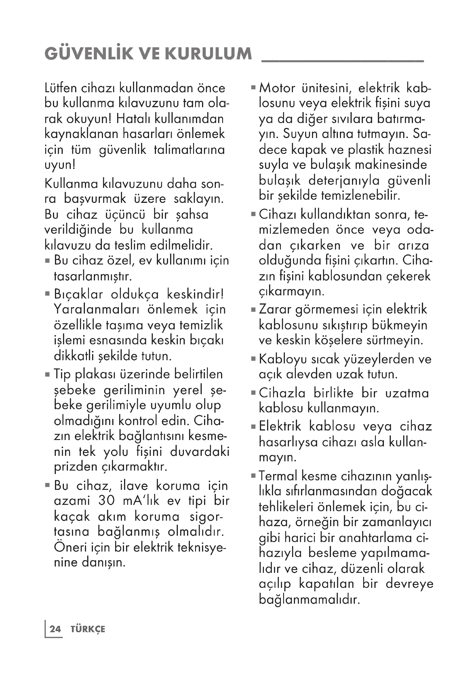 Lütfen cihazı kullanmadan önce bu kullanma kılavuzunu tam ola- rak okuyun! Hatalı kullanımdan kaynaklanan hasarları önlemek için tüm güvenlik talimatlarına uyun! Kullanma kılavuzunu daha son- ra başvurmak üzere saklayın. Bu cihaz üçüncü bir şahsa verildiğinde bu kullanma kılavuzu da teslim edilmelidir.