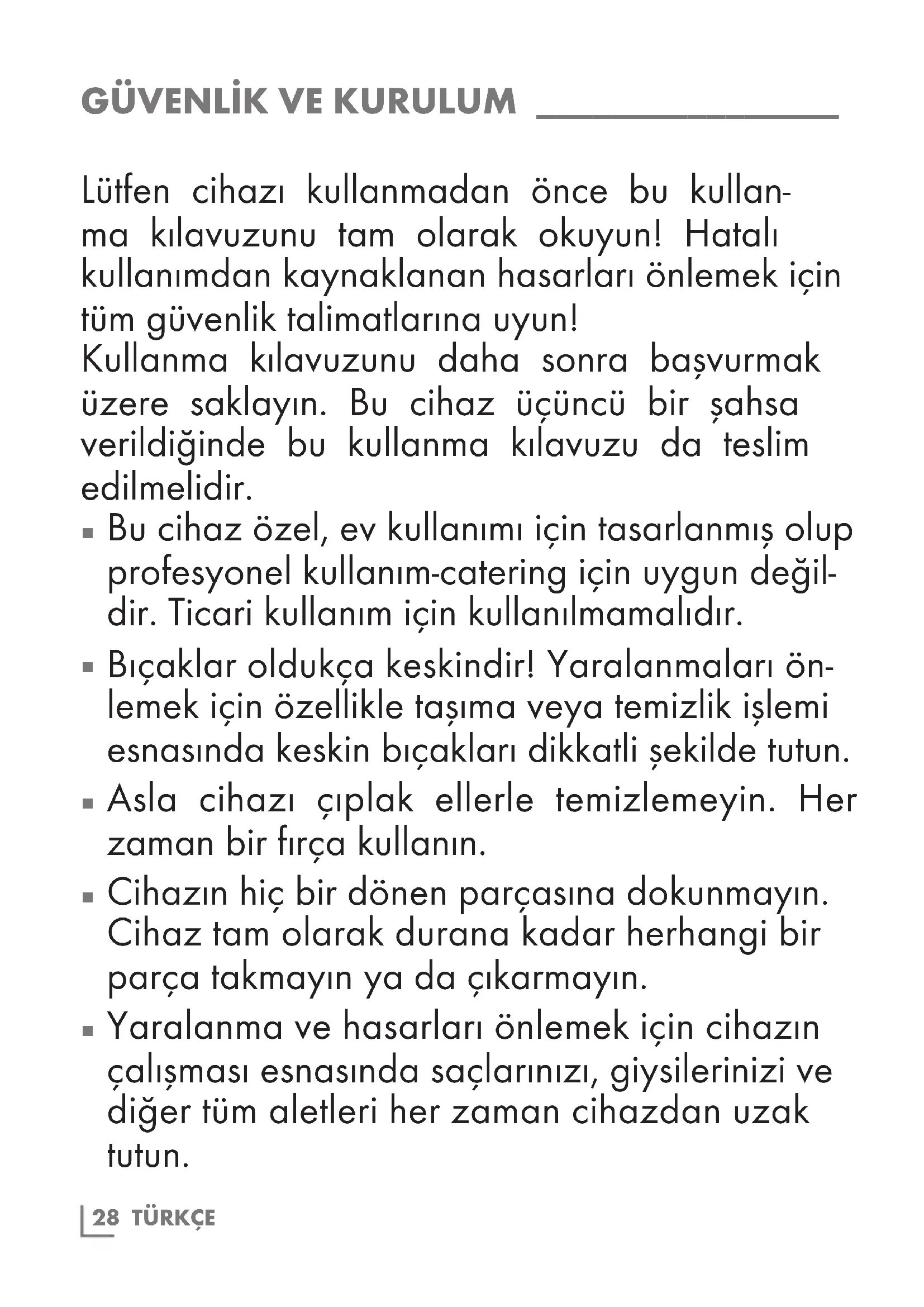 Lütfen cihazı kullanmadan önce bu kullan- ma kılavuzunu tam olarak okuyun! Hatalı kullanımdan kaynaklanan hasarları önlemek için tüm güvenlik talimatlarına uyun! Kullanma kılavuzunu daha sonra başvurmak üzere saklayın. Bu cihaz üçüncü bir şahsa verildiğinde bu kullanma kılavuzu da teslim edilmelidir.