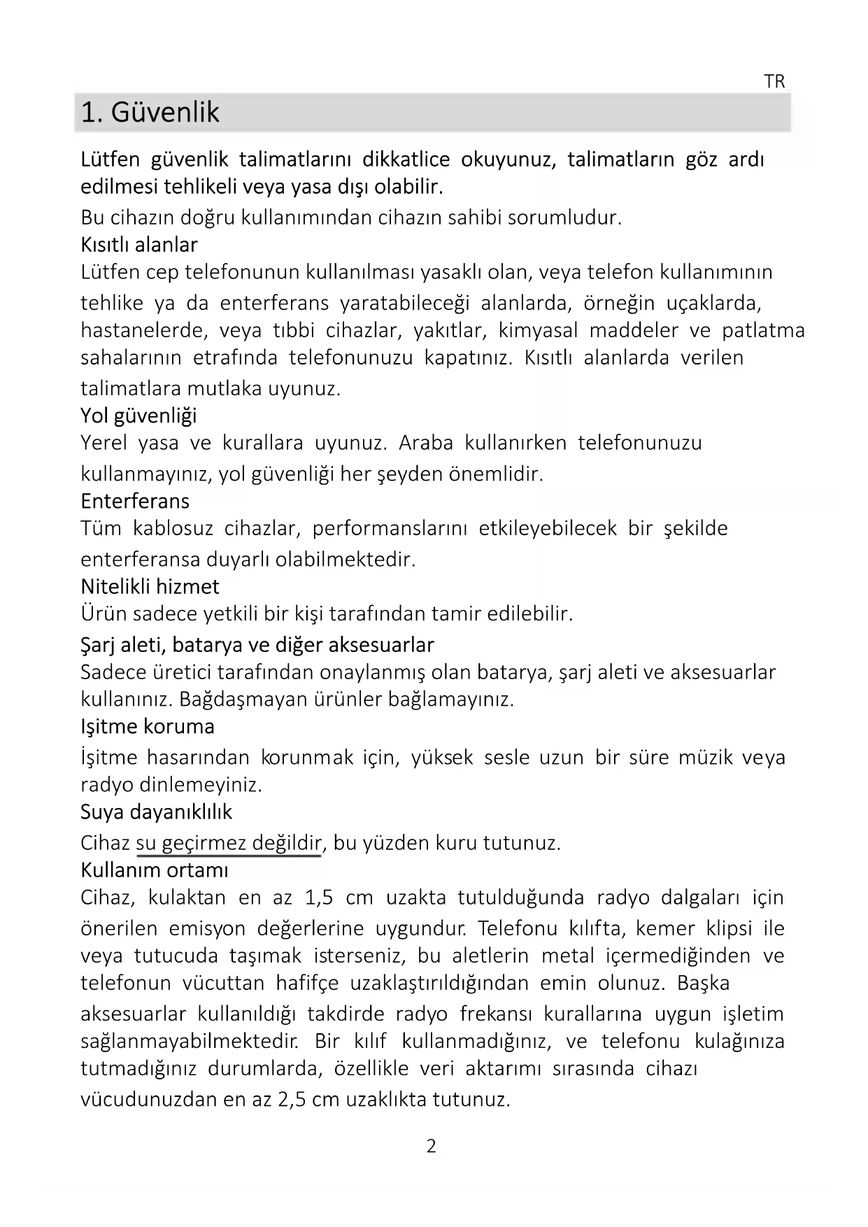 Lütfen güvenlik talimatlarını dikkatlice okuyunuz, talimatların göz ardı edilmesi tehlikeli veya yasa dışı olabilir. Bu cihazın doğru kullanımından cihazın sahibi sorumludur. Kısıtlı alanlar Lütfen cep telefonunun kullanılması yasaklı olan, veya telefon kullanımının tehlike ya da enterferans yaratabileceği alanlarda, örneğin uçaklarda, hastanelerde, veya tıbbi cihazlar, yakıtlar, kimyasal maddeler ve patlatma sahalarının etrafında telefonunuzu kapatınız. Kısıtlı alanlarda verilen talimatlara mutlaka uyunuz. Yol güvenliği Yerel yasa ve kurallara uyunuz. Araba kullanırken telefonunuzu kullanmayınız, yol güvenliği her şeyden önemlidir. Enterferans Tüm kablosuz cihazlar, performanslarını etkileyebilecek bir şekilde enterferansa duyarlı olabilmektedir. Nitelikli hizmet Ürün sadece yetkili bir kişi tarafından tamir edilebilir. Şarj aleti, batarya ve diğer aksesuarlar Sadece üretici tarafından onaylanmış olan batarya, şarj aleti ve aksesuarlar kullanınız. Bağdaşmayan ürünler bağlamayınız. Işitme koruma İşitme hasarından korunmak için, yüksek sesle uzun bir süre müzik veya radyo dinlemeyiniz. Suya dayanıklılık Cihaz su geçirmez değildir, bu yüzden kuru tutunuz. Kullanım ortamı Cihaz, kulaktan en az 1,5 cm uzakta tutulduğunda radyo dalgaları için önerilen emisyon değerlerine uygundur. Telefonu kılıfta, kemer klipsi ile veya tutucuda taşımak isterseniz, bu aletlerin metal içermediğinden ve telefonun vücuttan hafifçe uzaklaştırıldığından emin olunuz. Başka aksesuarlar kullanıldığı takdirde radyo frekansı kurallarına uygun işletim sağlanmayabilmektedir. Bir kılıf kullanmadığınız, ve telefonu kulağınıza tutmadığınız durumlarda, özellikle veri aktarımı sırasında cihazı vücudunuzdan en az 2,5 cm uzaklıkta tutunuz.TR