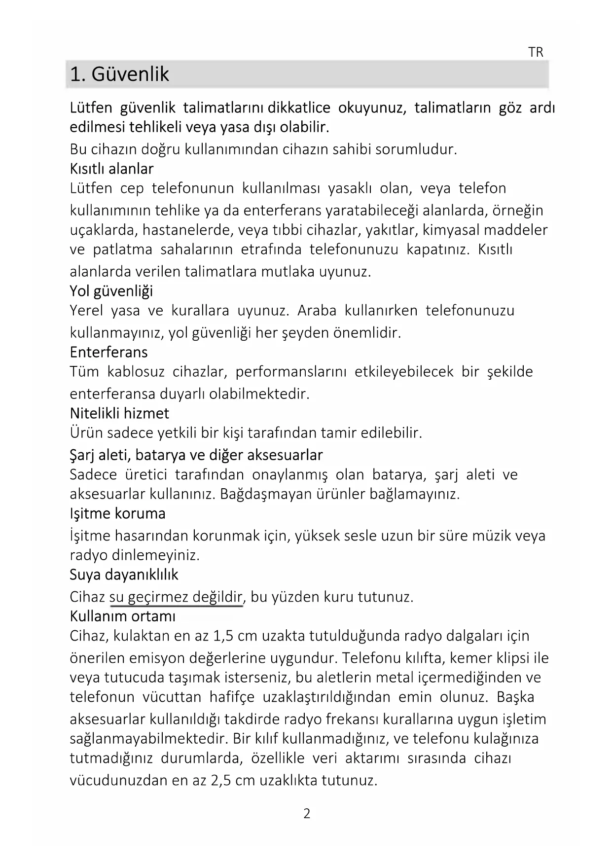 Lütfen güvenlik talimatlarını dikkatlice okuyunuz, talimatların göz ardı edilmesi tehlikeli veya yasa dışı olabilir. Bu cihazın doğru kullanımından cihazın sahibi sorumludur. Kısıtlı alanlar Lütfen cep telefonunun kullanılması yasaklı olan, veya telefon kullanımının tehlike ya da enterferans yaratabileceği alanlarda, örneğin uçaklarda, hastanelerde, veya tıbbi cihazlar, yakıtlar, kimyasal maddeler ve patlatma sahalarının etrafında telefonunuzu kapatınız. Kısıtlı alanlarda verilen talimatlara mutlaka uyunuz. Yol güvenliği Yerel yasa ve kurallara uyunuz. Araba kullanırken telefonunuzu kullanmayınız, yol güvenliği her şeyden önemlidir. Enterferans Tüm kablosuz cihazlar, performanslarını etkileyebilecek bir şekilde enterferansa duyarlı olabilmektedir. Nitelikli hizmet Ürün sadece yetkili bir kişi tarafından tamir edilebilir. Şarj aleti, batarya ve diğer aksesuarlar Sadece üretici tarafından onaylanmış olan batarya, şarj aleti ve aksesuarlar kullanınız. Bağdaşmayan ürünler bağlamayınız. Işitme koruma İşitme hasarından korunmak için, yüksek sesle uzun bir süre müzik veya radyo dinlemeyiniz. Suya dayanıklılık Cihaz su geçirmez değildir, bu yüzden kuru tutunuz. Kullanım ortamı Cihaz, kulaktan en az 1,5 cm uzakta tutulduğunda radyo dalgaları için önerilen emisyon değerlerine uygundur. Telefonu kılıfta, kemer klipsi ile veya tutucuda taşımak isterseniz, bu aletlerin metal içermediğinden ve telefonun vücuttan hafifçe uzaklaştırıldığından emin olunuz. Başka aksesuarlar kullanıldığı takdirde radyo frekansı kurallarına uygun işletim sağlanmayabilmektedir. Bir kılıf kullanmadığınız, ve telefonu kulağınıza tutmadığınız durumlarda, özellikle veri aktarımı sırasında cihazı vücudunuzdan en az 2,5 cm uzaklıkta tutunuz.TR