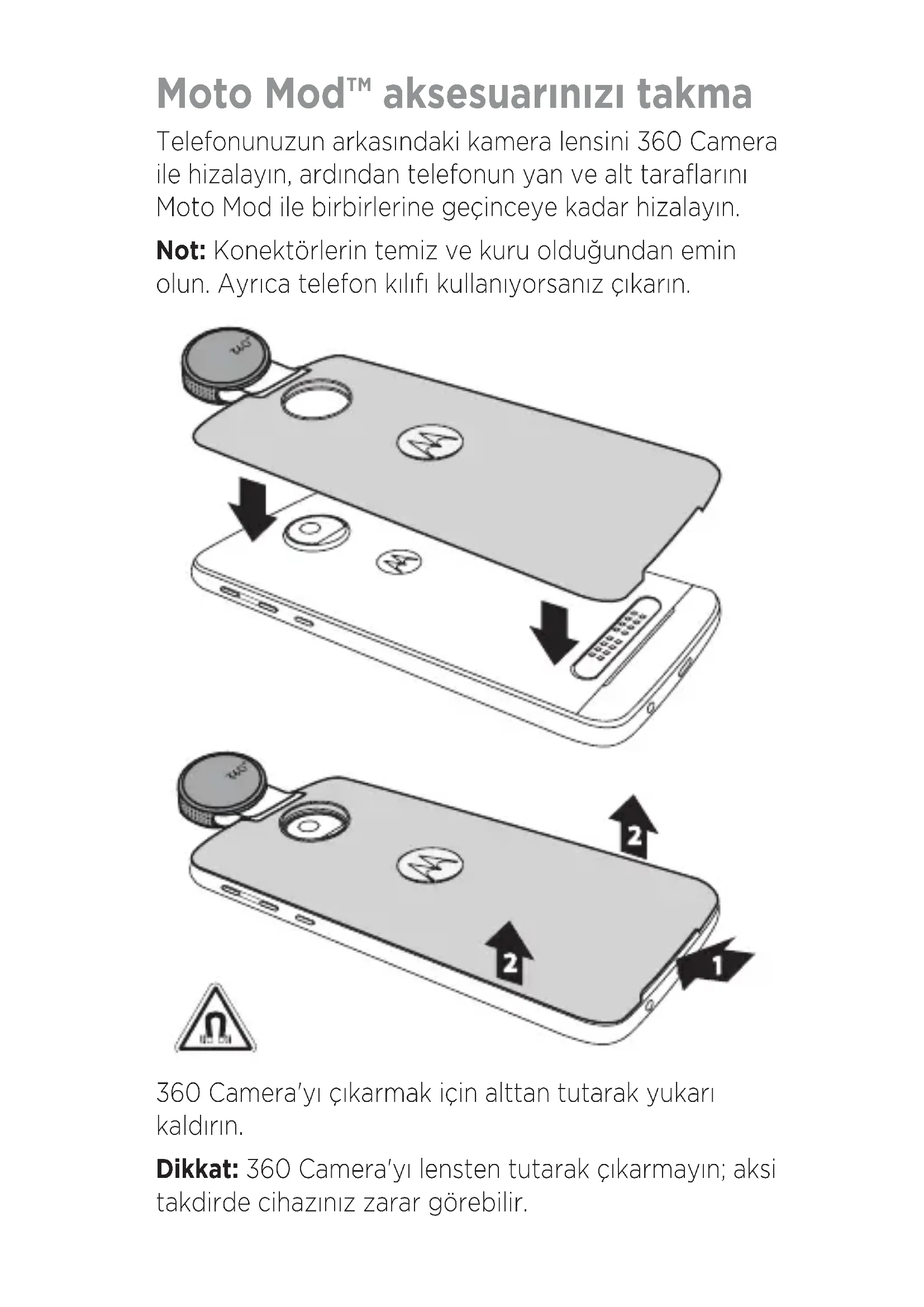 - Düzenle: Fotoğraf açıp öğesine veya video açıp öğesine dokunun. Düzenleme seçenekleri altta yer alır.360 fotoğraf düzenleme seçenekleri Bu seçeneklere erişmek için öğesine dokunun. Kırp 360° fotoğrafı kırparak standart boyutlu düz fotoğrafa dönüştürün. Standart boyutlar veya küçük gezegen görünümünün de dahil olduğu özel boyutlar arasından seçim yapın. 360 Kırpma 360° fotoğrafı kırparak seçtiğiniz alanın etkileyici 360° fotoğrafına dönüştürün. Filtreler Çeşitli filtreler arasından seçim yapın. Ayarla Pozlama, kontrast, doygunluk ve tonu manuel olarak ayarlayın. 360 video düzenleme seçenekleri Bu seçeneklere erişmek için öğesine dokunun. Kırp Videonuzun uzunluğunu kırpın. Derle Birden fazla 360° videoyu derleyerek tek bir videoya dönüştürün. Director's Cut 360° videonun en etkileyici kısımlarını seçin ve bunları düzenleyerek herkesin görüntüleyebileceği, normal ve etkileşimli olmayan 16:9 videoya dönüştürün. Çek Videonun bir karesini 360° veya düz fotoğraf olarak çekin.Daha fazlasına mı ihtiyacınız var? Eğiticiler, videolar ve diğer içerikler için www.motorola.com/mymotomods adresini ziyaret edin.Telif Hakları ve Ticari Markalar Motorola Mobility LLC 222 W. Merchandise Mart Plaza Chicago, IL 60654 www.motorola.com Bazı özellikler, hizmetler ve uygulamalar ağa bağlıdır ve tüm bölgelerde kullanılamayabilir; ek hükümler, koşullar ve/veya ücretler geçerli olabilir. Ayrıntılar için hizmet sağlayıcınıza başvurun. Bu kullanıcı kılavuzunda bulunan bilgilerin yanı sıra tüm özellikler, işlevsellik ve diğer ürün özellikleri eldeki en son bilgilere dayalıdır ve bu kılavuz basıldığı sırada bunların doğru olduğu kabul edilmiştir. Motorola, herhangi bir bilgiyi veya teknik özelliği önceden bildirmeksizin ya da herhangi bir yükümlülük altına girmeksizin değiştirme veya düzenleme hakkını saklı tutar. Not: Bu kılavuzdaki resimler yalnızca örnektir. MOTOROLA, stil verilmiş M logosu, MOTO ve MOTO markalar ailesi; Motorola Trademark Holdings, LLC şirketinin ticari markaları veya tescilli ticari markalarıdır. LENOVO, Lenovo şirketinin ticari markasıdır. Google, Android, Google Play ve diğer markalar Google Inc. şirketinin ticari markalarıdır. microSD Logosu; SD-3C, LLC şirketinin ticari markasıdır. Diğer tüm ürün ve hizmet adları kendi sahiplerinin mülkiyetindedir. © 2017 Motorola Mobility LLC. Tüm hakları saklıdır. Ürün Kimlikleri: Moto Mods 360 Camera (MD100S) Kılavuz Numarası: SSC8C19882-A360 CAMERA360 CAMERA Påsætning af Moto Mod™ Afpas kameraobjektivet på bagsiden af telefonen med 360 Camera, og afpas derefter siderne og bunden af telefonen med Moto Mod, indtil de klikker sammen. Bemærk: Sørg for, at tilslutningerne er rene og tørre. Fjern også telefonetuiet, hvis du bruger et. MD100S For at fjerne 360 Camera løftes op fra bunden. Advarsel: Fjern ikke 360 Camera ved at gribe fat i objektivet, da det kan beskadige enheden.Fjernelse af objektivdæksel For at fjerne objektivdækslet skal du løfte og vride. Advarsel: For at undgå at ridse objektivet så hav altid dækslet på, når du ikke bruger kameraet og læg ikke kameraet på et bord eller en plan overflade, medmindre objektivdækslet er monteret. Tænding af kamera Du kan tænde for kameraet på flere måder: