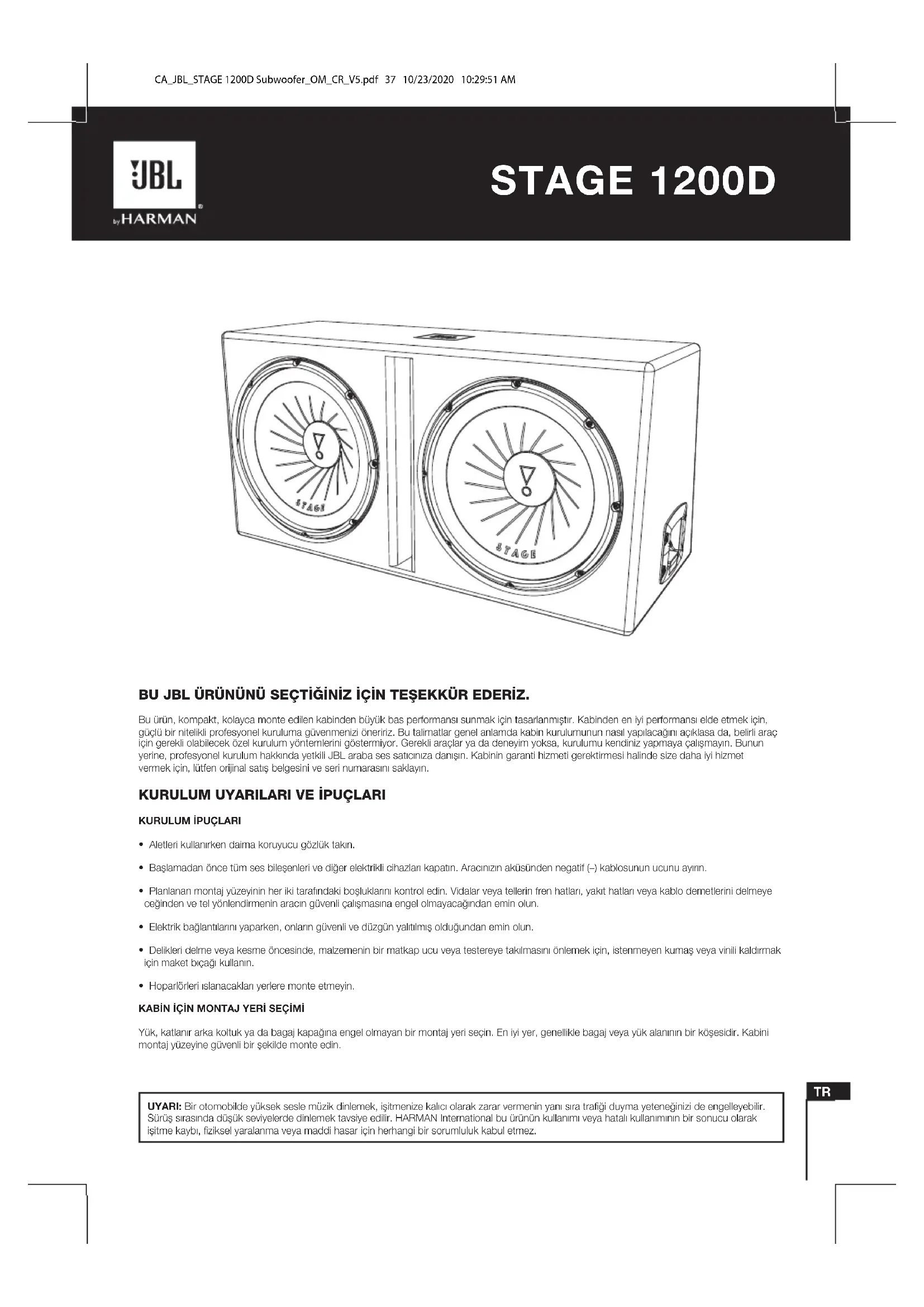 (20 AWG) til tilslutningerne til kabinettet. OVERORDNET VEDLIGEHOLDELSE Højttaleren kan rengøres med en fugtig klud. Benyt ikke rengørings- eller opløsningsmidler. Der kræves et gyldigt serienummer ved garantidækning. Dette produkt er designet to mobil-apps og er ikke beregnet til tilslutning til lysnettet. HOVEDENHED BATTERI FORSTÆRKER Fjernaktivering Højttalerudgang 500Wrms 1000W 94dB 34Hz – 200Hz 2 ohms 30-1/8" x 15" x 13-11/16" x 10-1/2"/ (764.5mm x 380mm x 347.5mm x 266.7mm) Stage 1200D STAGE 1200D CA_JBL_STAGE 1200D Subwoofer_OM_CR_V5.pdf 36 10/23/2020 10:29:51 AMUYARI: Bir otomobilde yüksek sesle müzik dinlemek, işitmenize kalıcı olarak zarar vermenin yanı sıra trafiği duyma yeteneğinizi de engelleyebilir. Sürüş sırasında düşük seviyelerde dinlemek tavsiye edilir. HARMAN International bu ürünün kullanımı veya hatalı kullanımının bir sonucu olarak işitme kaybı, fiziksel yaralanma veya maddi hasar için herhangi bir sorumluluk kabul etmez. BU JBL ÜRÜNÜNÜ SEÇTİĞİNİZ İÇİN TEŞEKKÜR EDERİZ. Bu ürün, kompakt, kolayca monte edilen kabinden büyük bas performansı sunmak için tasarlanmıştır. Kabinden en iyi performansı elde etmek için, güçlü bir nitelikli profesyonel kuruluma güvenmenizi öneririz. Bu talimatlar genel anlamda kabin kurulumunun nasıl yapılacağını açıklasa da, belirli araç için gerekli olabilecek özel kurulum yöntemlerini göstermiyor. Gerekli araçlar ya da deneyim yoksa, kurulumu kendiniz yapmaya çalışmayın. Bunun yerine, profesyonel kurulum hakkında yetkili JBL araba ses satıcınıza danışın. Kabinin garanti hizmeti gerektirmesi halinde size daha iyi hizmet vermek için, lütfen orijinal satış belgesini ve seri numarasını saklayın.