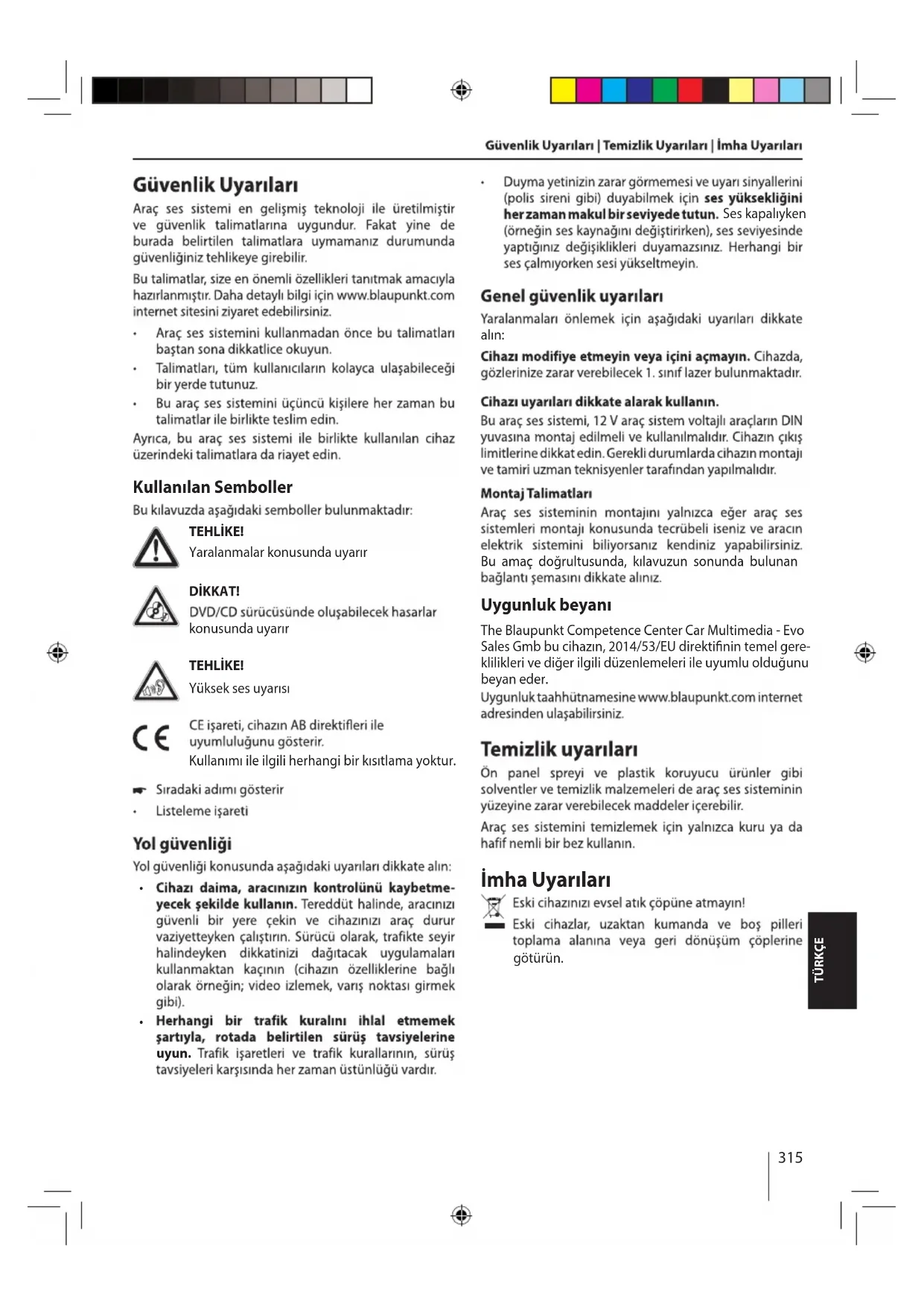 uyun. Ses kapalıyken alın: Bu amaç doğrultusunda, kılavuzun sonunda bulunan Uygunluk beyanı İmha Uyarıları götürün. The Blaupunkt Competence Center Car Multimedia - Evo Sales Gmb bu cihazın, 2014/53/EU direktinin temel gere- klilikleri ve diğer ilgili düzenlemeleri ile uyumlu olduğunu beyan eder. Kullanımı ile ilgili herhangi bir kısıtlama yoktur.316