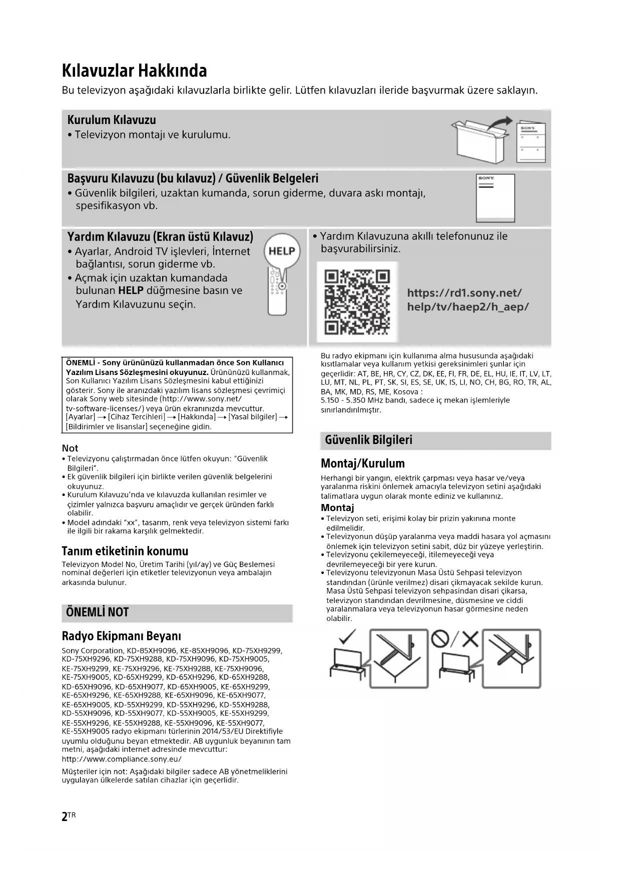 - Televizyonu çalıştırmadan önce lütfen okuyun: “Güvenlik Bilgileri”.• Ek güvenlik bilgileri için birlikte verilen güvenlik belgelerini okuyunuz.• Kurulum Kılavuzu’nda ve kılavuzda kullanılan resimler ve çizimler yalnızca başvuru amaçlıdır ve gerçek üründen farklı olabilir.• Model adındaki “xx”, tasarım, renk veya televizyon sistemi farkı ile ilgili bir rakama karşılık gelmektedir. Tanım etiketinin konumu Televizyon Model No, Üretim Tarihi (yıl/ay) ve Güç Beslemesi nominal değerleri için etiketler televizyonun veya ambalajın arkasında bulunur. ÖNEMLİ NOT Radyo Ekipmanı Beyanı Sony Corporation, KD-85XH9096, KE-85XH9096, KD-75XH9299, KD-75XH9296, KD-75XH9288, KD-75XH9096, KD-75XH9005, KE-75XH9299, KE-75XH9296, KE-75XH9288, KE-75XH9096, KE-75XH9005, KD-65XH9299, KD-65XH9296, KD-65XH9288, KD-65XH9096, KD-65XH9077, KD-65XH9005, KE-65XH9299, KE-65XH9296, KE-65XH9288, KE-65XH9096, KE-65XH9077, KE-65XH9005, KD-55XH9299, KD-55XH9296, KD-55XH9288, KD-55XH9096, KD-55XH9077, KD-55XH9005, KE-55XH9299, KE-55XH9296, KE-55XH9288, KE-55XH9096, KE-55XH9077, KE-55XH9005 radyo ekipmanı türlerinin 2014/53/EU Direktifiyle uyumlu olduğunu beyan etmektedir. AB uygunluk beyanının tam metni, aşağıdaki internet adresinde mevcuttur: http://www.compliance.sony.eu/Müşteriler için not: Aşağıdaki bilgiler sadece AB yönetmeliklerini uygulayan ülkelerde satılan cihazlar için geçerlidir.Bu radyo ekipmanı için kullanıma alma hususunda aşağıdaki kısıtlamalar veya kullanım yetkisi gereksinimleri şunlar için geçerlidir: AT, BE, HR, CY, CZ, DK, EE, FI, FR, DE, EL, HU, IE, IT, LV, LT, LU, MT, NL, PL, PT, SK, SI, ES, SE, UK, IS, LI, NO, CH, BG, RO, TR, AL, BA, MK, MD, RS, ME, Kosova :5.150 - 5.350 MHz bandı, sadece iç mekan işlemleriyle sınırlandırılmıştır. Güvenlik Bilgileri Montaj/Kurulum Herhangi bir yangın, elektrik çarpması veya hasar ve/veya yaralanma riskini önlemek amacıyla televizyon setini aşağıdaki talimatlara uygun olarak monte ediniz ve kullanınız. Montaj