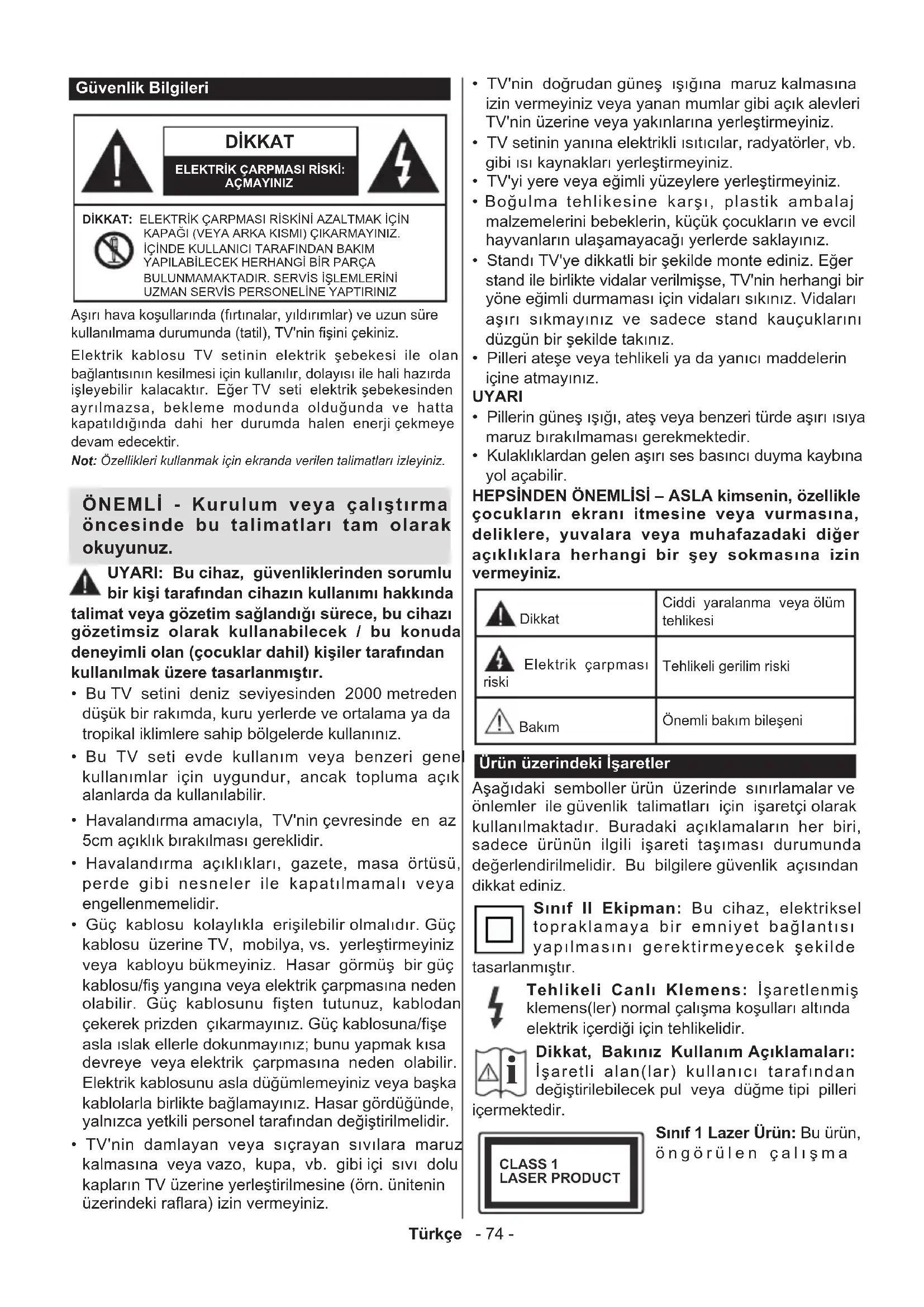 Dikkat, Bakınız Kullanım Açıklamaları: İşaretli alan(lar) kullanıcı tarafından değiştirilebilecek pul veya düğme tipi pilleri içermektedir. CLASS 1 LASER PRODUCT Sınıf 1 Lazer Ürün: Bu ürün, öngörülen çalışmaTürkçe - 75 - koşullarında makul ölçüde güvenli olan Sınıf 1 lazer kaynağı içermektedir. UYARI Pili yutmayınız, Kimyasal Yanma tehlikesi Bu ürün veya birlikte verilen aksesuarlar bir pul/düğme tipi pil içerebilir. Eğer düğme tipi pil yutulursa, sadece 2 saat içerisinde vücudunuzun içinde ciddi yanmalara ve ölüme neden olabilir. Yeni ve kullanılmış pilleri çocuklardan uzak tutunuz. Eğer pil yuvası düzgün bir şekilde kapanmıyorsa, ürünü kullanmayınız ve çocuklardan uzak tutunuz. Eğer pillerin yutulduğunu veya vücudunuzda bulunduğunu düşünüyorsanız, derhal tıbbi destek alınız. – – – – – – – – – – – – Televizyon düşmesi durumunda ciddi yaralanmalara veya ölüme neden olabilir. Özellikle çocukların maruz olabileceği birçok yaralanma aşağıdakiler gibi basit tedbirler alınarak önlenebilir: