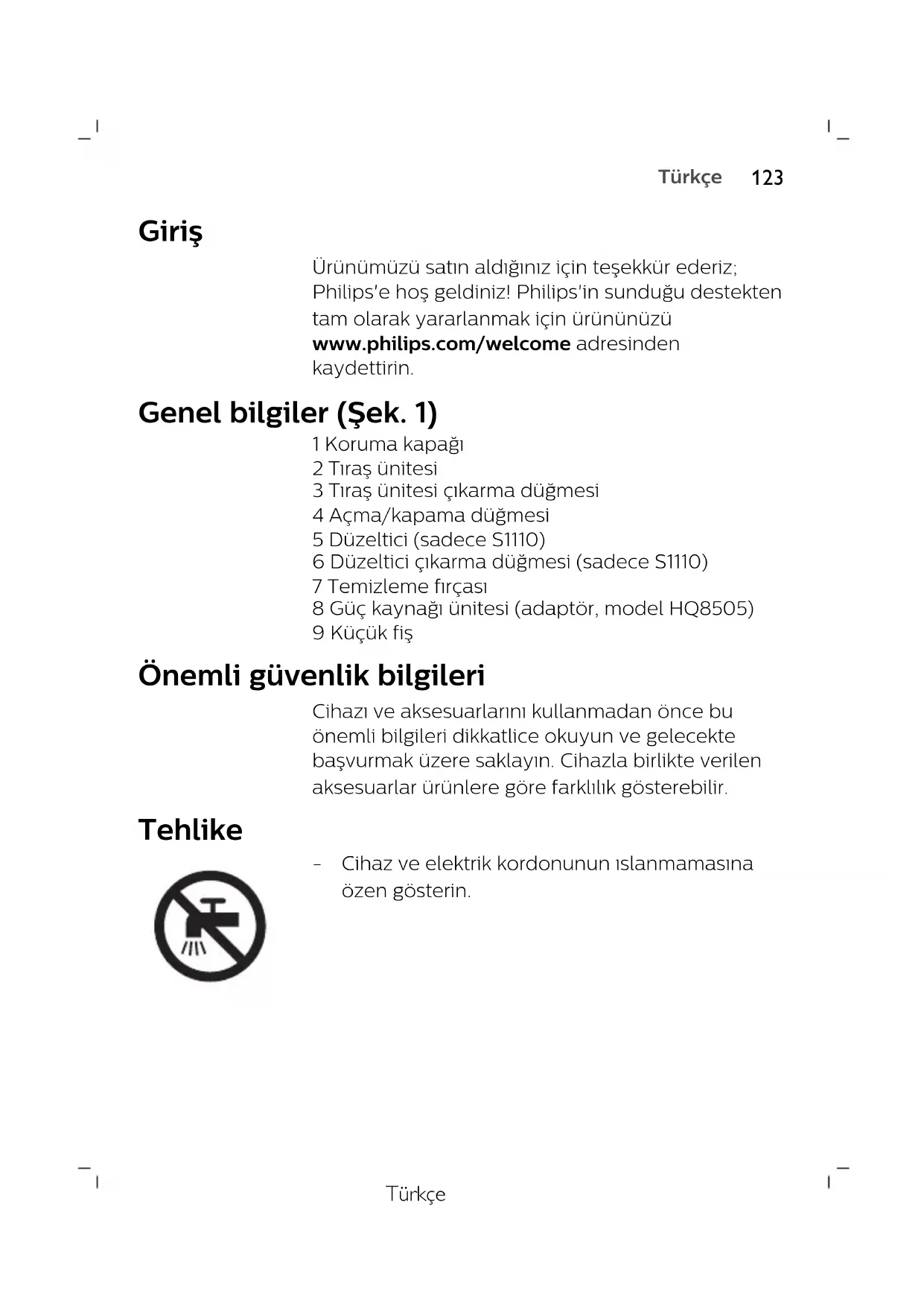SvenskaTürkçe Giriş Ürünümüzü satın aldığınız için teşekkür ederiz; Philips'e hoş geldiniz! Philips'in sunduğu destekten tam olarak yararlanmak için ürününüzü www.philips.com/welcome adresinden kaydettirin. Genel bilgiler (Şek. 1) 1 Koruma kapağı 2 Tıraş ünitesi 3 Tıraş ünitesi çıkarma düğmesi 4 Açma/kapama düğmesi 5 Düzeltici (sadece S1110) 6 Düzeltici çıkarma düğmesi (sadece S1110) 7 Temizleme fırçası 8 Güç kaynağı ünitesi (adaptör, model HQ8505) 9 Küçük fiş Önemli güvenlik bilgileri Cihazı ve aksesuarlarını kullanmadan önce bu önemli bilgileri dikkatlice okuyun ve gelecekte başvurmak üzere saklayın. Cihazla birlikte verilen aksesuarlar ürünlere göre farklılık gösterebilir. Tehlike