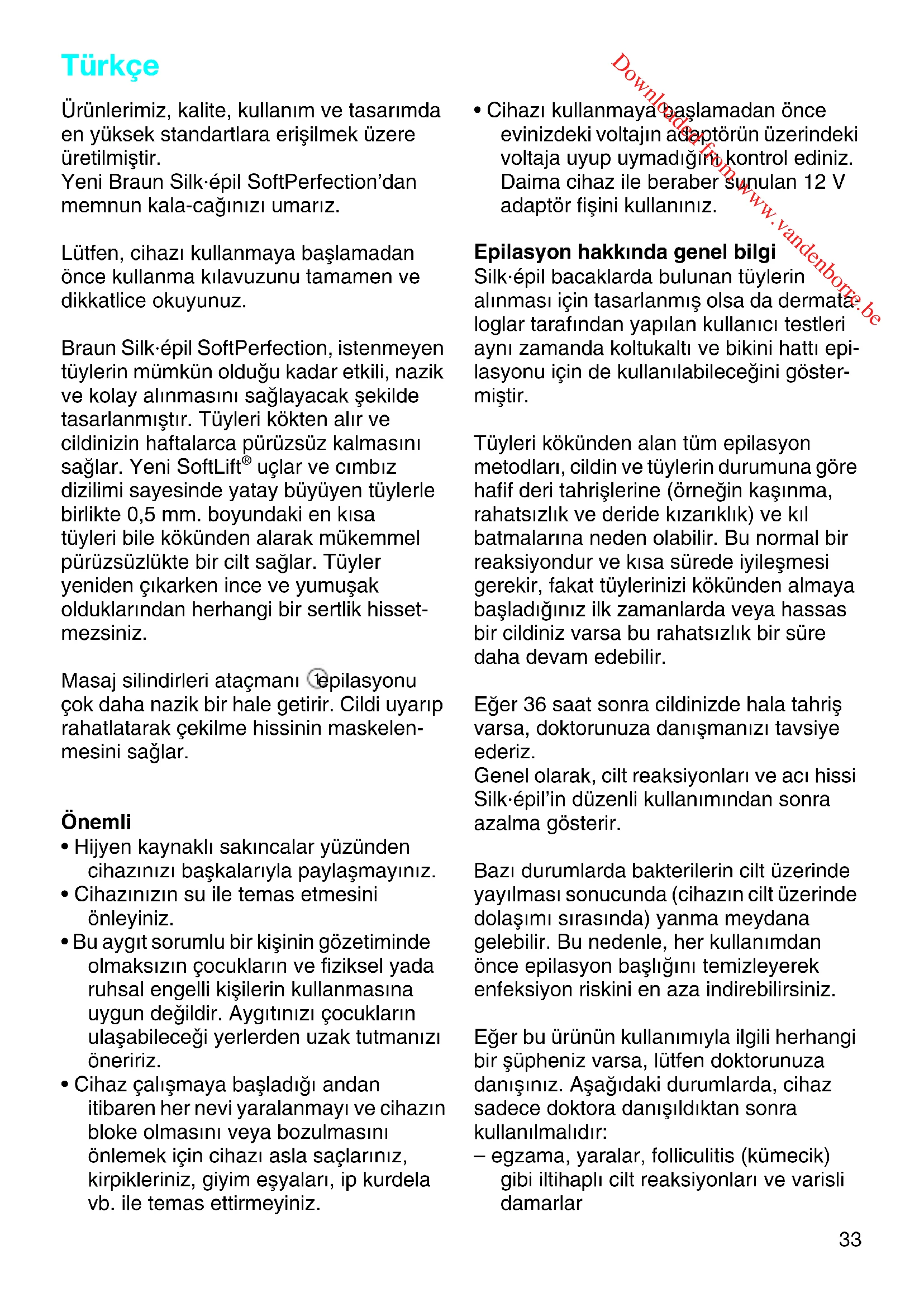 5368389_SE3170_S6- Seite 32 Montag, 27. August 2007 11:12 11 Downloaded from www.vandenborre.be33 Türkçe Ürünlerimiz, kalite, kullan∂m ve tasar∂mda en yüksek standartlara eriµilmek üzere üretilmiµtir. Yeni Braun Silk·épil SoftPerfection’dan memnun kala-caπ∂n∂z∂ umar∂z. Lütfen, cihaz∂ kullanmaya baµlamadan önce kullanma k∂lavuzunu tamamen ve dikkatlice okuyunuz. Braun Silk·épil SoftPerfection, istenmeyen tüylerin mümkün olduπu kadar etkili, nazik ve kolay al∂nmas∂n∂ saπlayacak µekilde tasarlanm∂µt∂r. Tüyleri kökten al∂r ve cildinizin haftalarca pürüzsüz kalmas∂n∂ saπlar. Yeni SoftLift