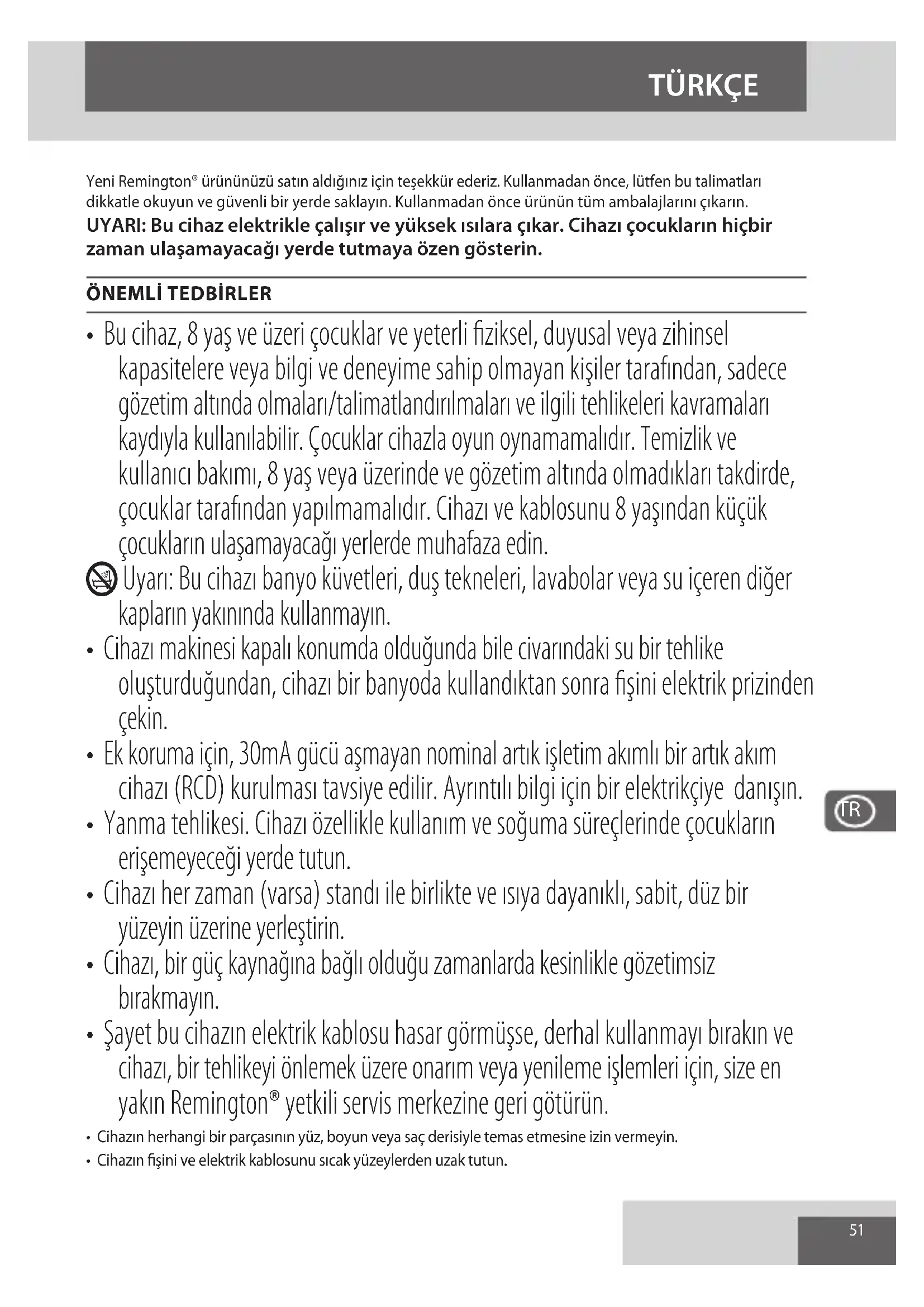 Yeni Remington® ürününüzü satın aldığınız için teşekkür ederiz. Kullanmadan önce, lütfen bu talimatları dikkatle okuyun ve güvenli bir yerde saklayın. Kullanmadan önce ürünün tüm ambalajlarını çıkarın. UYARI: Bu cihaz elektrikle çalışır ve yüksek ısılara çıkar. Cihazı çocukların hiçbir zaman ulaşamayacağı yerde tutmaya özen gösterin.