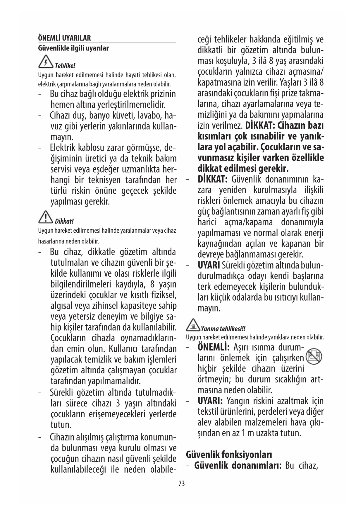 LA ÎNDEMÂNA COPIILOR! - Ingerarea poate cauza leziuni grave în mai puțin de 2 ore sau decesul din cau- za arsurilor provocate de substanțele chimice, şi este posibilă perforarea es- ofagului. - Examinați dispozitivele şi asigurați-vă că compartimentul de baterii este în- chis corect. A nu se utiliza dacă com- partimentul de baterii nu este închis72 corect. - Eliminați bateriile tip „nasture” uzate imediat şi în mod sigur. Bateriile de- scărcate pot , în orice caz, periculoa- se. Avertismente fundamentale privind siguranța Stimat Client, în timpul funcționării, ştecherul acestui aparat se încălzeşte: acest lucru este absolut normal. Acesta este un APARAT DE ÎNCĂLZIRE CU PUTERE DE ALIMENTARE MARE, conform standardelor noastre normale ridicate. Vă rugăm să vă asigurați că prizele dumneavoastră de perete sunt în condiții bune de funcționare ş i că ştecherul este introdus corect în priza de curent, pentru a se evita orice supraîncălzire accidentală. Atunci când aparatul este utilizat pe perioade îndelungate de timp, vă recomandăm să verificați ştecherul şi PRIZA DE CURENT în mod regulat şi, în cazul în care aveți dubii, vă rugăm să consultați un electrician. Doar pentru țările din afara UE: Este interzisă utilizarea aparatului de către persoane (inclusiv copii) cu capacități psi- hice, zice sau senzoriale reduse sau care nu au experiență şi cunoştințe suciente, dacă acestea nu sunt supravegheate înde- aproape şi instruite cu privire la siguranța acestuia de către o persoană responsabilă. Supravegheați copiii şi asigurați-vă că nu se joacă cu aparatul. Eliminarea aparatului Nu aruncaţi aparatul împreună cu gunoiul domestic, ci duceţi-l la un centru de colectare diferenţiată o- cială.73 ÖNEMLİ UYARILAR Güvenlikle ilgili uyarılar Tehlike! Uygun hareket edilmemesi halinde hayati tehlikesi olan, elektrik çarpmalarına bağlı yaralanmalara neden olabilir. - Bu cihaz bağlı olduğu elektrik prizinin hemen altına yerleştirilmemelidir. - Cihazı duş, banyo küveti, lavabo, ha- vuz gibi yerlerin yakınlarında kullan- mayın. - Elektrik kablosu zarar görmüşse, de- ğişiminin üretici ya da teknik bakım servisi veya eşdeğer uzmanlıkta her- hangi bir teknisyen tarafından her türlü riskin önüne geçecek şekilde yapılması gerekir. Dikkat! Uygun hareket edilmemesi halinde yaralanmalar veya cihaz hasarlarına neden olabilir. - Bu cihaz, dikkatle gözetim altında tutulmaları ve cihazın güvenli bir şe- kilde kullanımı ve olası risklerle ilgili bilgilendirilmeleri kaydıyla, 8 yaşın üzerindeki çocuklar ve kısıtlı fiziksel, algısal veya zihinsel kapasiteye sahip veya yetersiz deneyim ve bilgiye sa- hip kişiler tarafından da kullanılabilir. Çocukların cihazla oynamadıkların- dan emin olun. Kullanıcı tarafından yapılacak temizlik ve bakım işlemleri gözetim altında çalışmayan çocuklar tarafından yapılmamalıdır. - Sürekli gözetim altında tutulmadık- ları sürece cihazı 3 yaşın altındaki çocukların erişemeyecekleri yerlerde tutun. - Cihazın alışılmış çalıştırma konumun- da bulunması veya kurulu olması ve çocuğun cihazın nasıl güvenli şekilde kullanılabileceği ile neden olabile- ceği tehlikeler hakkında eğitilmiş ve dikkatli bir gözetim altında bulun- ması koşuluyla, 3 ilâ 8 yaş arasındaki çocukların yalnızca cihazı açmasına/ kapatmasına izin verilir. Yaşları 3 ilâ 8 arasındaki çocukların fişi prize takma- larına, cihazı ayarlamalarına veya te- mizliğini ya da bakımını yapmalarına izin verilmez. DİKKAT: Cihazın bazı kısımları çok ısınabilir ve yanık- lara yol açabilir. Çocukların ve sa- vunmasız kişiler varken özellikle dikkat edilmesi gerekir. - DİKKAT: Güvenlik donanımının ka- zara yeniden kurulmasıyla ilişkili riskleri önlemek amacıyla bu cihazın güç bağlantısının zaman ayarlı fiş gibi harici açma/kapama donanımıyla yapılmaması ve normal olarak enerji kaynağından açılan ve kapanan bir devreye bağlanmaması gerekir. - UYARI Sürekli gözetim altında bulun- durulmadıkça odayı kendi başlarına terk edemeyecek kişilerin bulunduk- ları küçük odalarda bu ısıtıcıyı kullan- mayın. Yanma tehlikesi!! Uygun hareket edilmemesi halinde yanıklara neden olabilir. - ÖNEMLİ: Aşırı ısınma durum- larını önlemek için çalışırken hiçbir şekilde cihazın üzerini örtmeyin; bu durum sıcaklığın art- masına neden olabilir. - UYARI: Yangın riskini azaltmak için tekstil ürünlerini, perdeleri veya diğer alev alabilen malzemeleri hava çıkı- şından en az 1 m uzakta tutun. Güvenlik fonksiyonları - Güvenlik donanımları: Bu cihaz,74 kazara aşırı ısınması (örneğin, hava giriş ve çıkış ızgaralarının örtülmesi, motorun dönmemesi veya yavaş dön- mesi gibi) durumunda fanlı ısıtıcının çalışmasını durduran bir güvenlik donanımıyla donatılmıştır. Bu fonk- siyonun sıfırlanması için fişin birkaç dakikalığına prizden çekilmesi, aşırı ısınmaya neden olan durumun gi- derilmesi ve ardından fişin yeniden prize takılması gerekir. Eğer cihaz çalışmazsa lütfen en yakın De’Longhi Müşteri Hizmetleri ile iletişime geçin. - Devrlmeye karı güvenlk do- nanımı: Bazı modeller, devrilmesi halinde cihazı kapatan devrilmeye karşı donanımla donatılmıştır. Cihazı yeniden başlatmak için dik konuma getirmeniz yeterlidir. Not: Bu işaret, kullanıcı için önemli tavsiye ve bilgileri belirtir. - Bu ısıtıcıyı yatay ve dengeli bir yüzey- de kullanın. - Cihazı daima ve yalnızca dikey ko- numda kullanın. - Düşürülmüşse, bu ısıtıcıyı kullanmayın. - Görünür hasar belirtileri varsa ısıtıcıyı kullanmayın. - Uzun süre kullanılması tavsiye edil- mez. Kullanılması gerekiyorsa, uzun süre kullanımla ilgili talimatları dik- katle izleyin, üzerinde i