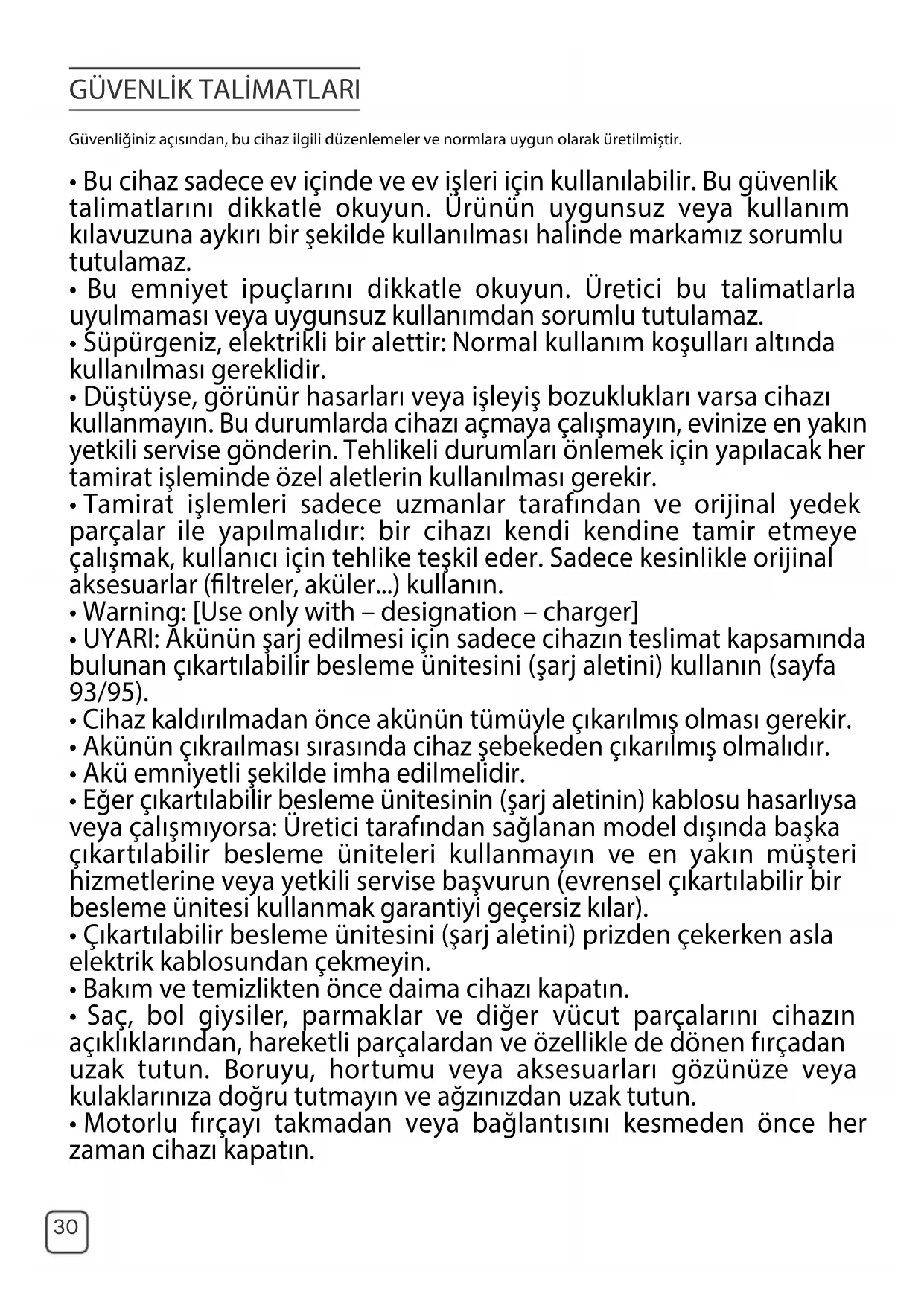 - Toz haznesinin veya motor koruma ltresinin parçalarını bulaşık makinesinde yıkamayın. PİLE DAİR GÜVENLİK TALİMATLARI