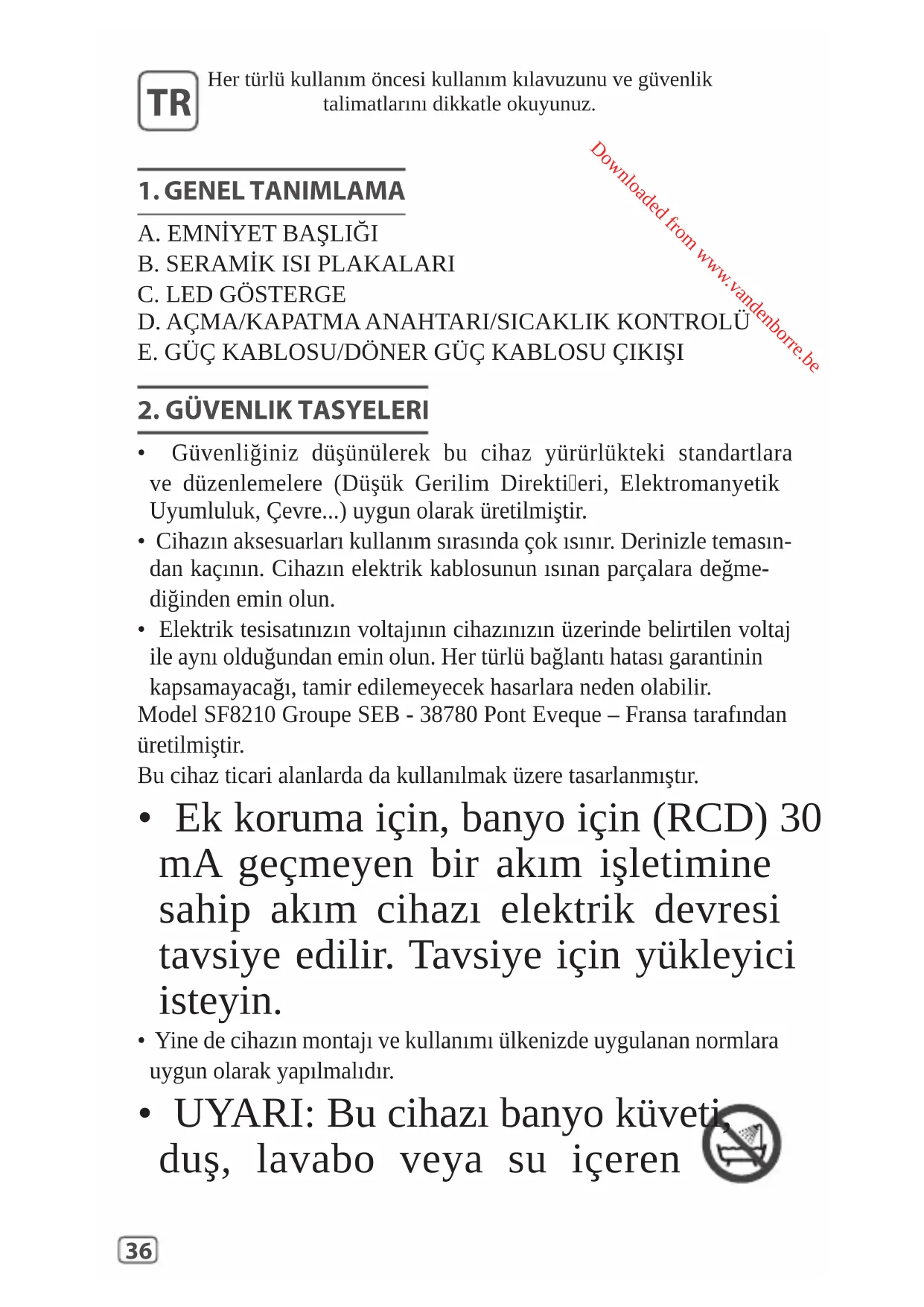 - Elektrik tesisatınızın voltajının cihazınızın üzerinde belirtilen voltaj ile aynı olduğundan emin olun. Her türlü bağlantı hatası garantinin kapsamayacağı, tamir edilemeyecek hasarlara neden olabilir. Model SF8210 Groupe SEB - 38780 Pont Eveque – Fransa tarafından üretilmiştir. Bu cihaz ticari alanlarda da kullanılmak üzere tasarlanmıştır.