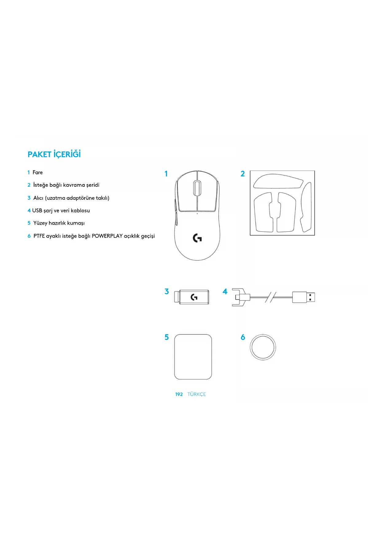 1 Fare 2 İsteğe bağlı kavrama şeridi 3 Alıcı (uzatma adaptörüne takılı) 4 USB şarj ve veri kablosu 5 Yüzey hazırlık kumaşı 6 PTFE ayaklı isteğe bağlı POWERPLAY açıklık geçişi193 TÜRKÇE