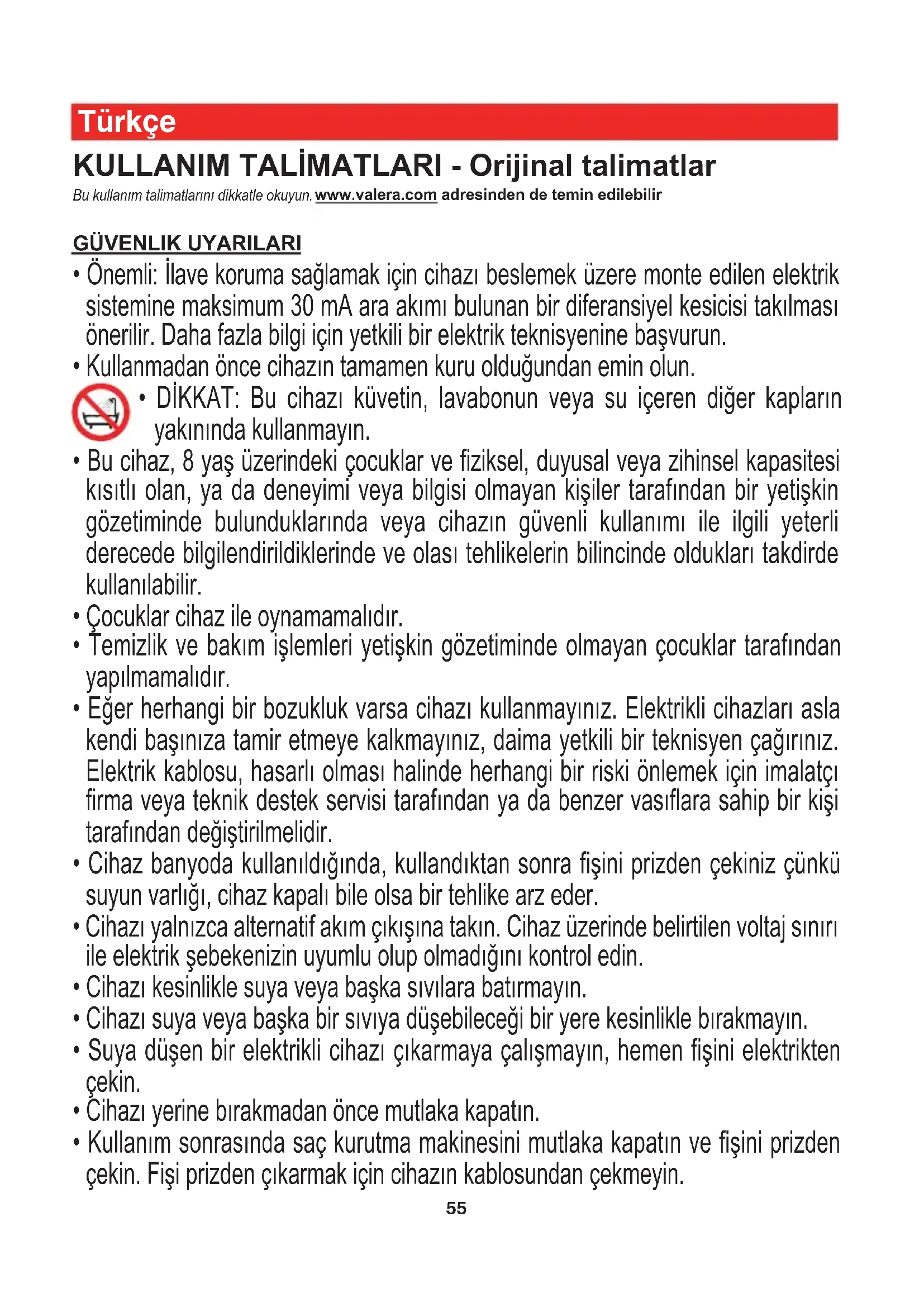 Ionic Wellness (bu aygıtın bulunduğu saç kurutma makineleri için) Bu fonksiyon milyonlarca arındırıcı negatif iyon üreten bir jeneratör ile ilişkilidir. İyonlar nedir? İyonlar doğada bulunan elektrik yüklü partiküllerdir. Negatif yüklü iyonlar, kirletici maddelerin büyük bir kısmını atmosferde tutmak suretiyle havanın kirlenmesine katkıda bulunan pozitif yüklü iyonları nötrleştirerek, bunların tam tersine havanın temizlenmesine yardımcı olurlar. Bir fırtına sonrasında ya da temiz, doğal ve canlandırıcı havanın bulunduğu, kendinizi iyi hissetmenizi sağlayan deniz veya dağ ortamında, şelalelerin ve su kanallarının yakınında çok miktarda negatif yüklü iyon bulunur. Saçlarınız için en iyi nemlendirme Negatif yüklü iyonlar saçtaki nemin gereken şekilde muhafaza edilmesine yardımcı olur. Bunlar esas olarak yeni yıkanmış saçların üzerinde bulunan su partiküllerini mikronize ederek saç telinin üzerinde daha fazla miktarda bir emilim sağlamak suretiyle saçın doğal nem dengesini düzenlerler. Saçta balsam etkisi Daha iyi nemlendirme saçlarınızın yumuşatılmasına yardımcı olur, canlandırıcı bir etkisi vardır ve saçları daha yumuşak ve kolay taranır kılmakla birlikte hacim ve ışıltı kazandırır. Elektrostatik yük veya “fly away” etkisi giderme Negatif yüklü iyonlar saçlardaki elektrostatik yükü ve “fly away” etkisini (kabarık saçlar) ve buruşukluğu azaltmaya yardımcı olurlar. Arındırıcı etki Saç kurutma makinesinden yayılan negatif yüklü iyonlar hava kirletici partiküllerin (pozitif veya nötr yükler) birbirlerine yapışarak ağırlaşmalarına ve yerçekiminin etkisiyle yere düşmelerine neden olarak havanın temizlenmesini sağlarlar. VALERA tescilli bir Ligo Electric S.A - İsviçre markasıdır. 00060713_19-03_Layout 1 29/01/2019 11:19 Pagina 5758 Українськa ІНСТРУКЦІЯ З ЕКСПЛУАТАЦІЇ - Оригінальні інструкції Уважно прочитайте цю інструкцію. Доступні також на сайті www.valera.com ПОПЕРЕДЖЕННЯ