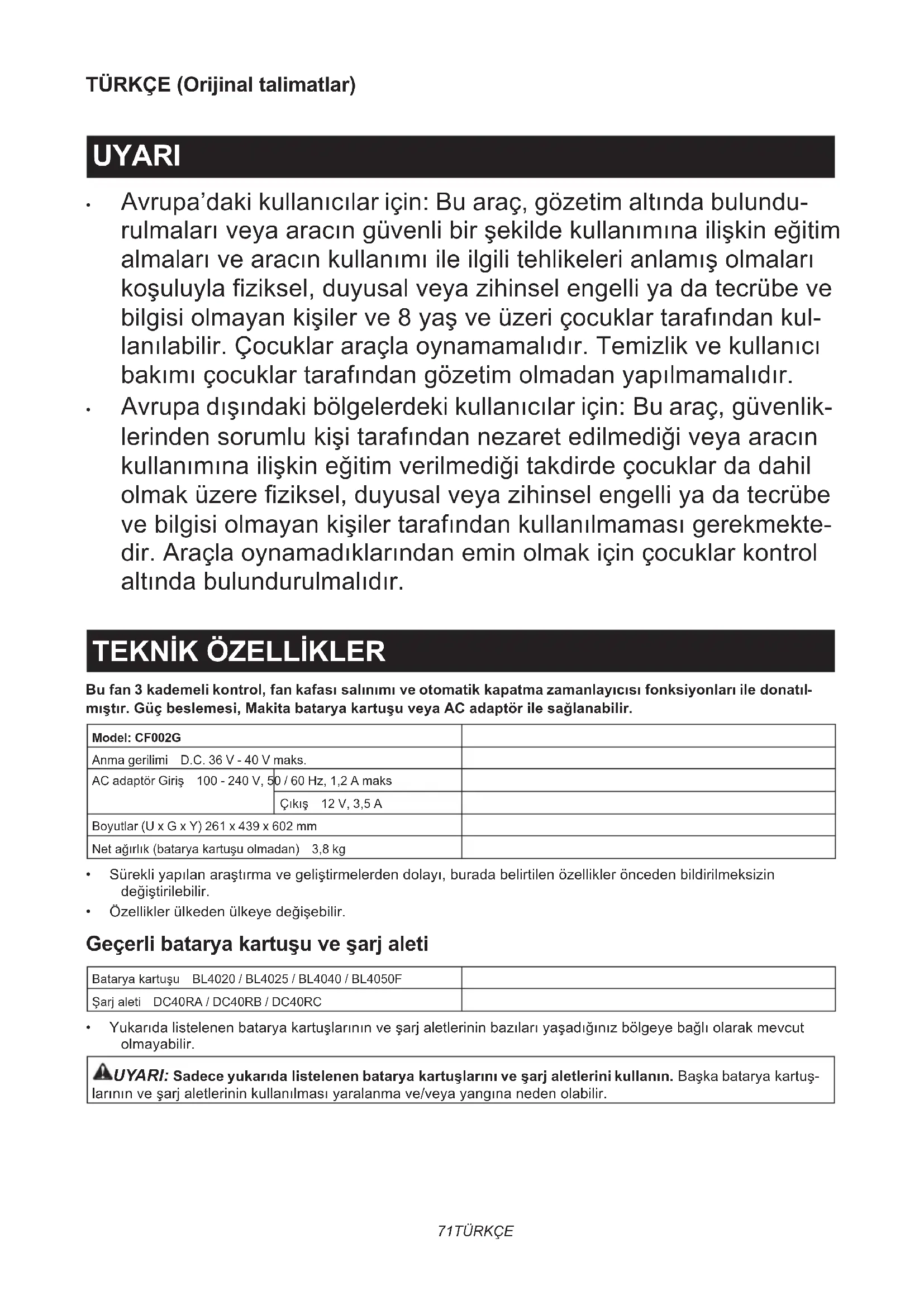 Bu fan 3 kademeli kontrol, fan kafası salınımı ve otomatik kapatma zamanlayıcısı fonksiyonları ile donatıl- mıştır. Güç beslemesi, Makita batarya kartuşu veya AC adaptör ile sağlanabilir. Model: CF002GAnmagerilimi D.C. 36 V - 40 V maks.AC adaptör Giriş 100 - 240 V, 50 / 60 Hz, 1,2 A maksÇıkış 12 V, 3,5 ABoyutlar (U x G x Y) 261 x 439 x 602 mmNetağırlık(bataryakartuşuolmadan) 3,8 kg