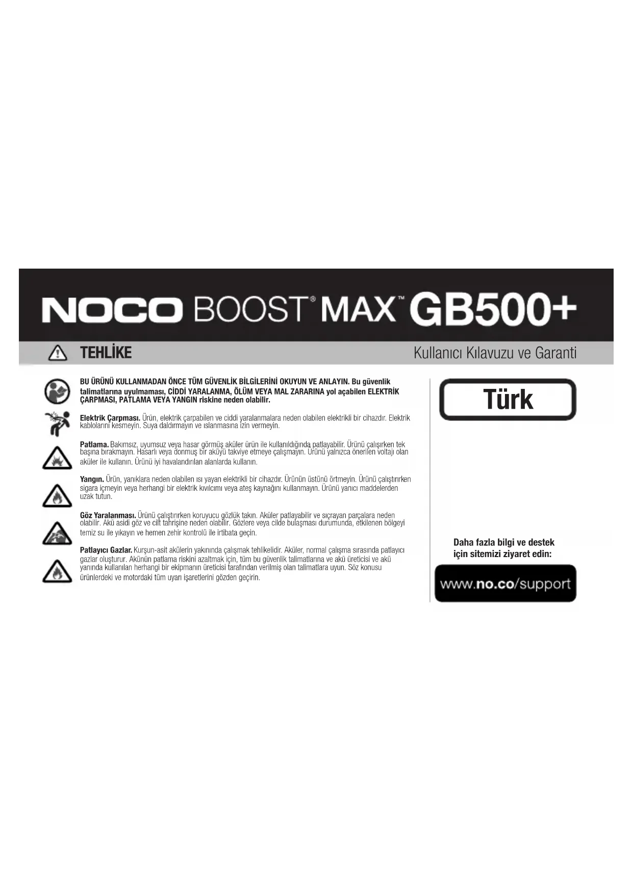 Kişilerin Yaralanma Tehlikesi. Güç kablosu veya akü kabloları herhangi bir şekilde hasar görmüşse bu ürünü kullanmayın. Bu cihaz ticari bir onarım tesisinde kullanılmak üzere tasarlanmamıştır. Bu cihaz kullanılmadığında kapalı mekanlarda saklanacak şekilde tasarlanmıştır. Bu cihaz kullanılmadığı zaman açık havada saklanmamalı veya bırakılmamalıdır. TRkısıtlı olduğu bir yerde çalıştırmayın. Aküyü ürünün üzerine koymayın. Kabloları, hareketli araç parçalarından (kaput ve kapılar dahil), hareketli motor parçalarından (fan bıçakları, kayışlar ve kasnaklar dahil) veya yaralanma veya ölüme sebebiyet verebilecek bir takılma tehlikesi oluşturan şeylerden uzakta tutun. Çalışma sıcaklığı. Bu ürün, -20°C ila 50°C arasındaki ortam sıcaklıklarında çalışacak şekilde tasarlanmıştır. Bu sıcaklık aralıklarının dışında ürünü çalıştırmayın. Donmuş aküleri takviye etmeyin. Akü aşırı ısınırsa, ürünün çalışmasını derhal durdurun. Saklama. Ürünüzü, yoğun toz veya havadaki maddeler bulunan alanlarda kullanmayın veya saklamayın. Ürünüzü devrilme veya düşme tehlikesine yol açmayacağı düz, emniyetli yüzeylerde saklayın. Ürünüzü, kuru bir yerde saklayın. Saklama sıcaklığı -20°C ila 25°C’dir (ortalama sıcaklık). Herhangi bir koşulda asla 80°C ‘yi geçmeyin. Uyumluluk. Ürün yalnızca 12 voltluk ve 24 volt kurşun asitli akü sistemleri ile uyumludur. Ürünü başka tür pillerle kullanmaya çalışmayın. Diğer pillerin kimyasına atlama, yaralanma, ölüm veya maddi hasarlara neden olabilir. Pili başlatmaya başlamadan önce pil üreticisine başvurun. Pilin özel kimyasından veya voltajından emin değilseniz, bir pili başlatmayın. Akü. Üründeki dahili lityum-iyon akü yalnızca NOCO tarafından değiştirilmeli ve evsel atıklardan ayrı olarak geri dönüştürülmeli veya atılmalıdır. Aküyü kendiniz değiştirmeye çalışmayın ve zarar görmüş veya sızıntı yapan bir lityum-iyon aküyü kullanmayın. Aküyü evsel atıklarla asla atmayın. Akülerin evsel atıklarla atılması, eyalet ve federal çevre kanunlar ve yönetmeliklerine göre yasadışıdır. Kullanılmış aküleri daima yerel akü geri dönüşüm merkezinize götürün. Ürün aküsü aşırı derecede sıcaksa, bir koku yaydığında, deforme olduğunda, kesilmiş ise veya anormal bir durum gösteriyor veya teşhir ediyorsa, derhal tüm kullanımını durdurun ve NOCO ile iletişime geçin. Akünün Şarj Edilmesi. Ürünü birlikte verilen 12V DC Adaptör veya 56W XGC Güç Adaptörü ile şarj edin. Kişi, cihaz ve mülkiyetin yaralanmasına neden olabilecek ciddi bir elektrik riski oluşturabileceğinden düşük kaliteli güç adaptörlerini kullanmaya dikkat edin. Hasarlı kabloları veya şarj cihazlarını kullanmak veya nem mevcutken şarj etmek elektrik çarpmasına neden olabilir. NOCO, NOCO tarafından onaylanmamış aksesuar veya sarf malzemeleri kullanırken kullanıcının güvenliğinden sorumlu değildir. Güç adaptörleri normal kullanım sırasında ısınabilir ve uzun süreli cilt teması bedensel yaralanmalara neden olabilir. Güç adaptörlerini kullanırken her zaman yeterli havalandırmaya izin verin. Pil ömrünü uzatmak için, aşırı şarj işlemi pil ömrünü kısaltabileceğinden, ürününüzü bir haftadan fazla şarj etmemelidir. Zamanla, kullanılmayan bir ürün deşarj olur ve kullanılmadan önce şarj edilmelidir. Ürünü kullanmadığınız zamanlarda güç kaynaklarından çıkarın. Ürünü yalnızca amaçlanan amaçlar için kullanın. Tıbbi Cihazlar. Ürün elektromanyetik alanları yayabilir. Ürün, kalp pilleri, defibrilatörler veya diğer tıbbi cihazlarını olumsuz etkileyebilecek manyetik bileşenleri içerir. Bu elektromanyetik alanlar, kalp pilleri veya diğer tıbbi cihazlarını olumsuz etkileyebilirler. Kalp pili dahil olmak üzere herhangi bir tıbbi cihazınız varsa,ürünü kullanmadan önce doktorunuza danışın. Ürünün tıbbi bir cihaza olumsuz etkilidiğinden şüphelenirseniz, ürünü derhal kullanmayı bırakın ve doktorunuza danışın. Tıbbi Kanıtlar. Kasılma nöbeti, baygınlık, göz yorgunluğu veya baş ağrısı da dahil ama bunlarla sınırlı olmamak üzere ürünün etkilenebileceğini düşündüğünüz tıbbi kanıtınız varsa ürünü kullanmadan önce doktorunuza danışın. Entegre çok güçlü bir fenerinin kullanımı hafif hassasiyet tehlikesini içerir. Flaş Lambası Modunda fener kullanımı, ışığa duyarlı epilepsisi olan kişilerde kasılma nöbetlerine neden olabilir; bu da ciddi yaralanma veya ölüme neden olabilir. Işık. Fenerin ışığına doğrudan bakması kalıcı göz hasarına neden olabilir. Ürün, en yüksek ayarda güçlü bir ışın yayan yüksek çıkışlı, önceden odaklanmış LED feneri ile donatılmıştır. Temizlik. Herhangi bir bakım veya temizlik işlemi yapmadan önce ürünün fişini prizden çekin. Ürünü, sıvı veya herhangi bir kirletici madde ile temas ederse derhal temizleyin ve kurutun. Yumuşak, lif bırakmayan (mikrofiber) bir bez kullanın. Açıklıkların nem almasından kaçının. Patlayıcı Ortamlar. Bütün güvenlik uyarılarını ve talimatlarını okuyun ve anlayın. Ürünü, yakıt doldurma alanları veya tahıl, toz veya metal tozları gibi kimyasal maddeler veya parçacıklar içeren alanlarda dahil patlama olasılığı bulunan herhangi bir yerde çalıştırmayın. Ciddi Sonuçlar Doğuran Eylemler. Bu ürün, ürünün arızalanması sonucunda yaralanma, ölüm ya da çevresel hasar ile sonuçlanabilecek uygulamalar için değildir. Radyo Frekans Girişimi. Ürün, radyo frekans emisyonlarına ilişkin yönetmeliklere uygun olarak tasarlanmış, test edilmiş ve üretilmiştir. Üründen gelen bu tür emisyonlar, diğer elektronik cihazların çalışmasını olumsuz şekilde etkiler ve cihaz