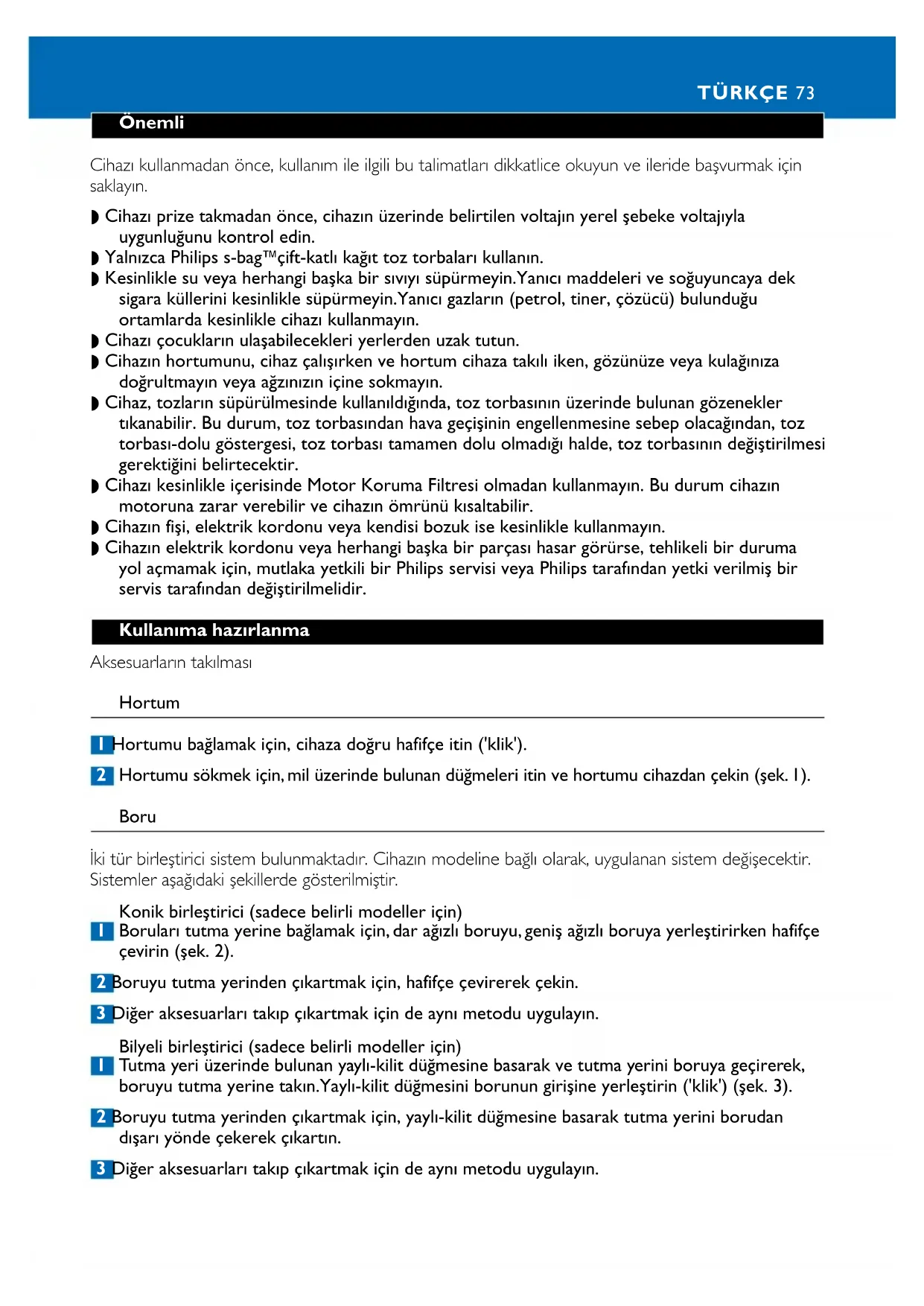 (. 34). 72Önemli Cihazı kullanmadan önce, kullanım ile ilgili bu talimatları dikkatlice okuyun ve ileride başvurmak için saklayın. ◗ Cihazı prize takmadan önce, cihazın üzerinde belirtilen voltajın yerel şebeke voltajıyla uygunluğunu kontrol edin. ◗ Yalnızca Philips s-bag` çift-katlı kağıt toz torbaları kullanın. ◗ Kesinlikle su veya herhangi başka bir sıvıyı süpürmeyin.Yanıcı maddeleri ve soğuyuncaya dek sigara küllerini kesinlikle süpürmeyin.Yanıcı gazların (petrol, tiner, çözücü) bulunduğu ortamlarda kesinlikle cihazı kullanmayın. ◗ Cihazı çocukların ulaşabilecekleri yerlerden uzak tutun. ◗ Cihazın hortumunu, cihaz çalışırken ve hortum cihaza takılı iken, gözünüze veya kulağınıza doğrultmayın veya ağzınızın içine sokmayın. ◗ Cihaz, tozların süpürülmesinde kullanıldığında, toz torbasının üzerinde bulunan gözenekler tıkanabilir. Bu durum, toz torbasından hava geçişinin engellenmesine sebep olacağından, toz torbası-dolu göstergesi, toz torbası tamamen dolu olmadığı halde, toz torbasının değiştirilmesi gerektiğini belirtecektir. ◗ Cihazı kesinlikle içerisinde Motor Koruma Filtresi olmadan kullanmayın. Bu durum cihazın motoruna zarar verebilir ve cihazın ömrünü kısaltabilir. ◗ Cihazın fişi, elektrik kordonu veya kendisi bozuk ise kesinlikle kullanmayın. ◗ Cihazın elektrik kordonu veya herhangi başka bir parçası hasar görürse, tehlikeli bir duruma yol açmamak için, mutlaka yetkili bir Philips servisi veya Philips tarafından yetki verilmiş bir servis tarafından değiştirilmelidir. Kullanıma hazırlanma Aksesuarların takılması Hortum 1 Hortumu bağlamak için, cihaza doğru hafifçe itin ('klik'). 2 Hortumu sökmek için, mil üzerinde bulunan düğmeleri itin ve hortumu cihazdan çekin (şek. 1). Boru İki tür birleştirici sistem bulunmaktadır. Cihazın modeline bağlı olarak, uygulanan sistem değişecektir. Sistemler aşağıdaki şekillerde gösterilmiştir. Konik birleştirici (sadece belirli modeller için) 1 Boruları tutma yerine bağlamak için, dar ağızlı boruyu, geniş ağızlı boruya yerleştirirken hafifçe çevirin (şek. 2). 2 Boruyu tutma yerinden çıkartmak için, hafifçe çevirerek çekin. 3 Diğer aksesuarları takıp çıkartmak için de aynı metodu uygulayın. Bilyeli birleştirici (sadece belirli modeller için) 1 Tutma yeri üzerinde bulunan yaylı-kilit düğmesine basarak ve tutma yerini boruya geçirerek, boruyu tutma yerine takın.Yaylı-kilit düğmesini borunun girişine yerleştirin ('klik') (şek. 3). 2 Boruyu tutma yerinden çıkartmak için, yaylı-kilit düğmesine basarak tutma yerini borudan dışarı yönde çekerek çıkartın. 3 Diğer aksesuarları takıp çıkartmak için de aynı metodu uygulayın. TÜRKÇE 73Teleskobik boru (sadece belirli modeller için) 1 Boru boyunu, süpürme işlemi esnasında en rahat olacak şekilde kendinize göre ayarlayın (şek. 4). 360 Derece dönebilen temizleme başlığı (sadece belirli modeller için) ◗ 360 Derece dönebilen temizleme başlığını halı veya sert zeminlerde kullanabilirsiniz. Başlık 4 ayrı pozisyonda kullananılarak ulaşılması zor yerleri temizlemenizi sağlar. Başlık 360 derece saat yönünde veya saat yönünün tersine dönebilir. Başlık uzunlamasına tutulduğunda, emiş gücü başlığın ön kısmında toplanır (şek. 5). ◗ Başlığı istediğiniz zeminde ve istediğiniz mekanda kullanmak için, ayağınızı başlık üzerinde belirtildiği şekilde başlığın üzerine koyarak, boruyu başlık istenilen yöne ayarlanana dek çevirebilirsiniz (şek. 6). ◗ Geniş mekanlarda sert zeminleri, başlığı enine doğru çevirerek, fırçalarını dışarı çıkartarak temizleyebilirsiniz. Başlıktan fırçalar çıkıncaya kadar ve başlık enlemesine bir pozisyon alıncaya kadar boruyu çevirin (şek. 7). ◗ Dar mekanlarda sert zeminleri, başlığı uzunlamasına çevirerek, fırçalarını dışarı çıkartarak temizleyebilirsiniz. Boruyu 90 derece saat yönünün tersine çevirerek ve fırça şeridini dışarı çıkarana ve başlık enlemesine bir pozisyon alıncaya kadar çevirin (şek. 8). ◗ Geniş mekanlarda yumuşak zeminleri, başlığı enine doğru çevirerek ve fırçalarını içeriye çekerek temizleyebilirsiniz. Boruyu tekrar 90 derece saat yönünün tersine çevirip, başlığın enlemesine bir pozisyon almasını sağlayın ve fırçaları başlık içerisine çekin (şek. 9). ◗ Dar mekanlarda yumuşak yüzeyleri, başlığı uzunlamasına çevirerek ve fırçalarını içeriye çekerek temizleyebilirsiniz. Boruyu tekrar 90 derece saat yönünün tersine çevirip, başlığın uzunlamasına bir pozisyon almasını sağlayın ve fırçaları başlık içerisine çekin (şek. 10). Çok amaçlı başlık (sadece belirli modeller için) Çok amaçlı başlık tüm hacmi ve hatta kendi çevresinde bile aktif şekilde temizlik yapabilir. Bu yüzden, süpürgelik, mobilya ve kapı eşiklerinin temizliği için uygundur. 1 Çok amaçlı başlık sert ve yumuşak zeminlerin temizliğinde kullanılabilir (şek. 11). - Sert zeminleri temizlemek için, fırçaları dışarı çıkarın (parke, seramik, taş ve sentetik zeminler). - Yumuşak zeminleri temizlemek için, fırçaları içeri çekin (halı ve kilim). Oluklu parça, küçük başlık ve küçük fırça 1 Oluklu parçayı (1), küçük başlığı (2) veya küçük fırçayı (3) doğrudan tutma yerine veya boruya takın (şek. 12). Aksesuar saklama yuvası 1 Aksesuar saklama yuvası kolaylıkla tutma yerine takılabilir (şek. 13). ◗ Aksesuarlar yuvaya 2 şekilde yerleştirilebilir. 2 Oluklu parça ve küçük temizleme başlığı aksesuar yuvasında, yuvaya itilerek saklanabilir. Geri çıkarmak için, yuvadan çekin (şek. 14). Küçük başlığı aksesuar saklama yuvasına yerleştirirken özen gösterin. 3 Küçük temizleme başlığı ye