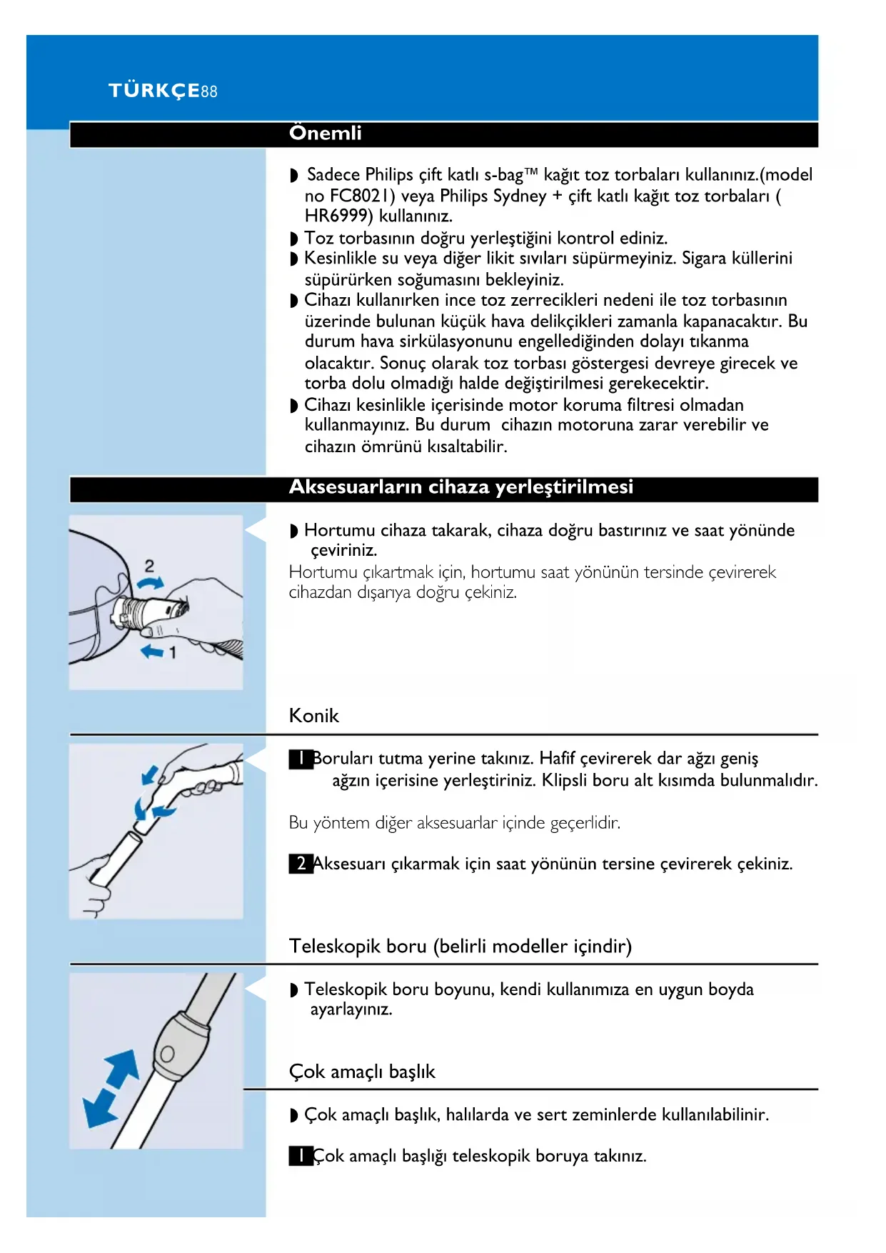 87Önemli ◗ Sadece Philips çift katlı s-bag` kağıt toz torbaları kullanınız.(model no FC8021) veya Philips Sydney + çift katlı kağıt toz torbaları ( HR6999) kullanınız. ◗ Toz torbasının doğru yerleştiğini kontrol ediniz. ◗ Kesinlikle su veya diğer likit sıvıları süpürmeyiniz. Sigara küllerini süpürürken soğumasını bekleyiniz. ◗ Cihazı kullanırken ince toz zerrecikleri nedeni ile toz torbasının üzerinde bulunan küçük hava delikçikleri zamanla kapanacaktır. Bu durum hava sirkülasyonunu engellediğinden dolayı tıkanma olacaktır. Sonuç olarak toz torbası göstergesi devreye girecek ve torba dolu olmadığı halde değiştirilmesi gerekecektir. ◗ Cihazı kesinlikle içerisinde motor koruma filtresi olmadan kullanmayınız. Bu durum cihazın motoruna zarar verebilir ve cihazın ömrünü kısaltabilir. Aksesuarların cihaza yerleştirilmesi
