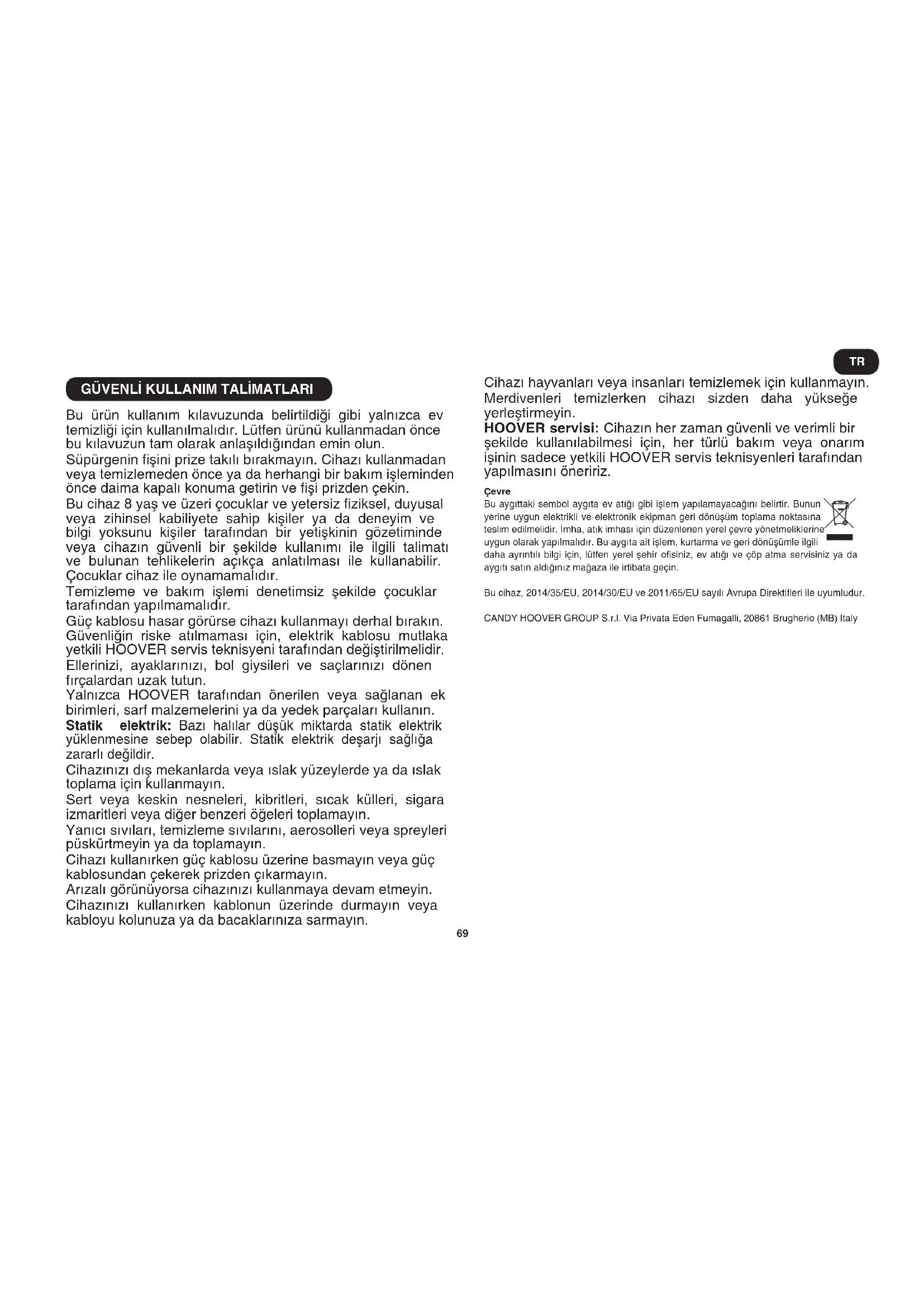 Bu ürün kullanım kılavuzunda belirtildiği gibi yalnızca ev temizliği için kullanılmalıdır. Lütfen ürünü kullanmadan önce bu kılavuzun tam olarak anlaşıldığından emin olun. Süpürgenin şini prize takılı bırakmayın. Cihazı kullanmadan veya temizlemeden önce ya da herhangi bir bakım işleminden önce daima kapalı konuma getirin ve şi prizden çekin. Bu cihaz 8 yaş ve üzeri çocuklar ve yetersiz ziksel, duyusal veya zihinsel kabiliyete sahip kişiler ya da deneyim ve bilgi yoksunu kişiler tarafından bir yetişkinin gözetiminde veya cihazın güvenli bir şekilde kullanımı ile ilgili talimatı ve bulunan tehlikelerin açıkça anlatılması ile kullanabilir. Çocuklar cihaz ile oynamamalıdır. Temizleme ve bakım işlemi denetimsiz şekilde çocuklar tarafından yapılmamalıdır. Güç kablosu hasar görürse cihazı kullanmayı derhal bırakın. Güvenliğin riske atılmaması için, elektrik kablosu mutlaka yetkili HOOVER servis teknisyeni tarafından değiştirilmelidir. Ellerinizi, ayaklarınızı, bol giysileri ve saçlarınızı dönen fırçalardan uzak tutun. Yalnızca HOOVER tarafından önerilen veya sağlanan ek birimleri, sarf malzemelerini ya da yedek parçaları kullanın. Statik elektrik: Bazı halılar düşük miktarda statik elektrik yüklenmesine sebep olabilir. Statik elektrik deşarjı sağlığa zararlı değildir. Cihazınızı dış mekanlarda veya ıslak yüzeylerde ya da ıslak toplama için kullanmayın. Sert veya keskin nesneleri, kibritleri, sıcak külleri, sigara izmaritleri veya diğer benzeri öğeleri toplamayın. Yanıcı sıvıları, temizleme sıvılarını, aerosolleri veya spreyleri püskürtmeyin ya da toplamayın. Cihazı kullanırken güç kablosu üzerine basmayın veya güç kablosundan çekerek prizden çıkarmayın. Arızalı görünüyorsa cihazınızı kullanmaya devam etmeyin. Cihazınızı kullanırken kablonun üzerinde durmayın veya kabloyu kolunuza ya da bacaklarınıza sarmayın. Cihazı hayvanları veya insanları temizlemek için kullanmayın. Merdivenleri temizlerken cihazı sizden daha yükseğe yerleştirmeyin. HOOVER servisi: Cihazın her zaman güvenli ve verimli bir şekilde kullanılabilmesi için, her türlü bakım veya onarım işinin sadece yetkili HOOVER servis teknisyenleri tarafından yapılmasını öneririz. Çevre Bu aygıttaki sembol aygıta ev atığı gibi işlem yapılamayacağını belirtir. Bunun yerine uygun elektrikli ve elektronik ekipman geri dönüşüm toplama noktasına teslim edilmelidir. İmha, atık imhası için düzenlenen yerel çevre yönetmeliklerine uygun olarak yapılmalıdır. Bu aygıta ait işlem, kurtarma ve geri dönüşümle ilgili daha ayrıntılı bilgi için, lütfen yerel şehir osiniz, ev atığı ve çöp atma servisiniz ya da aygıtı satın aldığınız mağaza ile irtibata geçin. Bu cihaz, 2014/35/EU, 2014/30/EU ve 2011/65/EU sayılı Avrupa Direktieri ile uyumludur. CANDY HOOVER GROUP S.r.l. Via Privata Eden Fumagalli, 20861 Brugherio (MB) Italy TR70