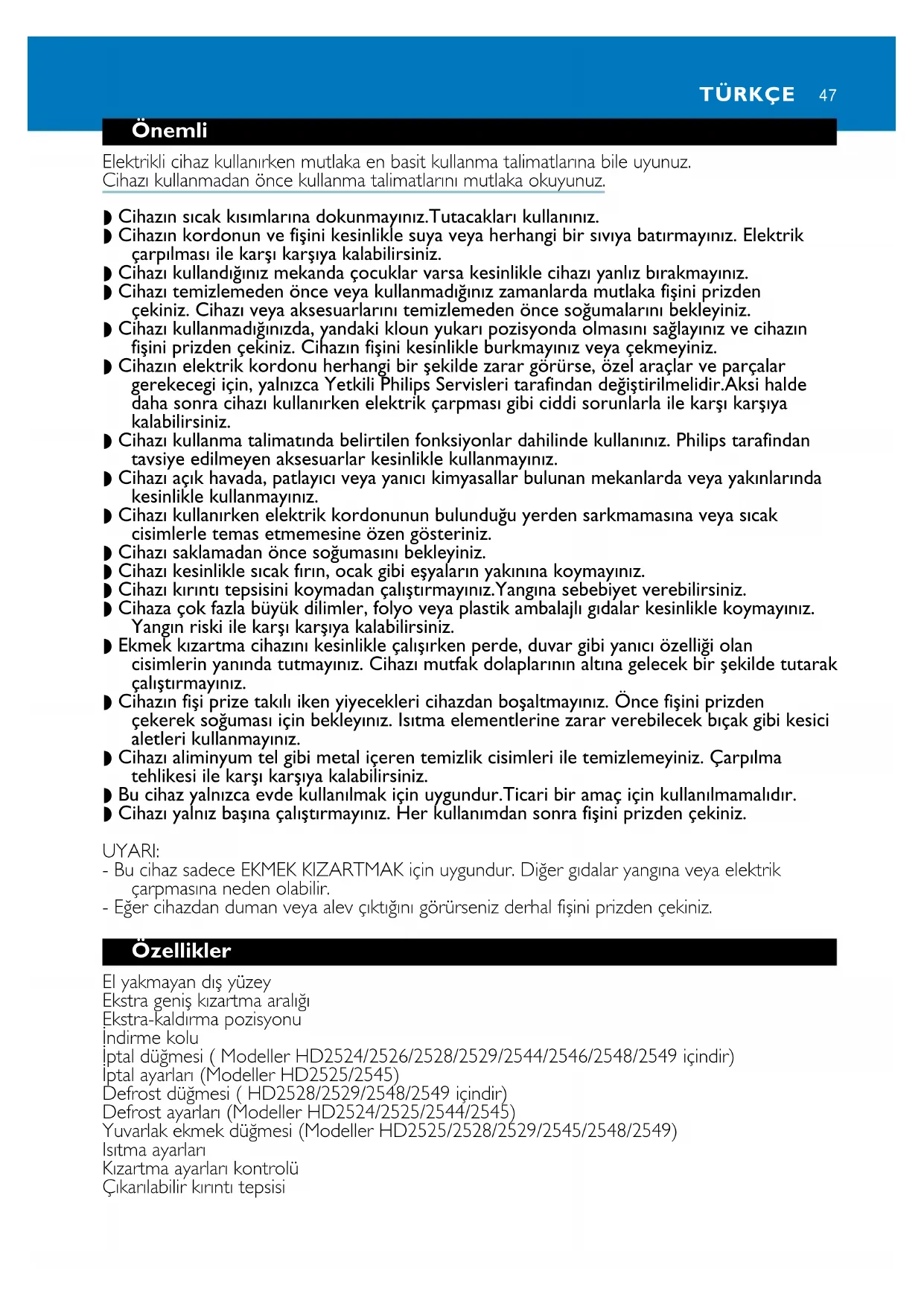 Philips. Önemli Elektrikli cihaz kullanırken mutlaka en basit kullanma talimatlarına bile uyunuz. Cihazı kullanmadan önce kullanma talimatlarını mutlaka okuyunuz. ◗ Cihazın sıcak kısımlarına dokunmayınız.Tutacakları kullanınız. ◗ Cihazın kordonun ve fişini kesinlikle suya veya herhangi bir sıvıya batırmayınız. Elektrik çarpılması ile karşı karşıya kalabilirsiniz. ◗ Cihazı kullandığınız mekanda çocuklar varsa kesinlikle cihazı yanlız bırakmayınız. ◗ Cihazı temizlemeden önce veya kullanmadığınız zamanlarda mutlaka fişini prizden çekiniz. Cihazı veya aksesuarlarını temizlemeden önce soğumalarını bekleyiniz. ◗ Cihazı kullanmadığınızda, yandaki kloun yukarı pozisyonda olmasını sağlayınız ve cihazın fişini prizden çekiniz. Cihazın fişini kesinlikle burkmayınız veya çekmeyiniz. ◗ Cihazın elektrik kordonu herhangi bir şekilde zarar görürse, özel araçlar ve parçalar gerekecegi için, yalnızca Yetkili Philips Servisleri tarafindan değiştirilmelidir.Aksi halde daha sonra cihazı kullanırken elektrik çarpması gibi ciddi sorunlarla ile karşı karşıya kalabilirsiniz. ◗ Cihazı kullanma talimatında belirtilen fonksiyonlar dahilinde kullanınız. Philips tarafindan tavsiye edilmeyen aksesuarlar kesinlikle kullanmayınız. ◗ Cihazı açık havada, patlayıcı veya yanıcı kimyasallar bulunan mekanlarda veya yakınlarında kesinlikle kullanmayınız. ◗ Cihazı kullanırken elektrik kordonunun bulunduğu yerden sarkmamasına veya sıcak cisimlerle temas etmemesine özen gösteriniz. ◗ Cihazı saklamadan önce soğumasını bekleyiniz. ◗ Cihazı kesinlikle sıcak fırın, ocak gibi eşyaların yakınına koymayınız. ◗ Cihazı kırıntı tepsisini koymadan çalıştırmayınız.Yangına sebebiyet verebilirsiniz. ◗ Cihaza çok fazla büyük dilimler, folyo veya plastik ambalajlı gıdalar kesinlikle koymayınız. Yangın riski ile karşı karşıya kalabilirsiniz. ◗ Ekmek kızartma cihazını kesinlikle çalışırken perde, duvar gibi yanıcı özelliği olan cisimlerin yanında tutmayınız. Cihazı mutfak dolaplarının altına gelecek bir şekilde tutarak çalıştırmayınız. ◗ Cihazın fişi prize takılı iken yiyecekleri cihazdan boşaltmayınız. Önce fişini prizden çekerek soğuması için bekleyınız. Isıtma elementlerine zarar verebilecek bıçak gibi kesici aletleri kullanmayınız. ◗ Cihazı aliminyum tel gibi metal içeren temizlik cisimleri ile temizlemeyiniz. Çarpılma tehlikesi ile karşı karşıya kalabilirsiniz. ◗ Bu cihaz yalnızca evde kullanılmak için uygundur.Ticari bir amaç için kullanılmamalıdır. ◗ Cihazı yalnız başına çalıştırmayınız. Her kullanımdan sonra fişini prizden çekiniz. UYARI: - Bu cihaz sadece EKMEK KIZARTMAK için uygundur. Diğer gıdalar yangına veya elektrik çarpmasına neden olabilir. - Eğer cihazdan duman veya alev çıktığını görürseniz derhal fişini prizden çekiniz. Özellikler El yakmayan dış yüzey Ekstra geniş kızartma aralığı Ekstra-kaldırma pozisyonu İndirme kolu İptal düğmesi ( Modeller HD2524/2526/2528/2529/2544/2546/2548/2549 içindir) İptal ayarları (Modeller HD2525/2545) Defrost düğmesi ( HD2528/2529/2548/2549 içindir) Defrost ayarları (Modeller HD2524/2525/2544/2545) Yuvarlak ekmek düğmesi (Modeller HD2525/2528/2529/2545/2548/2549) Isıtma ayarları Kızartma ayarları kontrolü Çıkarılabilir kırıntı tepsisi