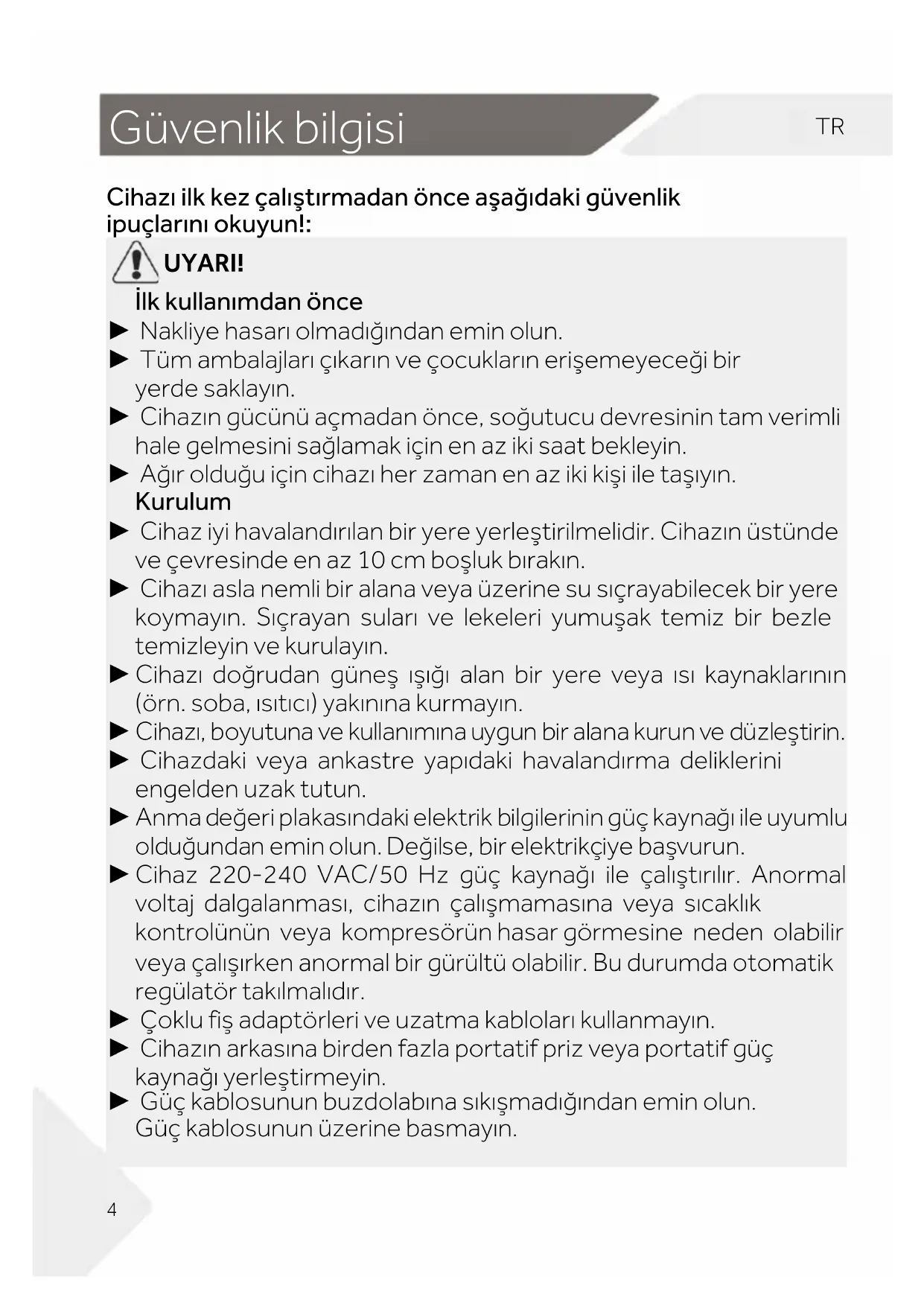 UYARI! İlk kullanımdan önce ► Nakliye hasarı olmadığından emin olun. ► Tüm ambalajları çıkarın ve çocukların erişemeyeceği bir yerde saklayın. ► Cihazın gücünü açmadan önce, soğutucu devresinin tam verimli hale gelmesini sağlamak için en az iki saat bekleyin. ► Ağır olduğu için cihazı her zaman en az iki kişi ile taşıyın. Kurulum ► Cihaz iyi havalandırılan bir yere yerleştirilmelidir. Cihazın üstünde ve çevresinde en az 10 cm boşluk bırakın. ► Cihazı asla nemli bir alana veya üzerine su sıçrayabilecek bir yere koymayın. Sıçrayan suları ve lekeleri yumuşak temiz bir bezle temizleyin ve kurulayın. ► Cihazı doğrudan güneş ışığı alan bir yere veya ısı kaynaklarının (örn. soba, ısıtıcı) yakınına kurmayın. ► Cihazı, boyutuna ve kullanımına uygun bir alana kurun ve düzleştirin. ► Cihazdaki veya ankastre yapıdaki havalandırma deliklerini engelden uzak tutun. ► Anma değeri plakasındaki elektrik bilgilerinin güç kaynağı ile uyumlu olduğundan emin olun. Değilse, bir elektrikçiye başvurun. ► Cihaz 220-240 VAC/50 Hz güç kaynağı ile çalıştırılır. Anormal voltaj dalgalanması, cihazın çalışmamasına veya sıcaklık kontrolünün veya kompresörün hasar görmesine neden olabilir veya çalışırken anormal bir gürültü olabilir. Bu durumda otomatik regülatör takılmalıdır. ► Çoklu fiş adaptörleri ve uzatma kabloları kullanmayın. ► Cihazın arkasına birden fazla portatif priz veya portatif güç kaynağı yerleştirmeyin. ► Güç kablosunun buzdolabına sıkışmadığından emin olun. Güç kablosunun üzerine basmayın.TR Güvenlik bilgisi