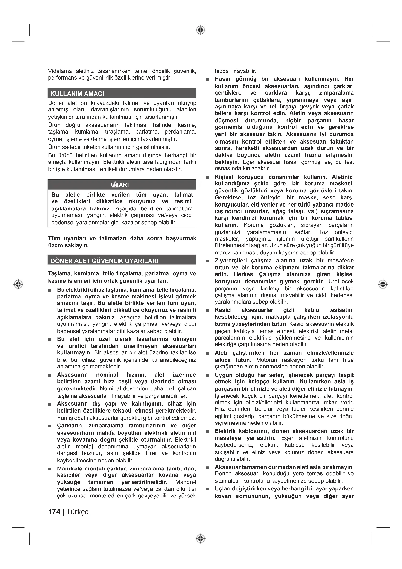 cihazlarının sağlam bir şekilde sıkıldığından emin olun. Gevşek alıştırma, cihazların beklenmedik anda kayarak kontrol kaybına neden olabilir, gevşek döner aksam şiddetle fırlatılabilir. ■ Taşırken aletinizi çalıştırmayın. Dönen aksesuar kıyafetleriniz kapabilir ve sizi ciddi bir şekilde yaralayabilir. ■ Aleetin havalandırma boşluklarını düzenli olarak temizleyin. Motorun havalandırılması, motor karteri içerisine toz girmesine sebep olur ve bu da metalik partiküllerin aşırı şekilde toplanmasına elektrik çarpmalarına sebep olabilir. ■ Aletinizi yanıcı unsurların yanında kullanmayın. Kıvılcımlar bunların tutuşmasına sebep olabilir. ■ Soğutma sıvıları gerektiren aksesuarlar kullanmayın. Su veya soğutma sıvısının kullanılması, elektrik çarpmasıne veya buna bağlı ölümlere sebep olabilir.