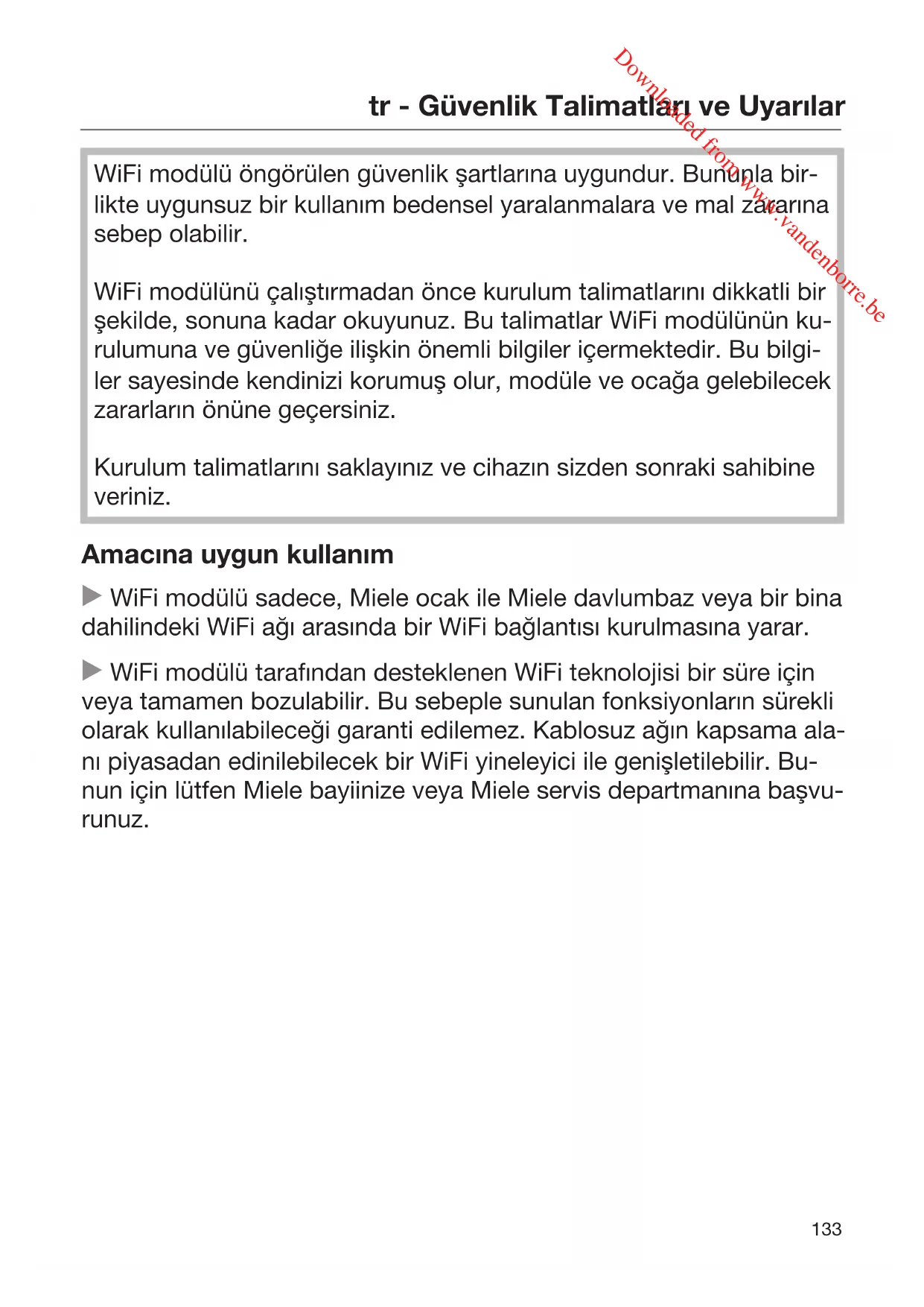 WiFi modülü öngörülen güvenlik şartlarına uygundur. Bununla bir- likte uygunsuz bir kullanım bedensel yaralanmalara ve mal zararına sebep olabilir. WiFi modülünü çalıştırmadan önce kurulum talimatlarını dikkatli bir şekilde, sonuna kadar okuyunuz. Bu talimatlar WiFi modülünün ku- rulumuna ve güvenliğe ilişkin önemli bilgiler içermektedir. Bu bilgi- ler sayesinde kendinizi korumuş olur, modüle ve ocağa gelebilecek zararların önüne geçersiniz. Kurulum talimatlarını saklayınız ve cihazın sizden sonraki sahibine veriniz. Amacına uygun kullanım WiFi modülü sadece, Miele ocak ile Miele davlumbaz veya bir bina dahilindeki WiFi ağı arasında bir WiFi bağlantısı kurulmasına yarar. WiFi modülü tarafından desteklenen WiFi teknolojisi bir süre için veya tamamen bozulabilir. Bu sebeple sunulan fonksiyonların sürekli olarak kullanılabileceği garanti edilemez. Kablosuz ağın kapsama ala- nı piyasadan edinilebilecek bir WiFi yineleyici ile genişletilebilir. Bu- nun için lütfen Miele bayiinize veya Miele servis departmanına başvu- runuz. Downloaded from www.vandenborre.betr - Güvenlik Talimatları ve Uyarılar