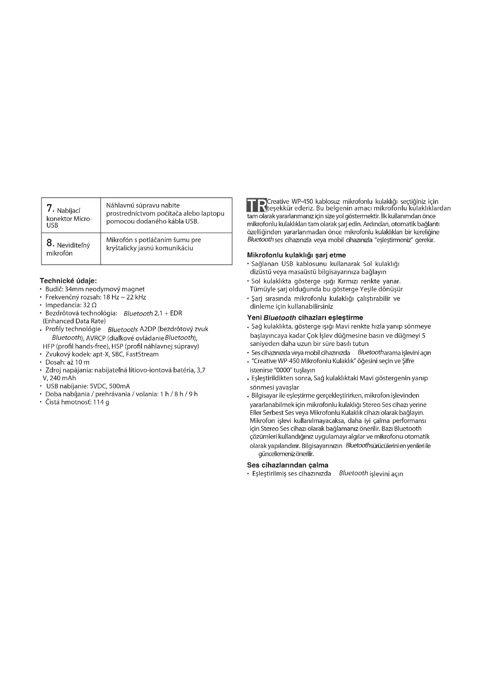 Creative WP-450 kablosuz mikrofonlu kulaklığı seçtiğiniz için teşekkür ederiz. Bu belgenin amacı mikrofonlu kulaklıklardan tam olarak yararlanmanız için size yol göstermektir. İlk kullanımdan önce mikrofonlu kulaklıkları tam olarak şarj edin. Ardından, otomatik bağlantı özelliğinden yararlanmadan önce mikrofonlu kulaklıkları bir kereliğine Bluetooth ses cihazınızla veya mobil cihazınızla “eşleştirmeniz” gerekir. Mikrofonlu kulaklığı şarj etme