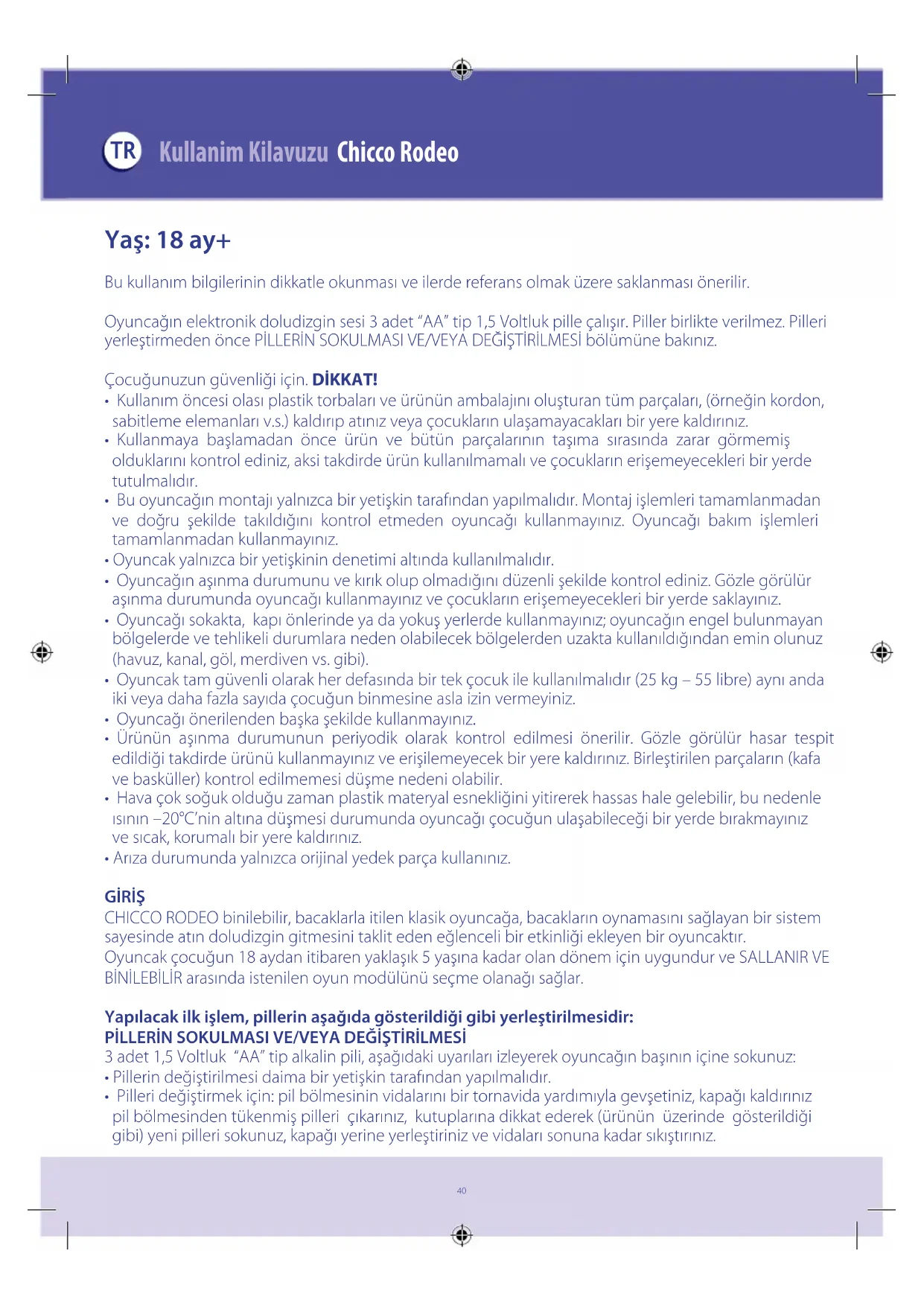 - Arıza durumunda yalnızca orijinal yedek parça kullanınız. GİRİŞ CHICCO RODEO binilebilir, bacaklarla itilen klasik oyuncağa, bacakların oynamasını sağlayan bir sistem sayesinde atın doludizgin gitmesini taklit eden eğlenceli bir etkinliği ekleyen bir oyuncaktır. Oyuncak çocuğun 18 aydan itibaren yaklaşık 5 yaşına kadar olan dönem için uygundur ve SALLANIR VE BİNİLEBİLİR arasında istenilen oyun modülünü seçme olanağı sağlar. Yapılacak ilk işlem, pillerin aşağıda gösterildiği gibi yerleştirilmesidir: PİLLERİN SOKULMASI VE/VEYA DEĞİŞTİRİLMESİ 3 adet 1,5 Voltluk “AA” tip alkalin pili, aşağıdaki uyarıları izleyerek oyuncağın başının içine sokunuz: