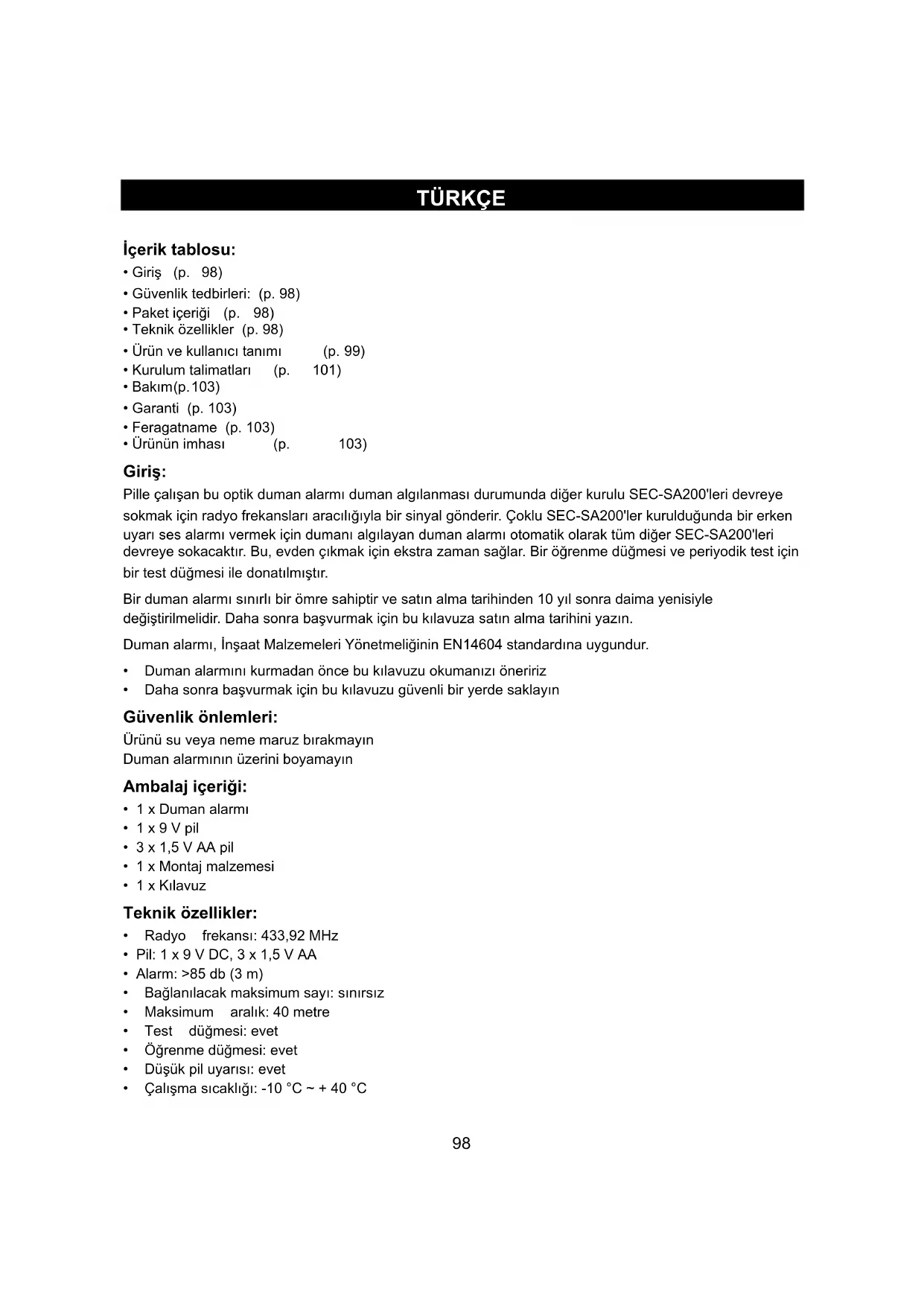 - Ürünün imhası (p. 103) Giriş: Pille çalışan bu optik duman alarmı duman algılanması durumunda diğer kurulu SEC-SA200'leri devreye sokmak için radyo frekansları aracılığıyla bir sinyal gönderir. Çoklu SEC-SA200'ler kurulduğunda bir erken uyarı ses alarmı vermek için dumanı algılayan duman alarmı otomatik olarak tüm diğer SEC-SA200'leri devreye sokacaktır. Bu, evden çıkmak için ekstra zaman sağlar. Bir öğrenme düğmesi ve periyodik test için bir test düğmesi ile donatılmıştır. Bir duman alarmı sınırlı bir ömre sahiptir ve satın alma tarihinden 10 yıl sonra daima yenisiyle değiştirilmelidir. Daha sonra başvurmak için bu kılavuza satın alma tarihini yazın. Duman alarmı, İnşaat Malzemeleri Yönetmeliğinin EN14604 standardına uygundur.