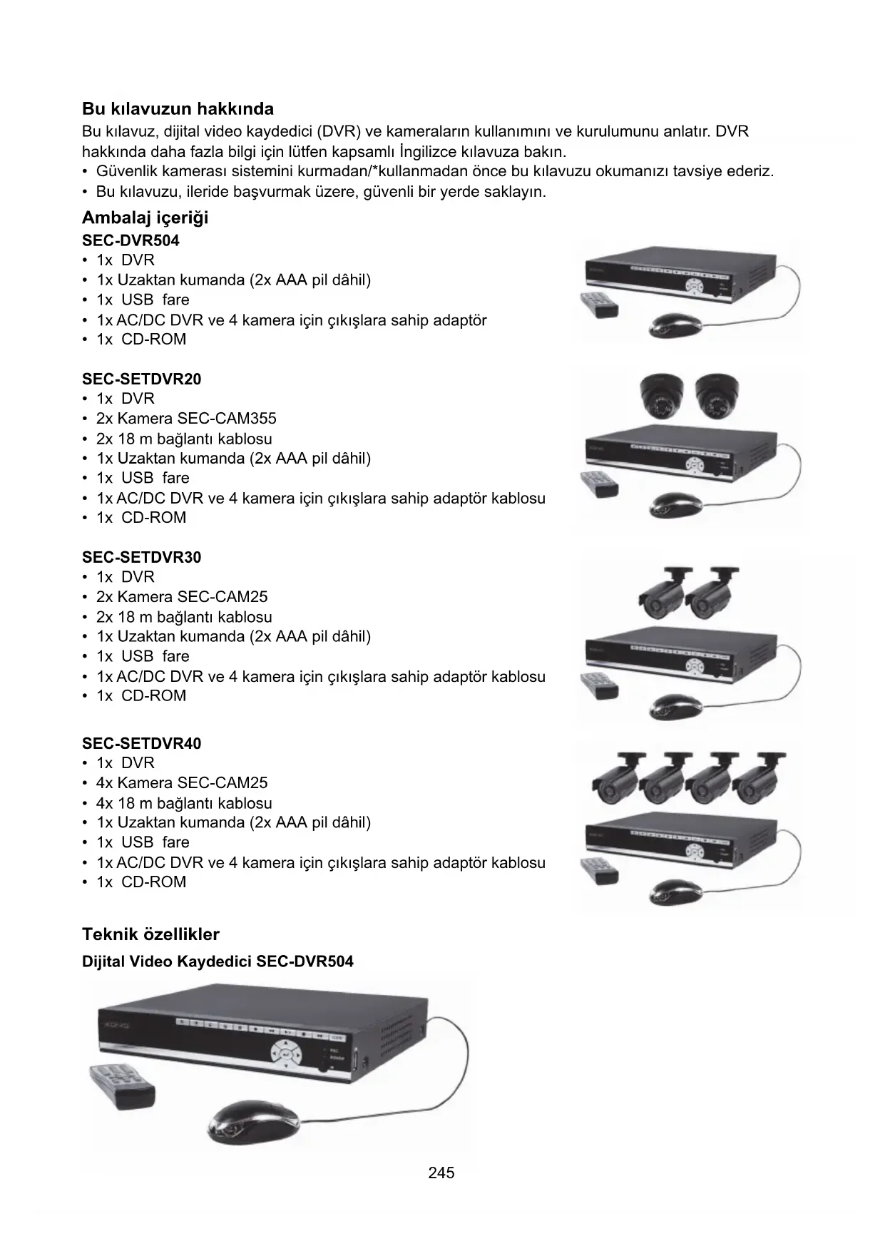 - Bu kılavuzu, ileride başvurmak üzere, güvenli bir yerde saklayın. Ambalaj içeriği SEC-DVR504