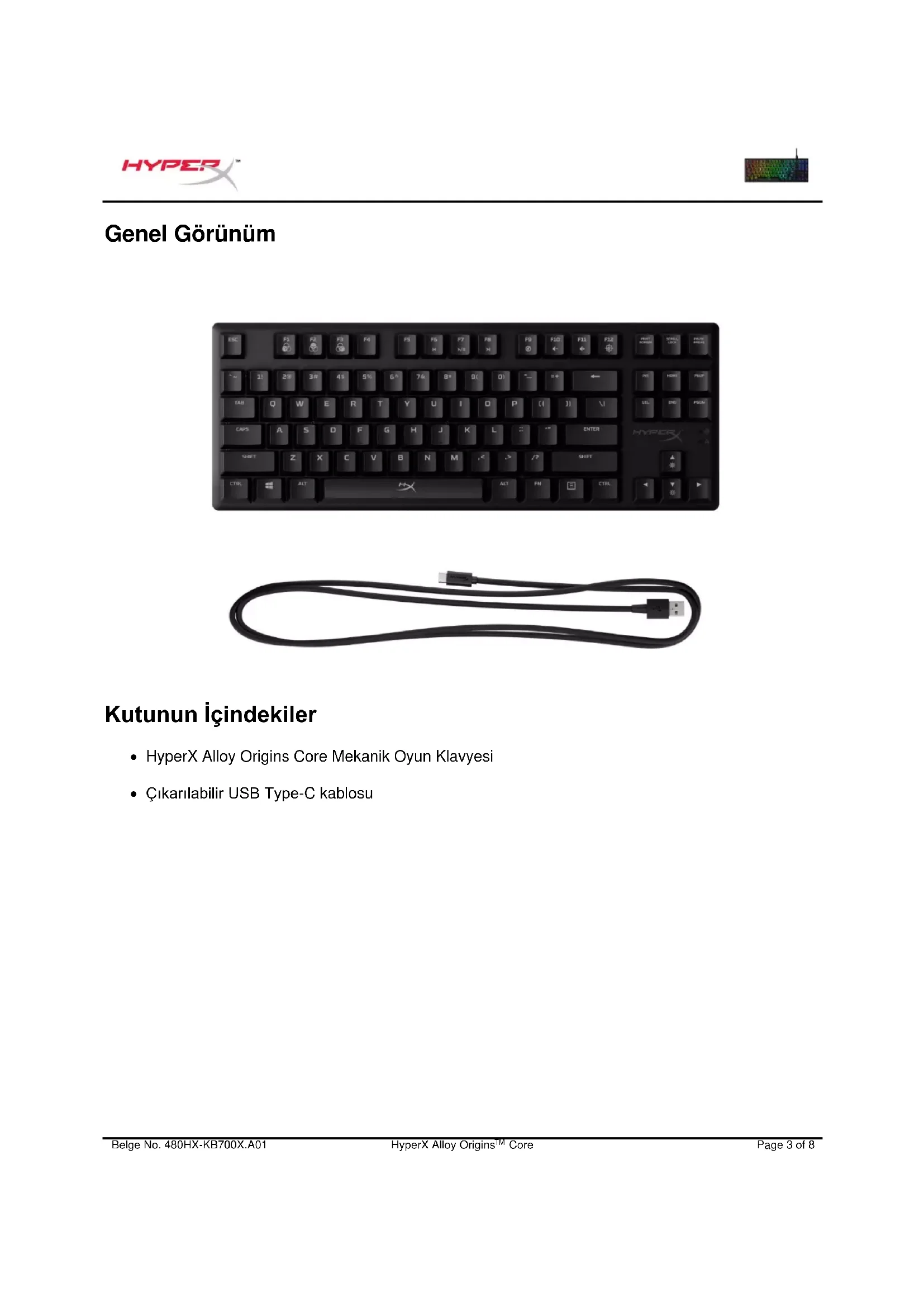 Genel Görünüm Kutunun İçindekiler HyperX Alloy Origins Core Mekanik Oyun Klavyesi Çıkarılabilir USB Type-C kablosuBelge No. 480HX-KB700X.A01 HyperX Alloy Origins