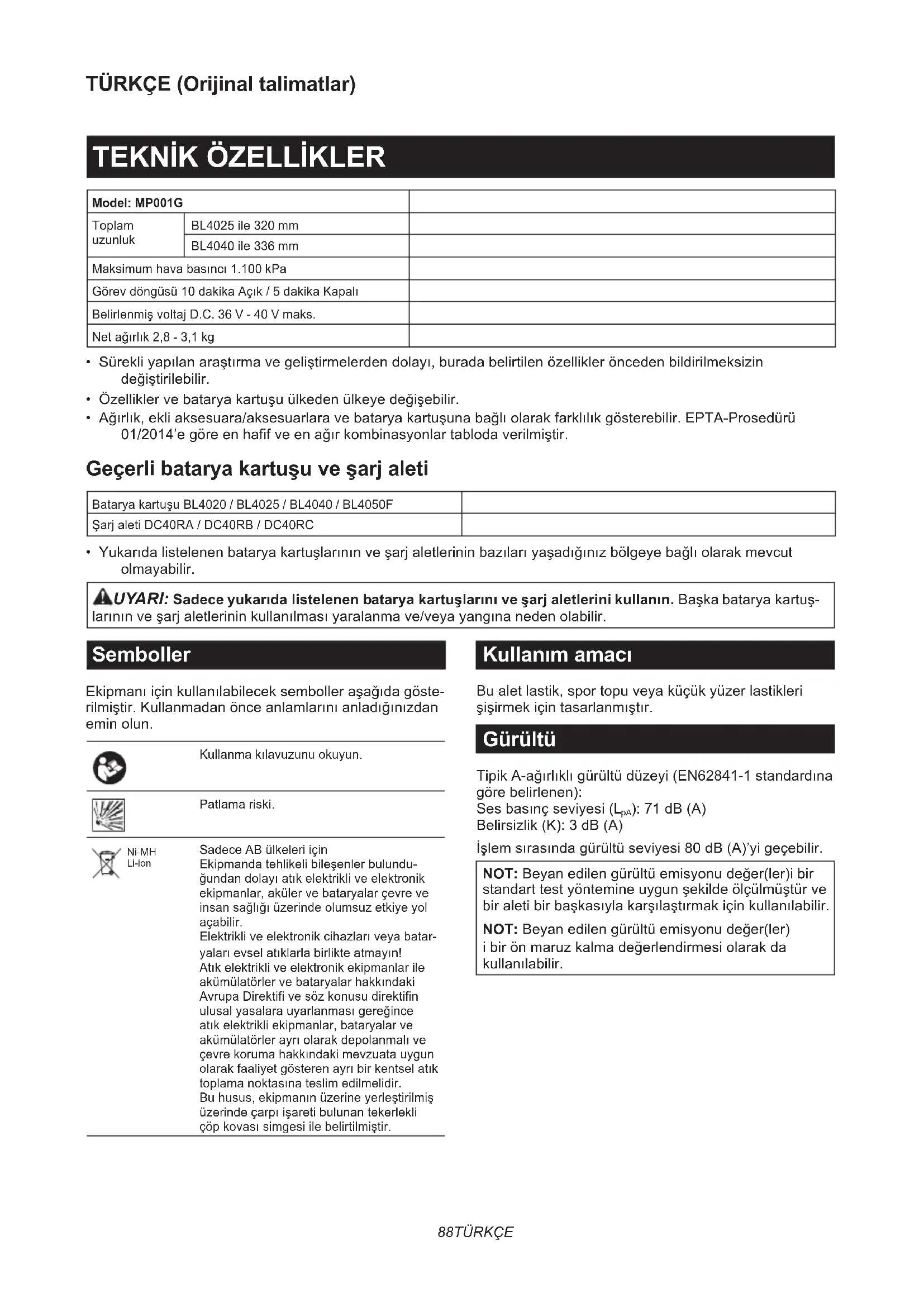 Model: MP001G Toplam uzunluk BL4025 ile 320 mm BL4040 ile 336 mm Maksimum hava basıncı 1.100 kPa Görev döngüsü 10 dakika Açık / 5 dakika Kapalı Belirlenmiş voltaj D.C. 36 V - 40 V maks. Net ağırlık 2,8 - 3,1 kg