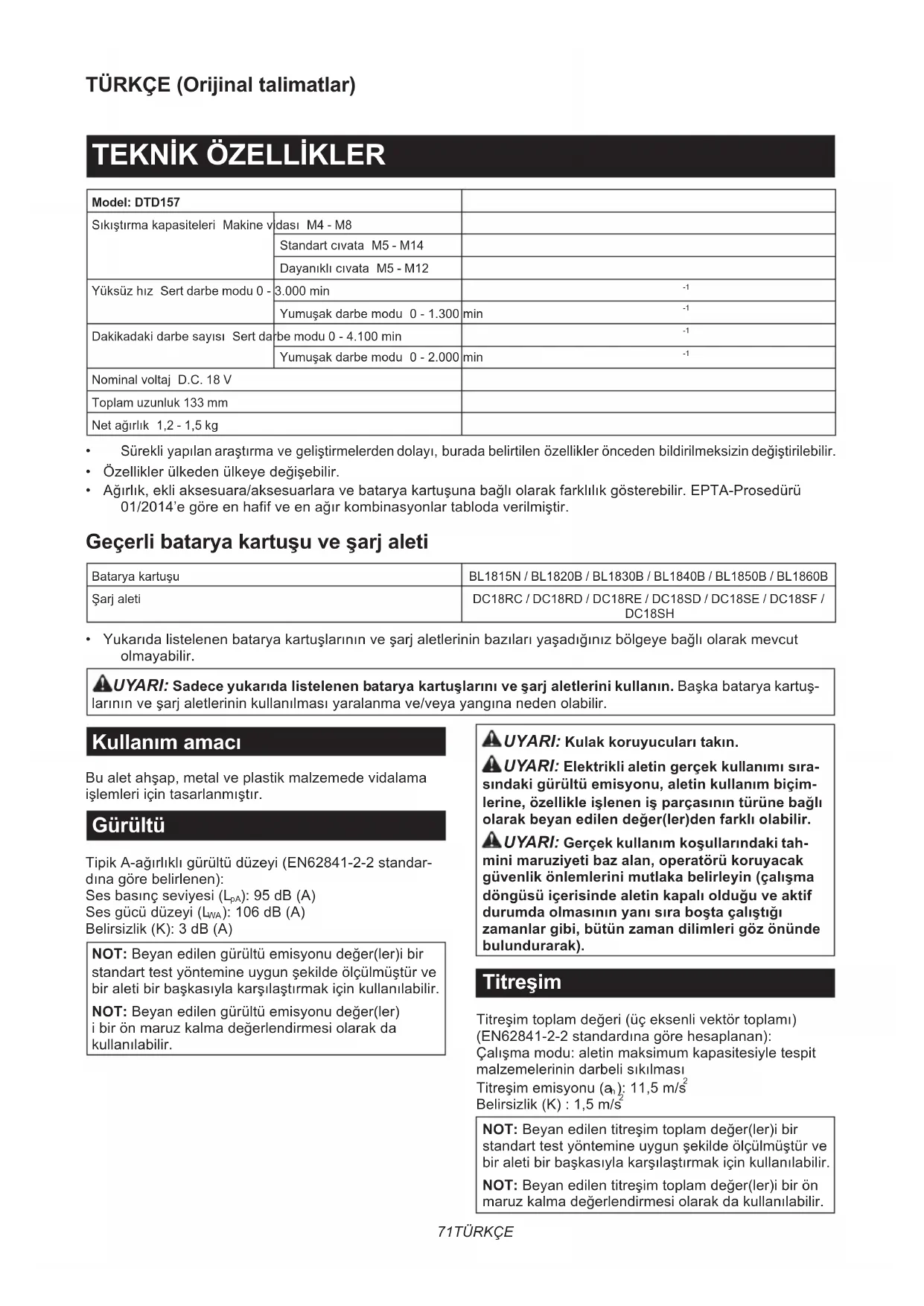 - Yukarıdalistelenenbataryakartuşlarınınveşarjaletlerininbazılarıyaşadığınızbölgeyebağlıolarakmevcut olmayabilir. UYARI: Sadece yukarıda listelenen batarya kartuşlarını ve şarj aletlerini kullanın.Başkabataryakartuş- larınınveşarjaletlerininkullanılmasıyaralanmave/veyayangınanedenolabilir. Kullanım amacı Bualetahşap,metalveplastikmalzemedevidalama işlemleriiçintasarlanmıştır. Gürültü TipikA-ağırlıklıgürültüdüzeyi(EN62841-2-2standar- dınagörebelirlenen): Sesbasınçseviyesi(L