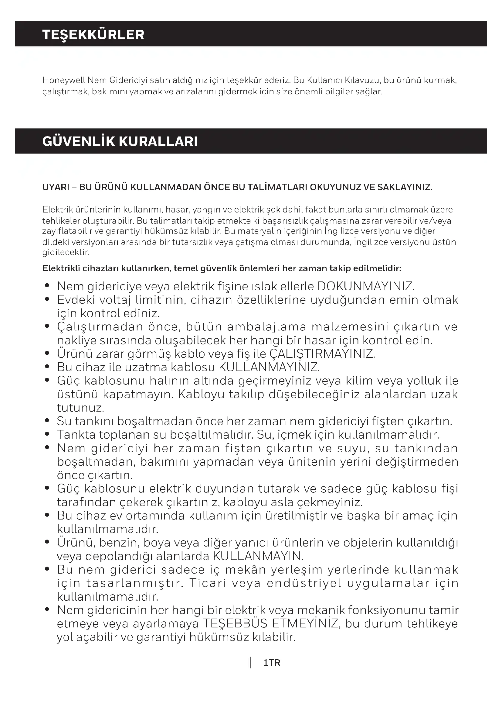 Honeywell Nem Gidericiyi satın aldığınız için teşekkür ederiz. Bu Kullanıcı Kılavuzu, bu ürünü kurmak, çalıştırmak, bakımını yapmak ve arızalarını gidermek için size önemli bilgiler sağlar. UYARI – BU ÜRÜNÜ KULLANMADAN ÖNCE BU TALİMATLARI OKUYUNUZ VE SAKLAYINIZ. Elektrik ürünlerinin kullanımı, hasar, yangın ve elektrik şok dahil fakat bunlarla sınırlı olmamak üzere tehlikeler oluşturabilir. Bu talimatları takip etmekte ki başarısızlık çalışmasına zarar verebilir ve/veya zayıflatabilir ve garantiyi hükümsüz kılabilir. Bu materyalin içeriğinin İngilizce versiyonu ve diğer dildeki versiyonları arasında bir tutarsızlık veya çatışma olması durumunda, İngilizce versiyonu üstün gidilecektir. Elektrikli cihazları kullanırken, temel güvenlik önlemleri her zaman takip edilmelidir: Nem gidericiye veya elektrik fişine ıslak ellerle DOKUNMAYINIZ. Evdeki voltaj limitinin, cihazın özelliklerine uyduğundan emin olmak için kontrol ediniz. Çalıştırmadan önce, bütün ambalajlama malzemesini çıkartın ve nakliye sırasında oluşabilecek her hangi bir hasar için kontrol edin. Ürünü zarar görmüş kablo veya fiş ile ÇALIŞTIRMAYINIZ. Bu cihaz ile uzatma kablosu KULLANMAYINIZ. Güç kablosunu halının altında geçirmeyiniz veya kilim veya yolluk ile üstünü kapatmayın. Kabloyu takılıp düşebileceğiniz alanlardan uzak tutunuz. Su tankını boşaltmadan önce her zaman nem gidericiyi fişten çıkartın. Tankta toplanan su boşaltılmalıdır. Su, içmek için kullanılmamalıdır. Nem gidericiyi her zaman fişten çıkartın ve suyu, su tankından boşaltmadan, bakımını yapmadan veya ünitenin yerini değiştirmeden önce çıkartın. Güç kablosunu elektrik duyundan tutarak ve sadece güç kablosu fişi tarafından çekerek çıkartınız, kabloyu asla çekmeyiniz. Bu cihaz ev ortamında kullanım için üretilmiştir ve başka bir amaç için kullanılmamalıdır. Ürünü, benzin, boya veya diğer yanıcı ürünlerin ve objelerin kullanıldığı veya depolandığı alanlarda KULLANMAYIN. Bu nem giderici sadece iç mekân yerleşim yerlerinde kullanmak için tasarlanmıştır. Ticari veya endüstriyel uygulamalar için kullanılmamalıdır. Nem gidericinin her hangi bir elektrik veya mekanik fonksiyonunu tamir etmeye veya ayarlamaya TEŞEBBÜS ETMEYİNİZ, bu durum tehlikeye yol açabilir ve garantiyi hükümsüz kılabilir.