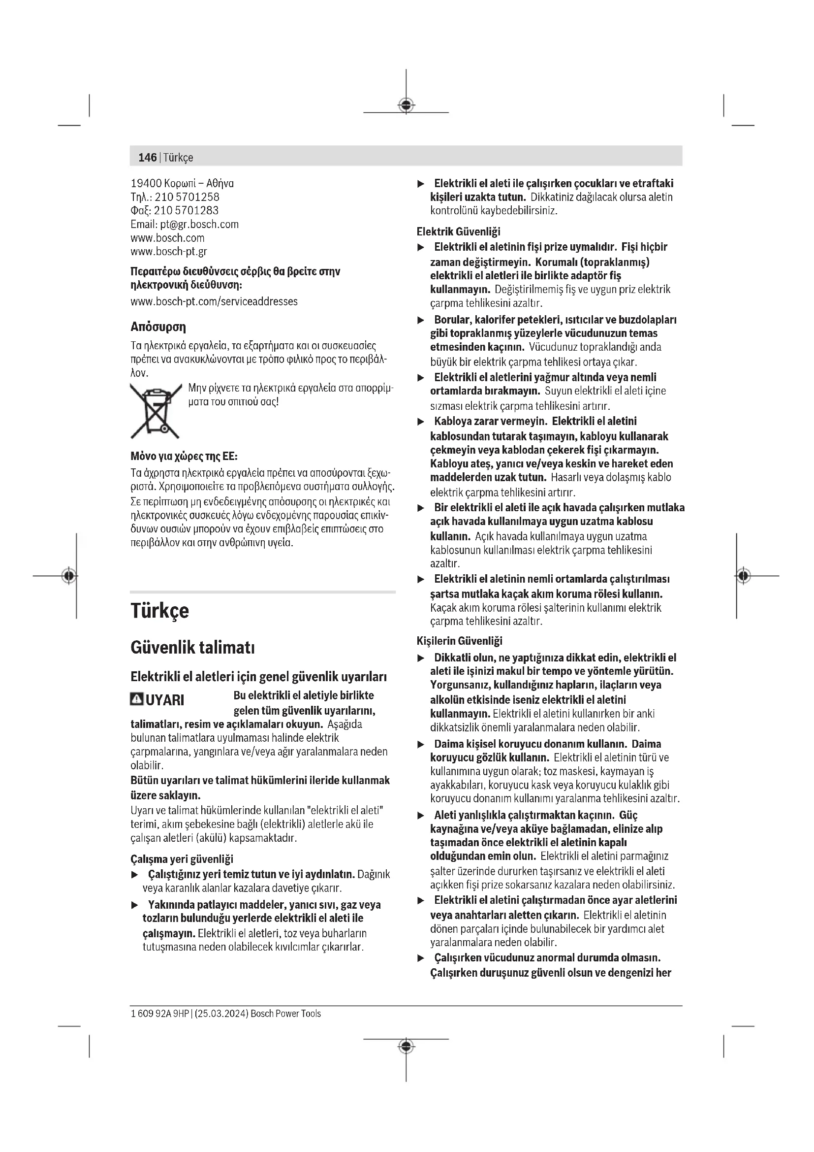 Μην ρίχνετε τα ηλεκτρικά εργαλεία στα απορρίμ- ματα του σπιτιού σας! Μόνο για χώρες τηςΕΕ: Τα άχρηστα ηλεκτρικά εργαλεία πρέπει να αποσύρονται ξεχω- ριστά. Χρησιμοποιείτε τα προβλεπόμενα συστήματα συλλογής. Σε περίπτωση μη ενδεδειγμένης απόσυρσης οι ηλεκτρικές και ηλεκτρονικές συσκευές λόγω ενδεχομένης παρουσίας επικίν- δυνων ουσιών μπορούν να έχουν επιβλαβείς επιπτώσεις στο περιβάλλον και στην ανθρώπινη υγεία. Türkçe Güvenlik talimatı Elektrikli el aletleri için genel güvenlik uyarıları UYARI Bu elektrikli el aletiyle birlikte gelen tüm güvenlik uyarılarını, talimatları, resim ve açıklamaları okuyun. Aşağıda bulunan talimatlara uyulmaması halinde elektrik çarpmalarına, yangınlara ve/veya ağır yaralanmalara neden olabilir. Bütün uyarıları ve talimat hükümlerini ileride kullanmak üzere saklayın. Uyarı ve talimat hükümlerinde kullanılan "elektrikli el aleti" terimi, akım şebekesine bağlı (elektrikli) aletlerle akü ile çalışan aletleri (akülü) kapsamaktadır. Çalışma yeri güvenliği u Çalıştığınız yeri temiz tutun ve iyi aydınlatın. Dağınık veya karanlık alanlar kazalara davetiye çıkarır. u Yakınında patlayıcı maddeler, yanıcı sıvı, gaz veya tozların bulunduğu yerlerde elektrikli el aleti ile çalışmayın. Elektrikli el aletleri, toz veya buharların tutuşmasına neden olabilecek kıvılcımlar çıkarırlar. u Elektrikli el aleti ile çalışırken çocukları ve etraftaki kişileri uzakta tutun. Dikkatiniz dağılacak olursa aletin kontrolünü kaybedebilirsiniz. Elektrik Güvenliği u Elektrikli el aletinin fişi prize uymalıdır. Fişi hiçbir zaman değiştirmeyin. Korumalı (topraklanmış) elektrikli el aletleri ile birlikte adaptör fiş kullanmayın. Değiştirilmemiş fiş ve uygun priz elektrik çarpma tehlikesini azaltır. u Borular, kalorifer petekleri, ısıtıcılar ve buzdolapları gibi topraklanmış yüzeylerle vücudunuzun temas etmesinden kaçının. Vücudunuz topraklandığı anda büyük bir elektrik çarpma tehlikesi ortaya çıkar. u Elektrikli el aletlerini yağmur altında veya nemli ortamlarda bırakmayın. Suyun elektrikli el aleti içine sızması elektrik çarpma tehlikesini artırır. u Kabloya zarar vermeyin. Elektrikli el aletini kablosundan tutarak taşımayın, kabloyu kullanarak çekmeyin veya kablodan çekerek fişi çıkarmayın. Kabloyu ateş, yanıcı ve/veya keskin ve hareket eden maddelerden uzak tutun. Hasarlı veya dolaşmış kablo elektrik çarpma tehlikesini artırır. u Bir elektrikli el aleti ile açık havada çalışırken mutlaka açık havada kullanılmaya uygun uzatma kablosu kullanın. Açık havada kullanılmaya uygun uzatma kablosunun kullanılması elektrik çarpma tehlikesini azaltır. u Elektrikli el aletinin nemli ortamlarda çalıştırılması şartsa mutlaka kaçak akım koruma rölesi kullanın. Kaçak akım koruma rölesi şalterinin kullanımı elektrik çarpma tehlikesini azaltır. Kişilerin Güvenliği u Dikkatli olun, ne yaptığınıza dikkat edin, elektrikli el aleti ile işinizi makul bir tempo ve yöntemle yürütün. Yorgunsanız, kullandığınız hapların, ilaçların veya alkolün etkisinde iseniz elektrikli el aletini kullanmayın. Elektrikli el aletini kullanırken bir anki dikkatsizlik önemli yaralanmalara neden olabilir. u Daima kişisel koruyucu donanım kullanın. Daima koruyucu gözlük kullanın. Elektrikli el aletinin türü ve kullanımına uygun olarak; toz maskesi, kaymayan iş ayakkabıları, koruyucu kask veya koruyucu kulaklık gibi koruyucu donanım kullanımı yaralanma tehlikesini azaltır. u Aleti yanlışlıkla çalıştırmaktan kaçının. Güç kaynağına ve/veya aküye bağlamadan, elinize alıp taşımadan önce elektrikli el aletinin kapalı olduğundan emin olun. Elektrikli el aletini parmağınız şalter üzerinde dururken taşırsanız ve elektrikli el aleti açıkken fişi prize sokarsanız kazalara neden olabilirsiniz. u Elektrikli el aletini çalıştırmadan önce ayar aletlerini veya anahtarları aletten çıkarın. Elektrikli el aletinin dönen parçaları içinde bulunabilecek bir yardımcı alet yaralanmalara neden olabilir. u Çalışırken vücudunuz anormal durumda olmasın. Çalışırken duruşunuz güvenli olsun ve dengenizi her 1 609 92A 9HP | (25.03.2024) Bosch Power ToolsTürkçe | 147 zaman koruyun. Bu sayede elektrikli el aletini beklenmedik durumlarda daha iyi kontrol edebilirsiniz. u Uygun iş elbiseleri giyin. Geniş giysiler giymeyin ve takı takmayın. Saçlarınızı ve giysileriniz aletin hareketli parçalarından uzak tutun. Bol giysiler, uzun saçlar veya takılar aletin hareketli parçaları tarafından tutulabilir. u Toz emme donanımı veya toz tutma tertibatı kullanırken, bunların bağlı olduğundan ve doğru kullanıldığından emin olun. Toz emme donanımının kullanımı tozdan kaynalanabilecek tehlikeleri azaltır. u Aletleri sık kullanmanız sebebiyle onlara alışmış olmanız, güvenlik prensiplerine uymanızı önlememelidir. Dikkatsiz bir hareket, bir anda ciddi yaralanmalara yol açabilir. Elektrikli el aletlerinin kullanımı ve bakımı u Elektrikli el aletini aşırı ölçüde zorlamayın. Yaptığınız işe uygun elektrikli el aletleri kullanın. Uygun performanslı elektrikli el aleti ile, belirlenen çalışma alanında daha iyi ve güvenli çalışırsınız. u Şalteri bozuk olan elektrikli el aletini kullanmayın. Açılıp kapanamayan bir elektrikli el aleti tehlikelidir ve onarılmalıdır. u Elektrikli el aletinde bir ayarlama işlemine başlamadan, herhangi bir aksesuarı değiştirirken vey