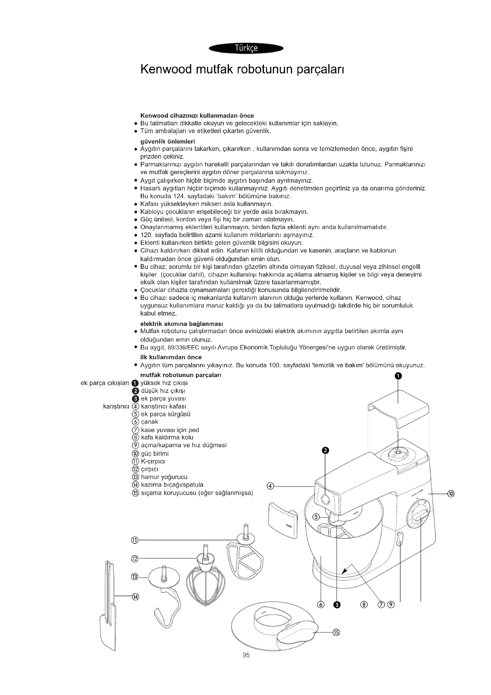 Aygıtın tüm parçalarını yıkayınız. Bu konuda 100. sayfadaki 'temizlik ve bakım' bölümünü okuyunuz. mutfak robotunun parçaları ek parça çıkı…ları yüksek hız çıkı…ı dü…ük hız çıkı…ı ek parça yuvası karı…tırıcı karı…tırıcı kafası ek parça sürgüsü çanak kase yuvası için ped kafa kaldırma kolu açma/kapama ve hız düòmesi güç birimi K-çırpıcı çırpıcı hamur yoòurucu kazıma bıçaòı/spatula sıçama koruyucusu (eğer sağlanmışsa) Kenwood mutfak robotunun parçaları