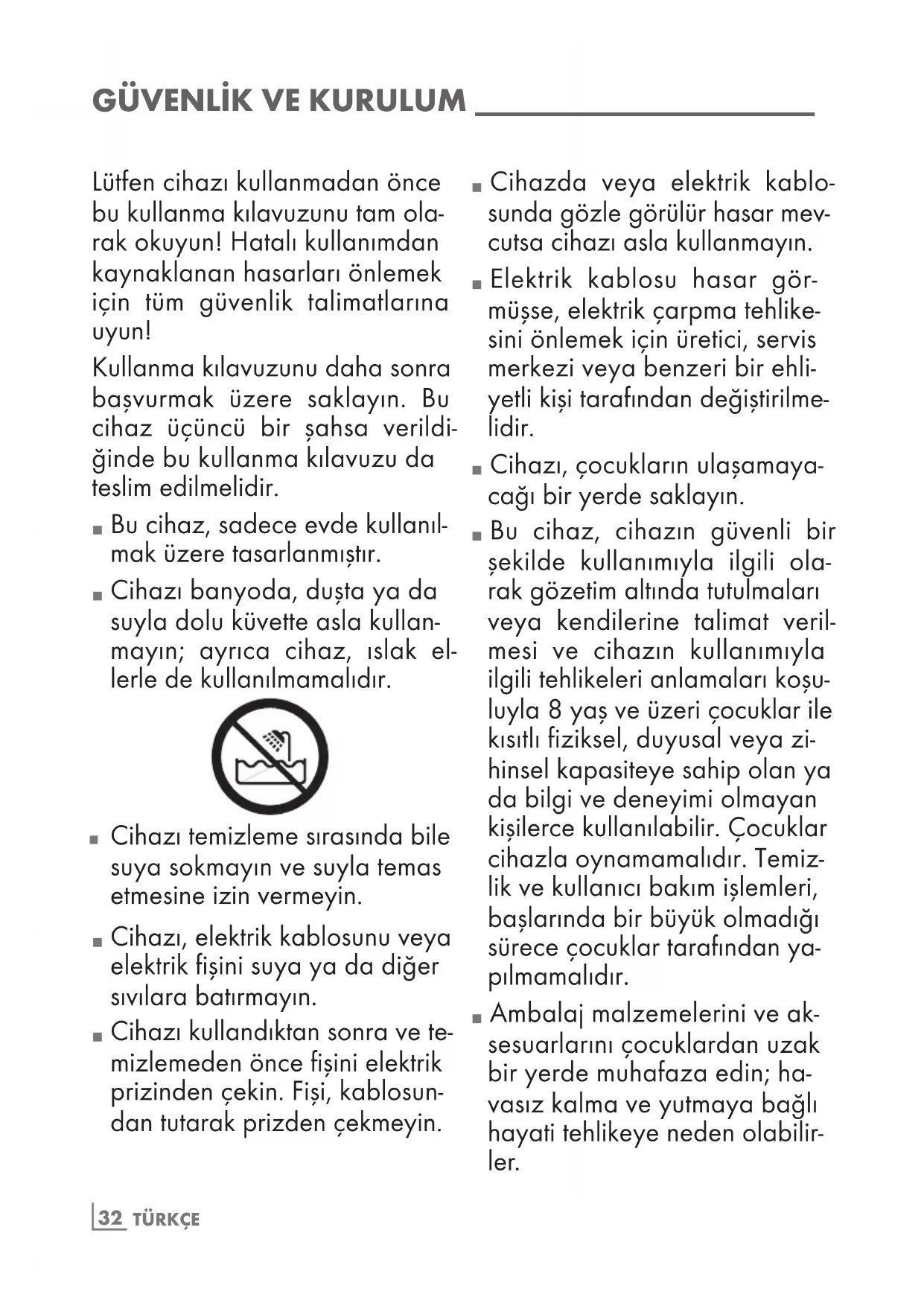 Lütfen cihazı kullanmadan önce bu kullanma kılavuzunu tam ola- rak okuyun! Hatalı kullanımdan kaynaklanan hasarları önlemek için tüm güvenlik talimatlarına uyun! Kullanma kılavuzunu daha sonra başvurmak üzere saklayın. Bu cihaz üçüncü bir şahsa verildi- ğinde bu kullanma kılavuzu da teslim edilmelidir. 7 Bu cihaz, sadece evde kullanıl- mak üzere tasarlanmıştır. 7 Cihazı banyoda, duşta ya da suyla dolu küvette asla kullan- mayın; ayrıca cihaz, ıslak el- lerle de kullanılmamalıdır.